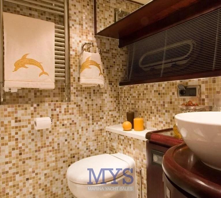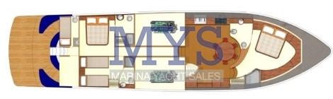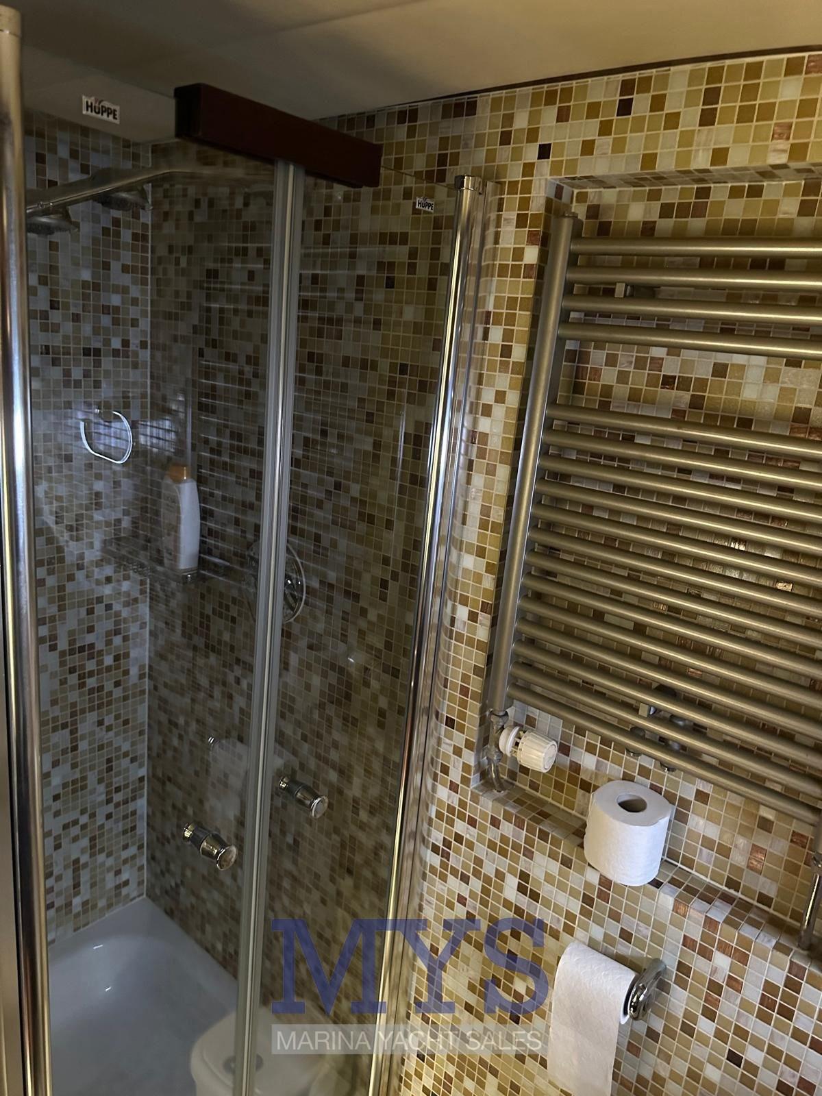Master cabin going down the steps forward with bathroom with bidet and separate shower cabin, VIP guest cabin with double bed aft, cabin with 2 separate beds on the floor plus 1 pullman bed, 3 bathrooms, Crew accommodation with separate access from the aft platform with bathroom.