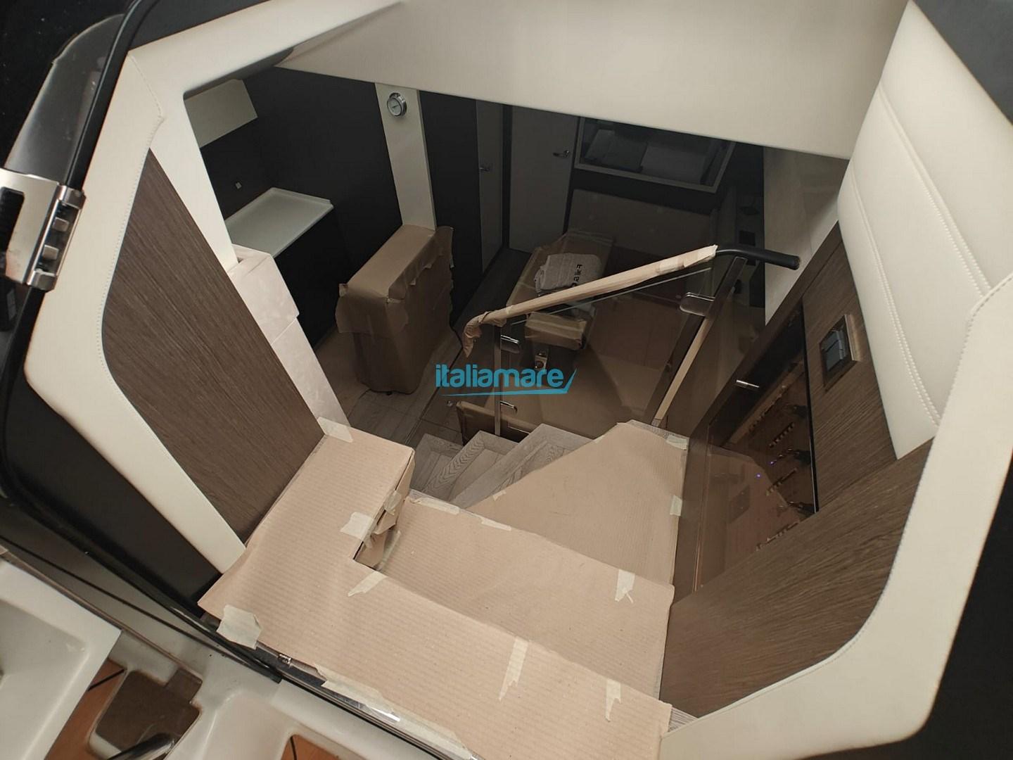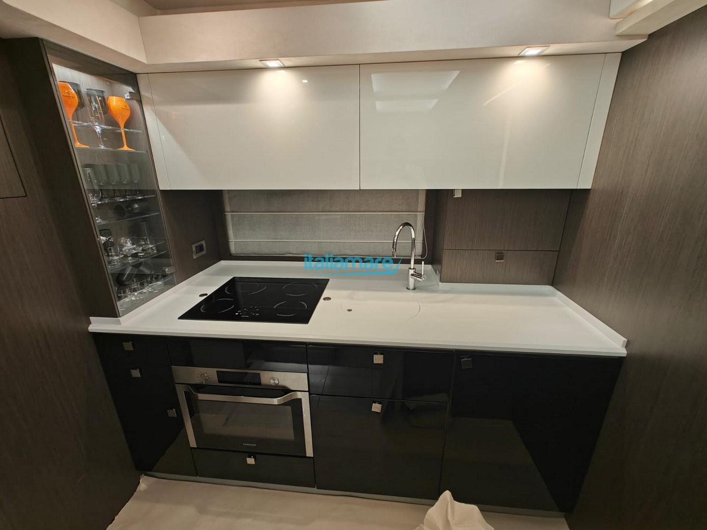 The lower saloon is an airy and well-lit environment thanks to the wide descent, which houses a dinette/dining area and a well-equipped and capacious galley.