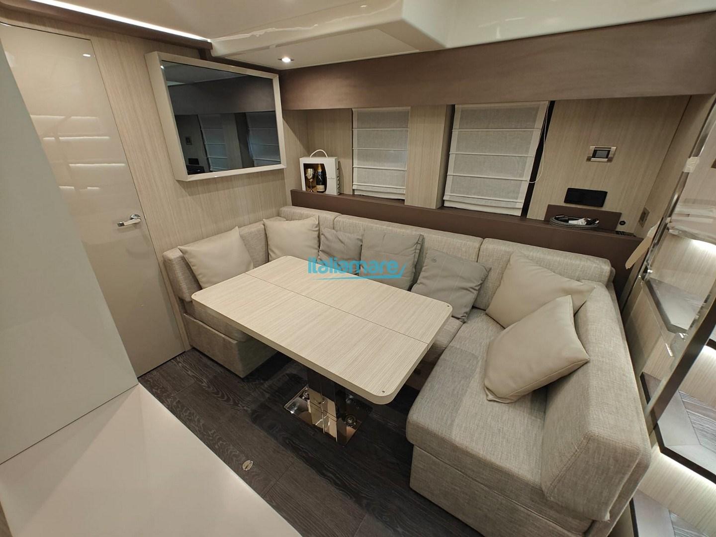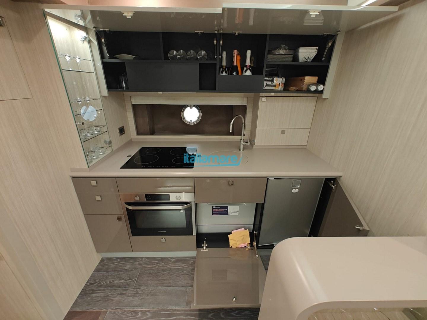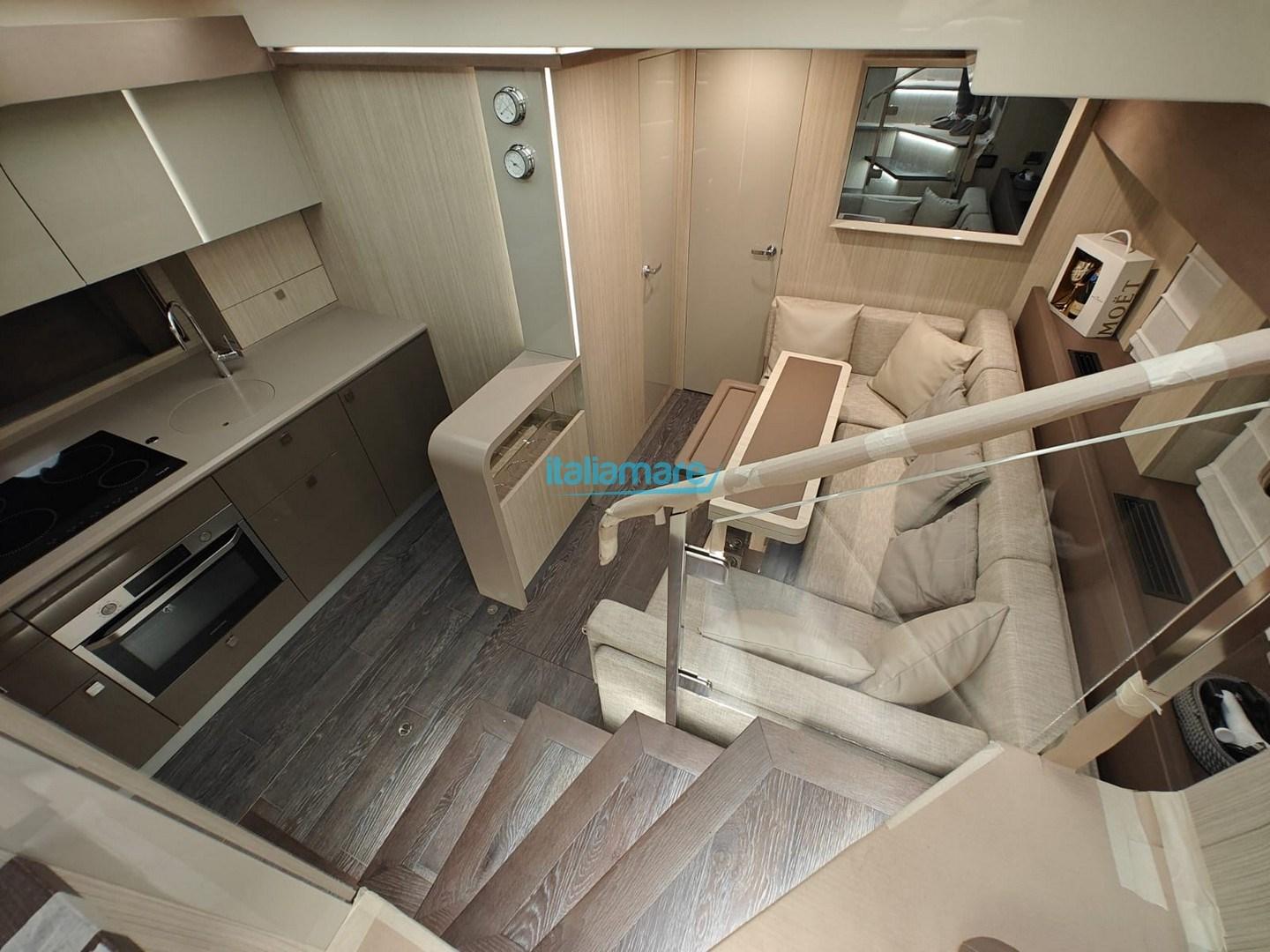 The interiors are characterized by a great attention to materials, featuring modern finishes and a high level of personalization. The saloon, located just below deck, is an airy and well-lit environment thanks to large hull windows. It hosts the main dinette and the galley.