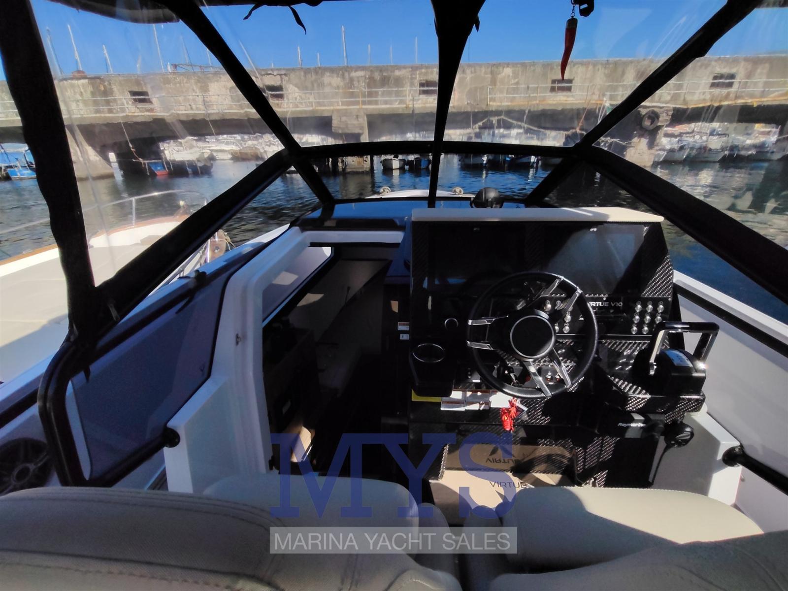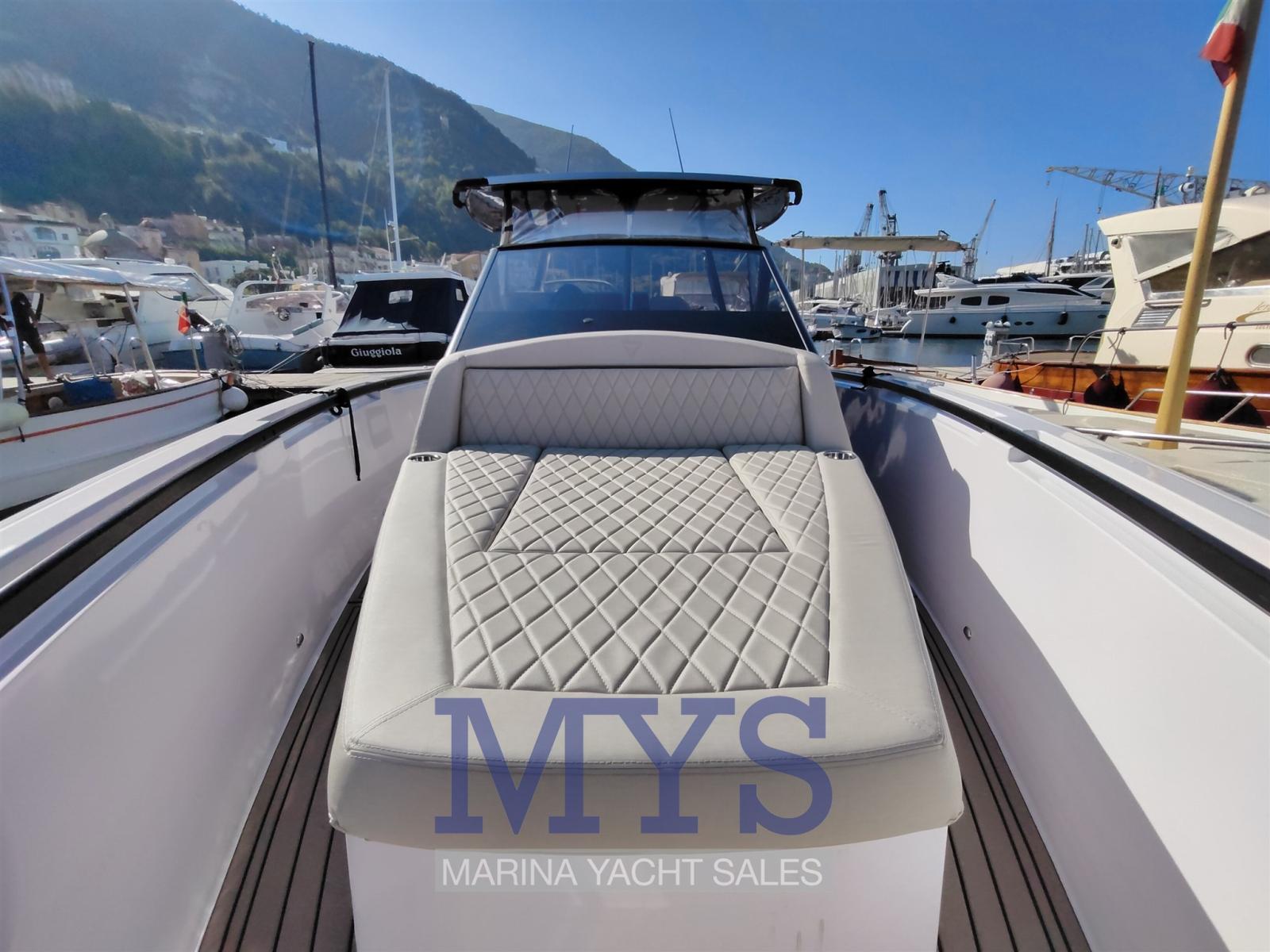 Engine Alarm, Bilge Alarm, Electric Engine Compartment Opening, Water pressure pump, Folding cleats, Teak Side Decks, Deck Shower, Hydraulic Flaps, Fire Extinguishing System, Washbasin in the cockpit, Courtesy Lights, Entry door, Teak Cockpit, Shorepower connector, Electric Windlass, cockpit table, Living Room Foldable Table (esterno), guard rails with gates, T-Top.