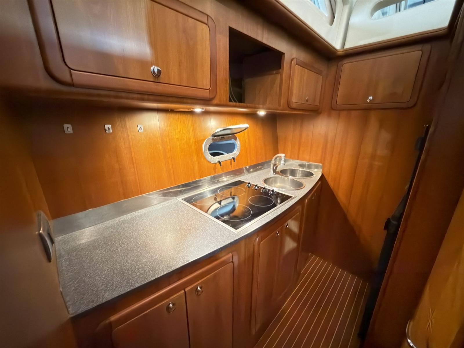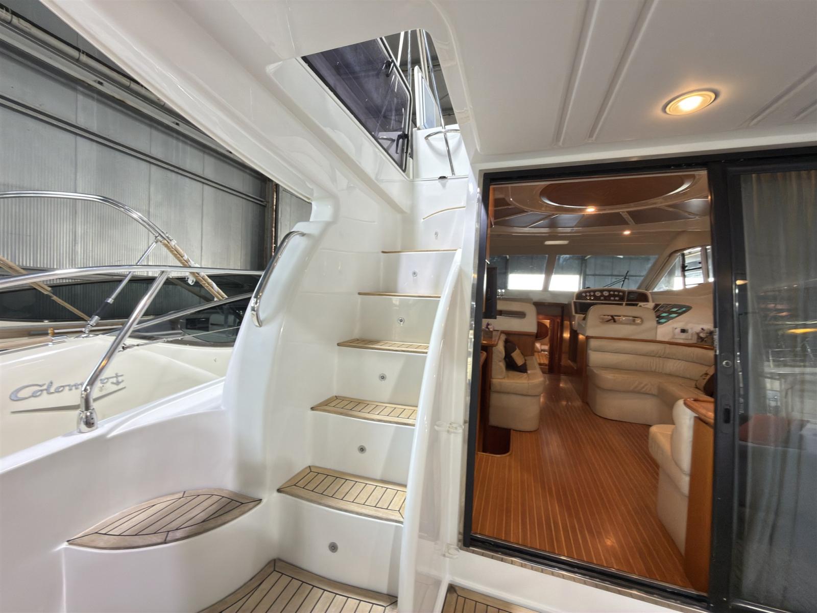 Engine Alarm, Bilge Alarm, Water pressure pump, Deck Shower, Stern Thruster (Maxpower), Directional Spotlight, Fire Extinguishing System, Flaps Indicators, Anchor Chain Washdown, Courtesy Lights, Gangway (idraulica), Platform (con fondo in teak), Automatic Bilge Pump, Manual Bilge Pump, Teak Cockpit, Shorepower connector, Electric Windlass, swimming ladder, Stern Winches, Bow Winches.