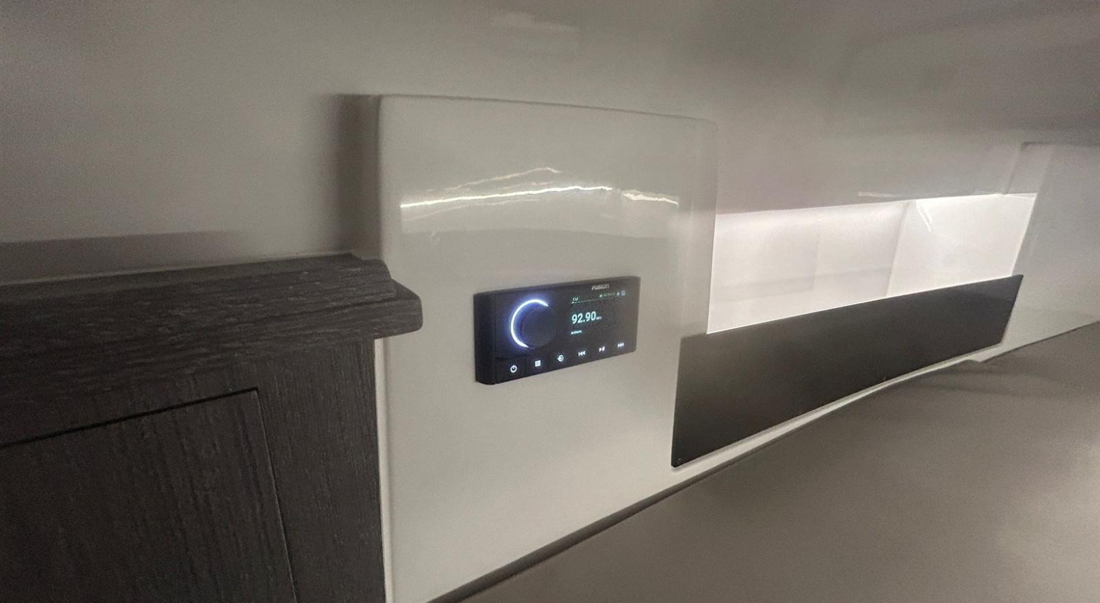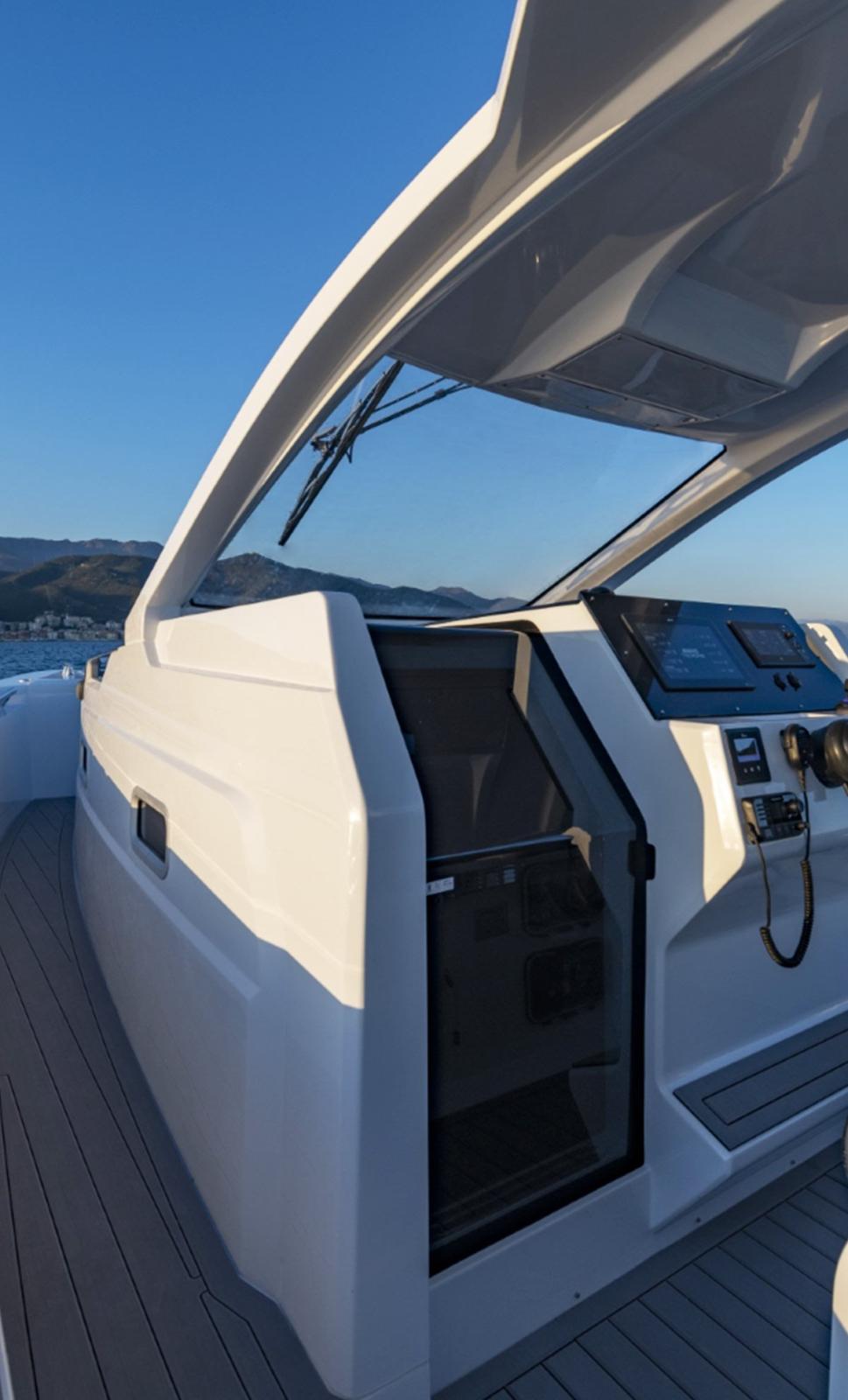 Engine Alarm, Alternator, Electric Engine Compartment Opening, Water pressure pump, Folding cleats, Shore power cable, Deck Shower, Washbasin in the cockpit, Courtesy Lights, Underwater lights, Automatic Bilge Pump, Shorepower connector, Electric Windlass, swimming ladder, cockpit table, Horn.