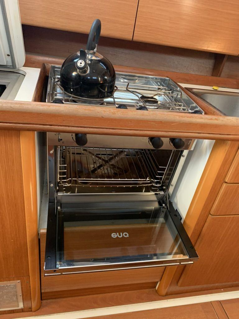 Kitchen block including a work counter, ENO (2023) stove oven, refrigerator, hot/cold pressurized water with water heater, various storage. Water capacity 300l.