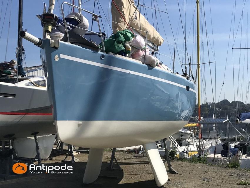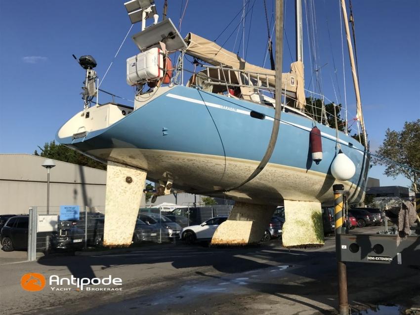 UNIVERSAL YACHTING 40, 2001, NANNI 4220 HE, 50 hp (1850 hrs), Short roof version, Hull and deck paint 2018, Interior layout version 1 forward cabin, 2 aft cabins, 1 heads (toilets + shower), Roof windows 2018, Stern pulpit deck support, Teak cockpit seats, Tiller + extension, Cockpit sprayhood - 2011, Sun awning, Electric windlass, Outboard engine bracket, Deck stepped aluminium mast and boom, Mast steps 2025, Stainless steel cable standing rigging - 2013, Full batten main sail Dacron 3 reefs - 2017, Main sail mast track + batten cars - Facnor 2013, Genoa roller furling with above deck drum - Profurl, Furling genoa - 2017, Releasable baby-stay and hardware, Jib for releasable baby stay, Aluminium spinnaker pole (mast storage system), Spinnaker + snuffer - 110 m2 / sqm, Furlable gennaker - 90 m2 / sqm, Raymarine in board autopilot, Raymarine ST 60 navigation system, Radar with radome radar fitted on mast - Furuno, AIS Transponder CLASS B (emission and reception), VHF at chart table, Handheld VHF, Fridge unit 12 V (top opening door), Hot and cold pressurized water, 2 burners cooker + oven, 220 V shore power + battery charger, Engine battery - 2025, Service batteries X 3 2025, WEBASTO heating system, LAVAC toilets 2015, Liferaft - 2018, Dinghy, Outboard engine - Honda 2.5, Located Brittany. For more information or to make an appointment for a visit, contact : Jérôme Le Joubioux +33 6 07 45 71 73 - jerome@antipode-yachts.com