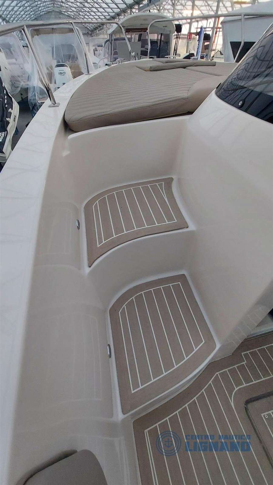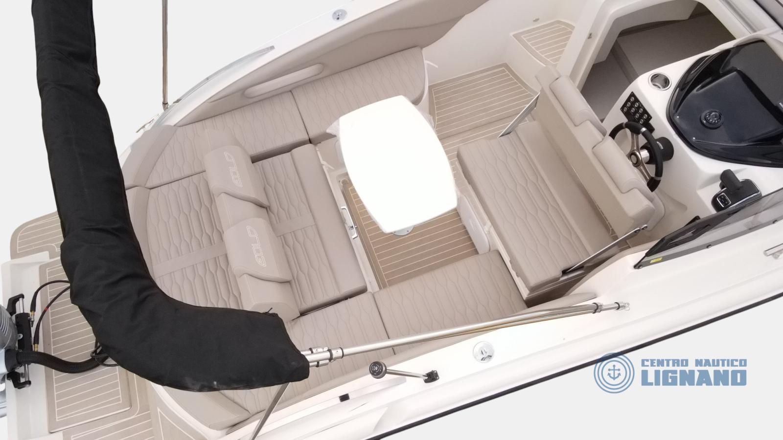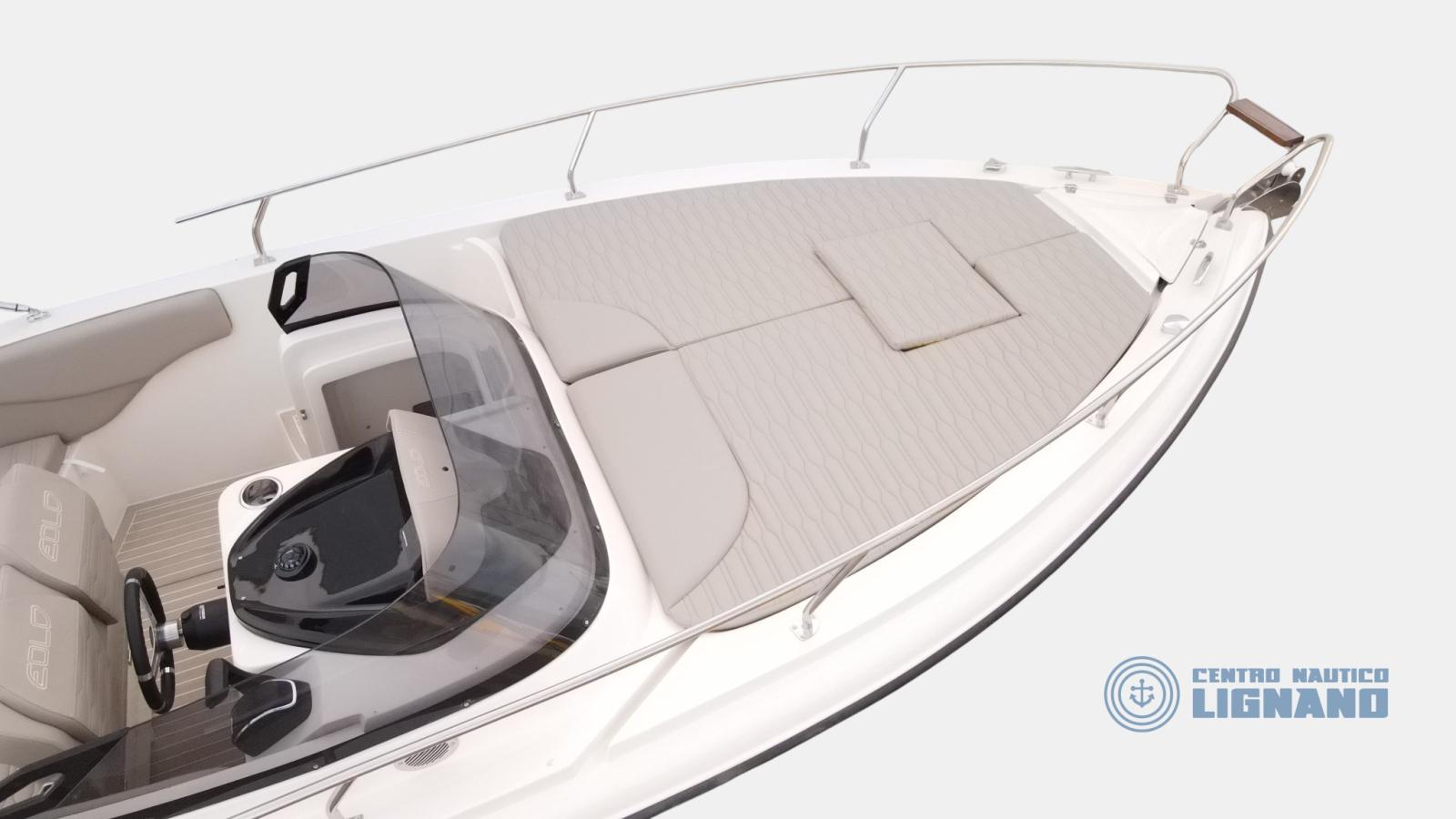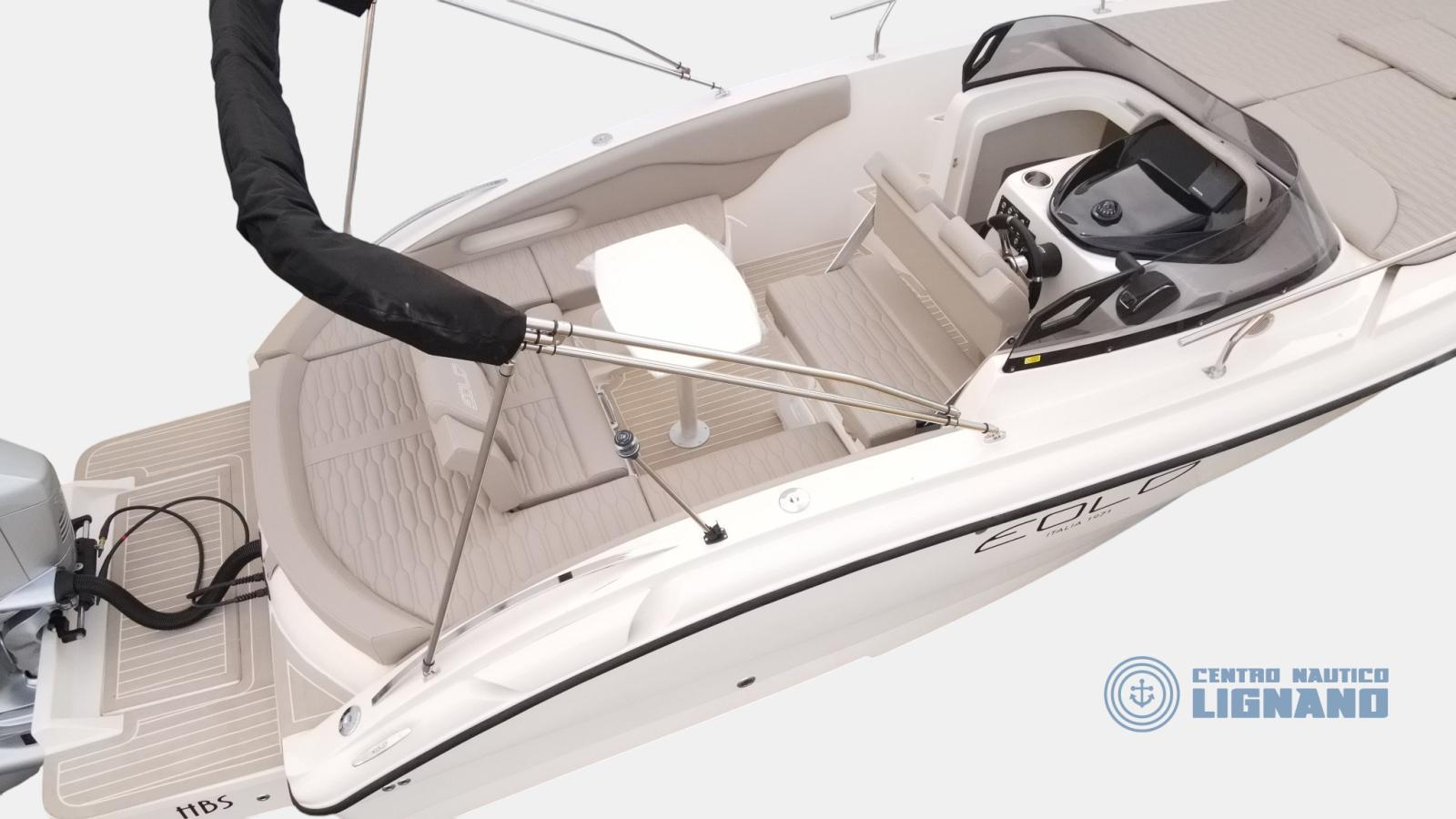 Eolo Marine 730 Day Hbs new 2026 immediately ready for delivery at Centro Nautico Lignano complete with Honda Marine BF250 V6 engine 2026 edition new silver color. All new under warranty, technical characteristics overall length 7.30 meters by width 2.54 meters, weight about 1,600 kg, passenger capacity 7 + 1, CE-C category, 2 beds. White hull color and complete luxury beige exterior cushions with Lamborghini texture. Accessories included: 49 lt cockpit fridge, 45 lt water and shower system, 4-arch stainless steel awning, flexiteek platform, steps and cockpit