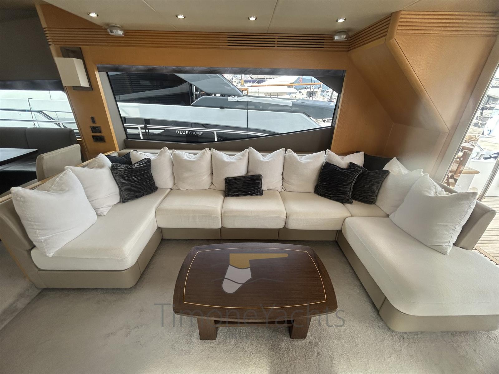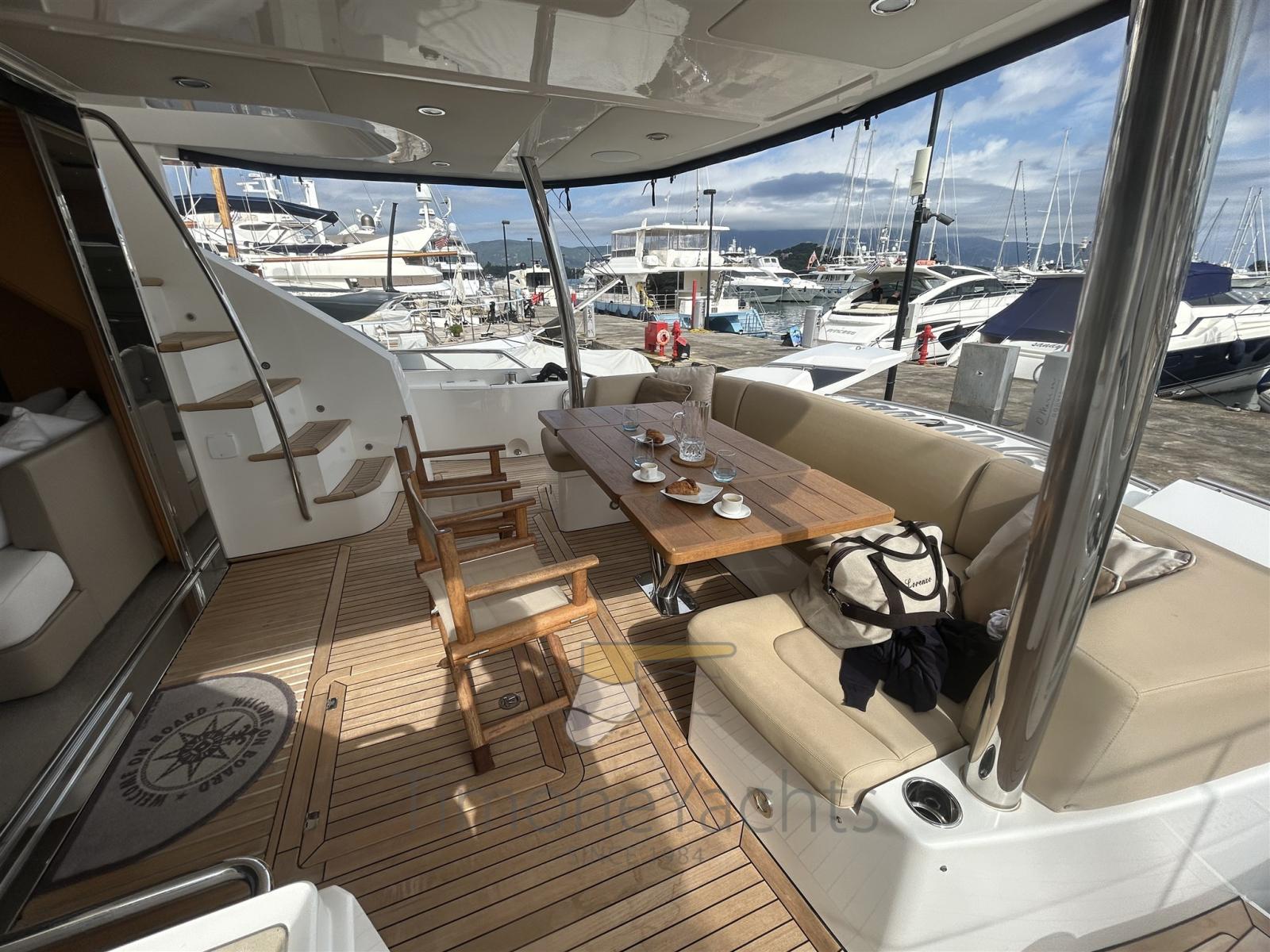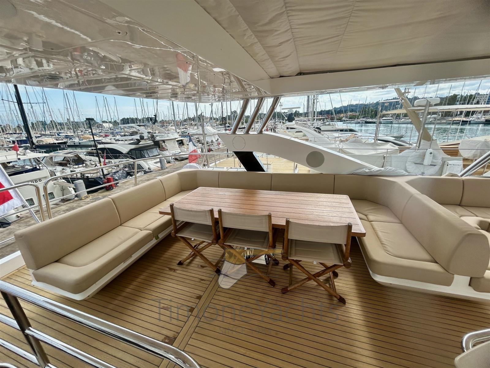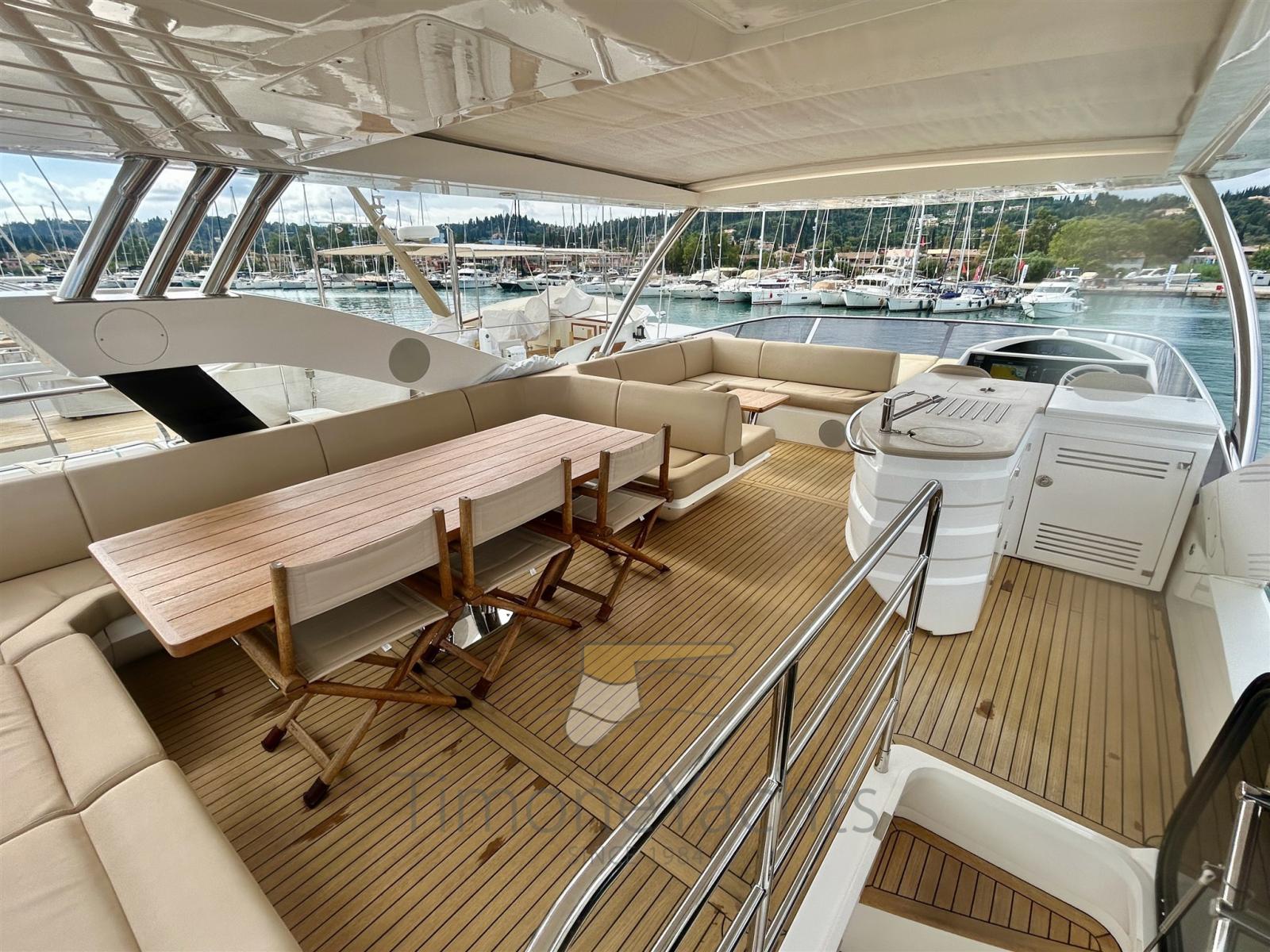 Teak Side Decks, Shore power cable, Deck Shower, Directional Spotlight, Hydraulic Flaps, Hard top, Fire Extinguishing System, Flaps Indicators, Anchor Chain Washdown, Courtesy Lights, Underwater lights, Gangway, Teak deck, Side door, Teak Cockpit, Stabilizers (Side Power fins (underway + zero speed)), cockpit table, Tender (Sur Marine ST 400 + Yamaha F40 (both new 2015)), Horn, Stern Winches, Bow Winches.