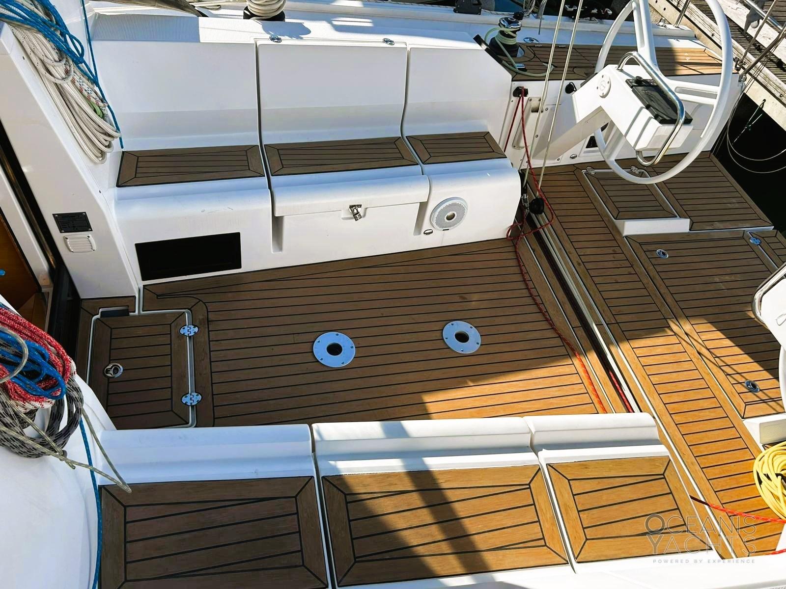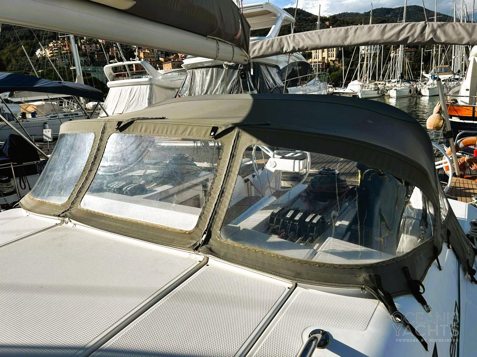Engine Alarm, Bilge Alarm, Alternator, Anchor (maggiorata), Water pressure pump, 6 Batteries, Shore power cable, Deck Shower (caldo/freddo), Courtesy Lights, Fenders, Automatic Bilge Pump, Manual Bilge Pump, Entry door, Teak Cockpit (sintetico), Shorepower connector, Electric Windlass, Strand rigging (chiuso, trafilato), swimming ladder, Outboard Engine Support Bracket, cockpit table, Windex.