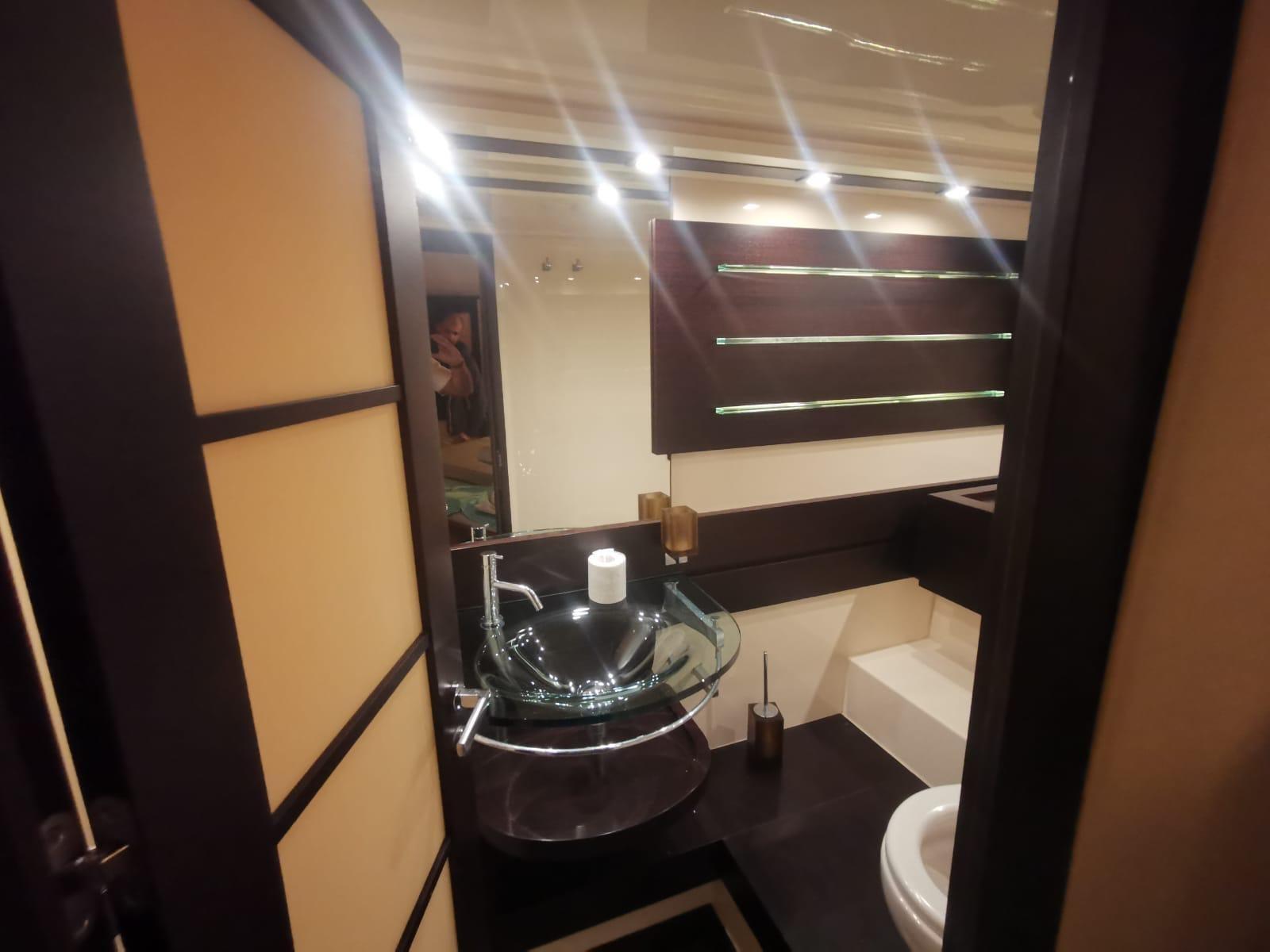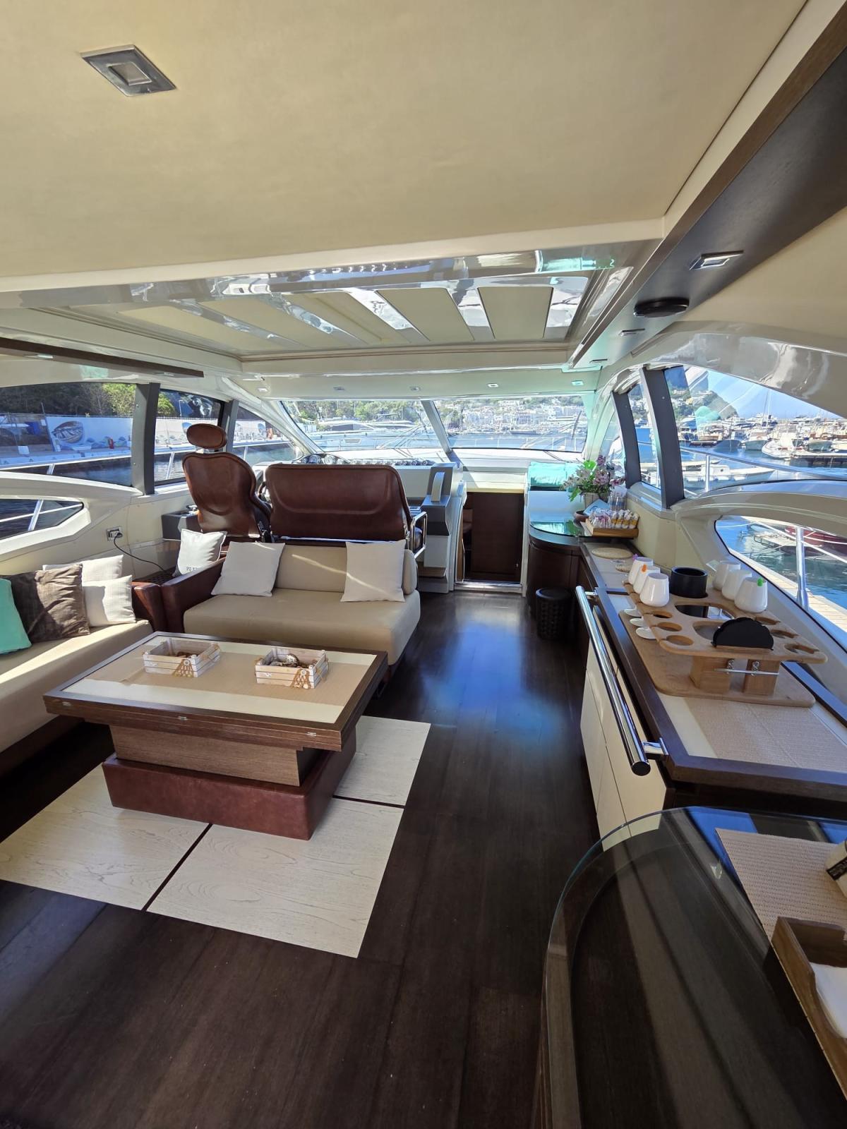 Engine Alarm, Bilge Alarm, Alternator, Water pressure pump, Teak Side Decks, Deck Shower, Hydraulic Flaps, Hard top, Fire Extinguishing System, Flaps Indicators, Washbasin in the cockpit, Underwater lights, Gangway, Platform, Automatic Bilge Pump, Manual Bilge Pump, Teak deck, Entry door, Teak Cockpit, Shorepower connector, Water harbor connector system, Voltage Rectifier, Electric Windlass, swimming ladder, Saddles for tender, cockpit table, Stern Winches, Bow Winches.