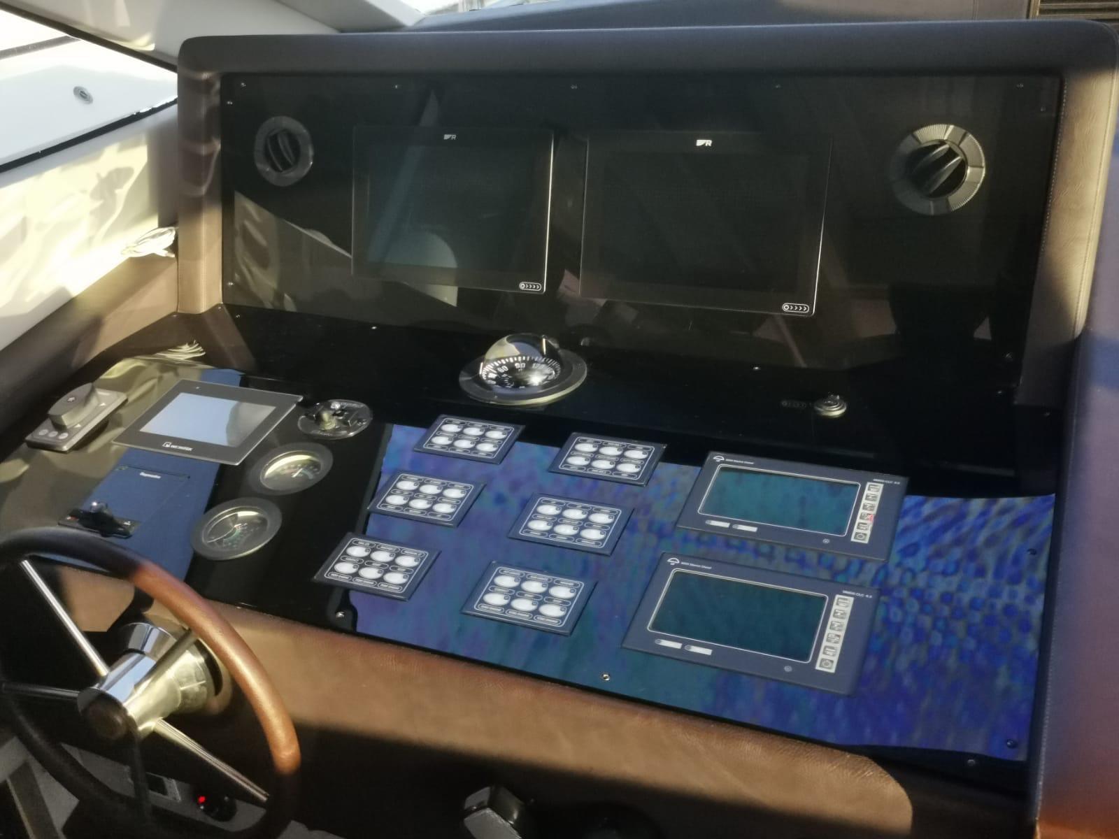 Rudder angle indicator, Radar Antenna, Electronic engine control, On-Board Computer, Chain counter, Display, DSC vhf, Plotter with GPS antenna, Control panel, Co-pilot seat.