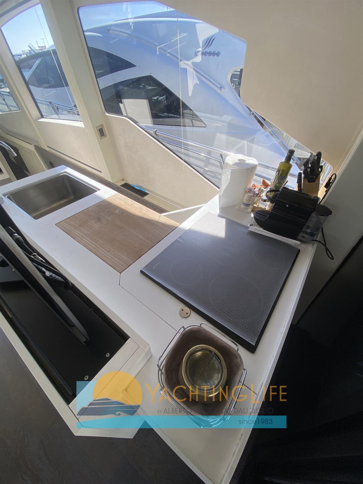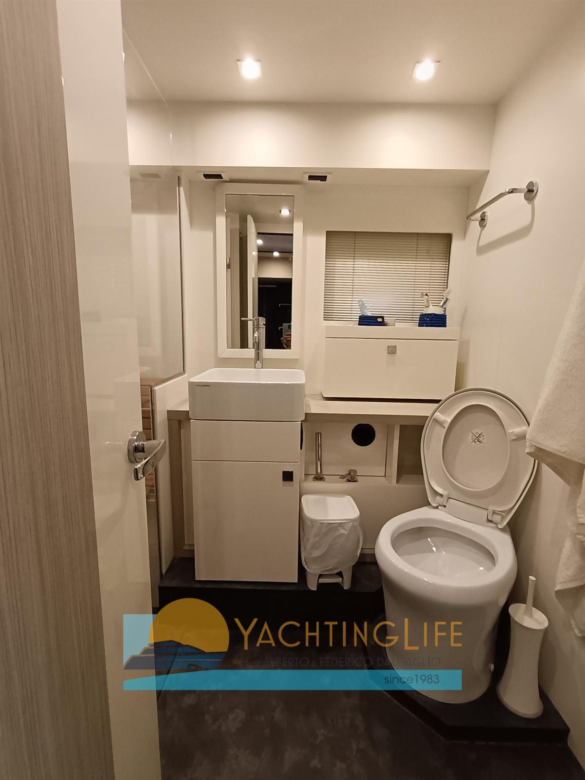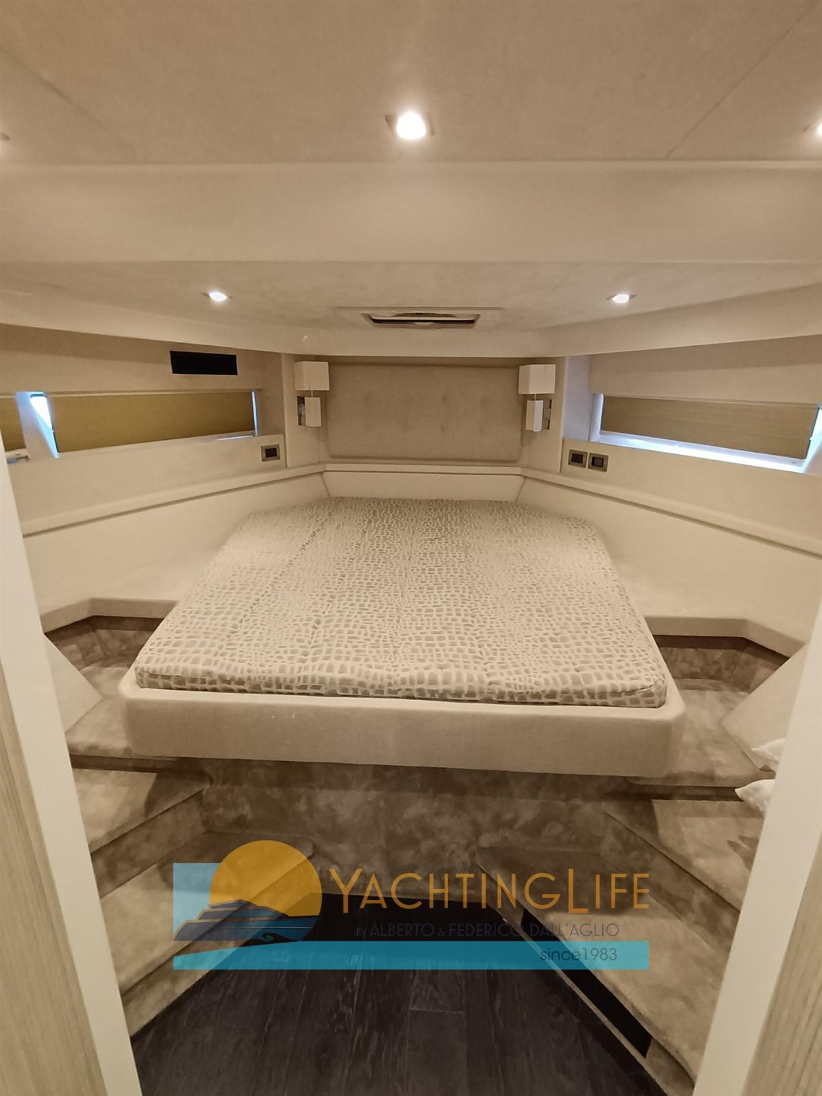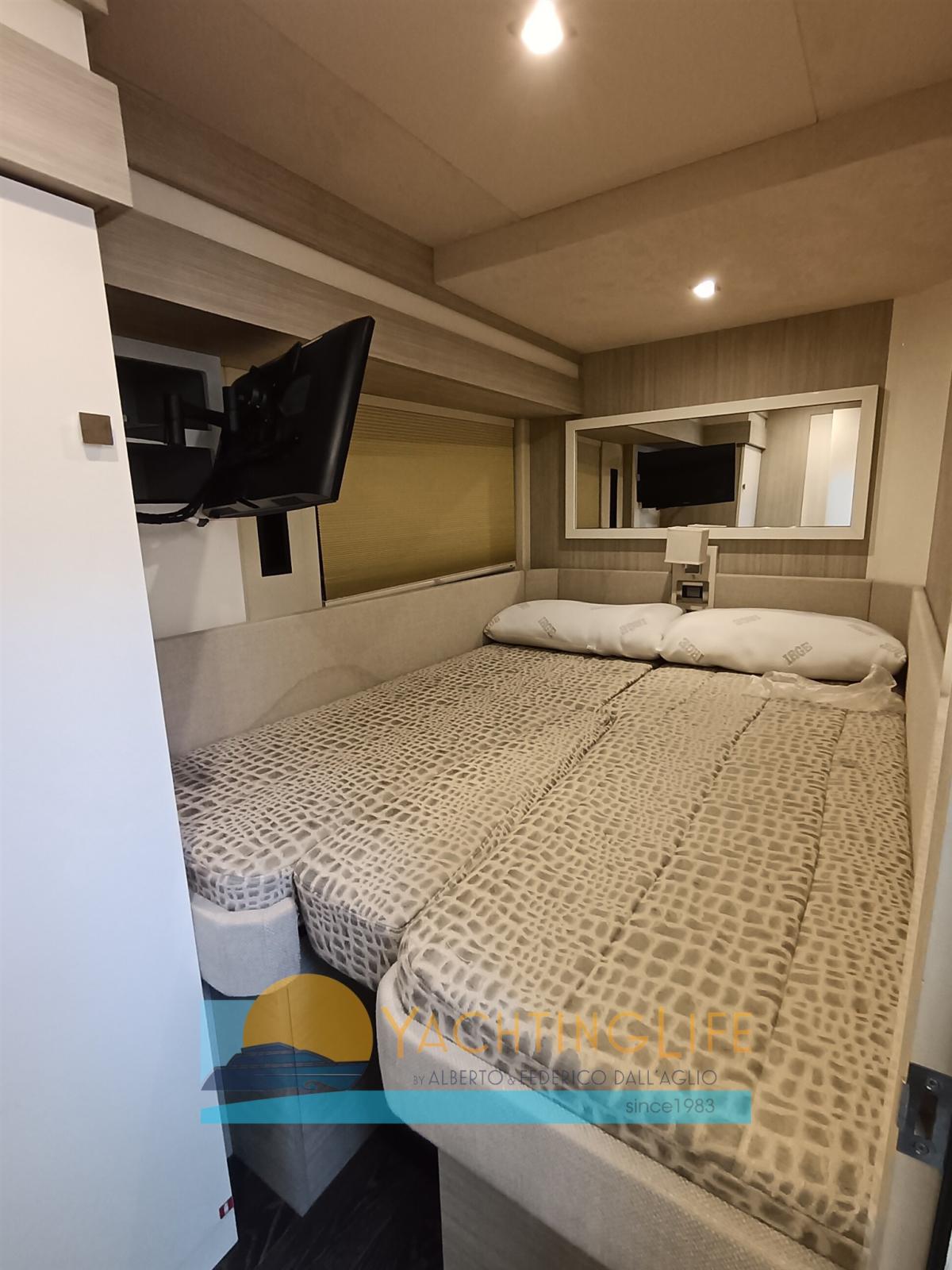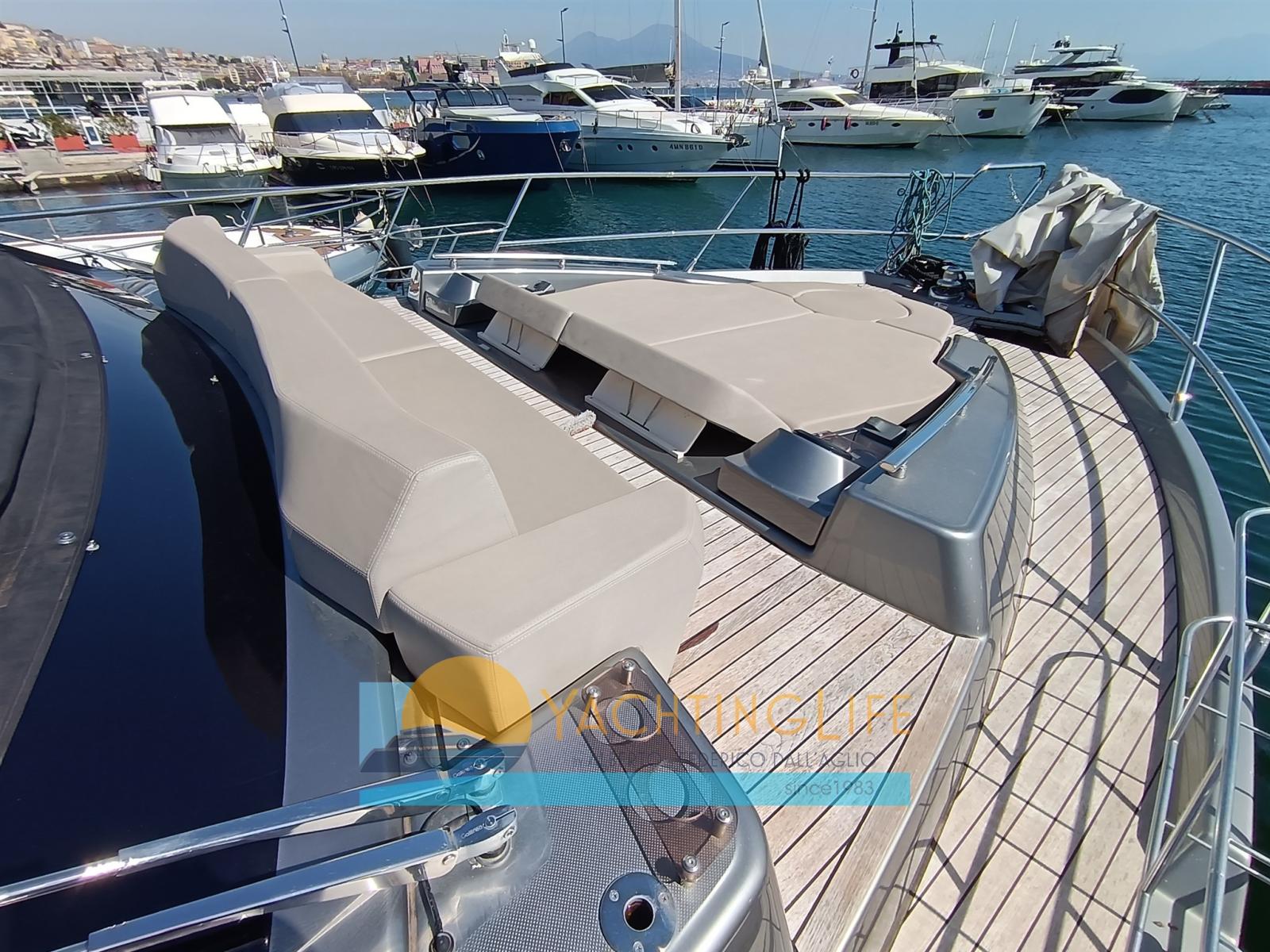 Engine Alarm, Bilge Alarm, Water pressure pump, Teak Side Decks, Special Colour, Deck Shower, Electric Flaps, Hard top, Fire Extinguishing System, Flaps Indicators, Washbasin in the cockpit, Courtesy Lights, Underwater lights, Gangway (idraulica), Platform (idraulica), Automatic Bilge Pump, Entry door, Teak Cockpit, Shorepower connector, Electric Windlass, swimming ladder, cockpit table, Horn, Stern Winches.