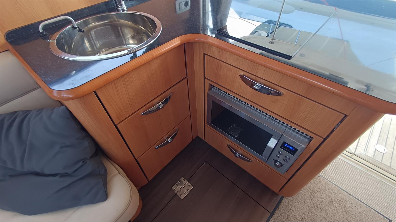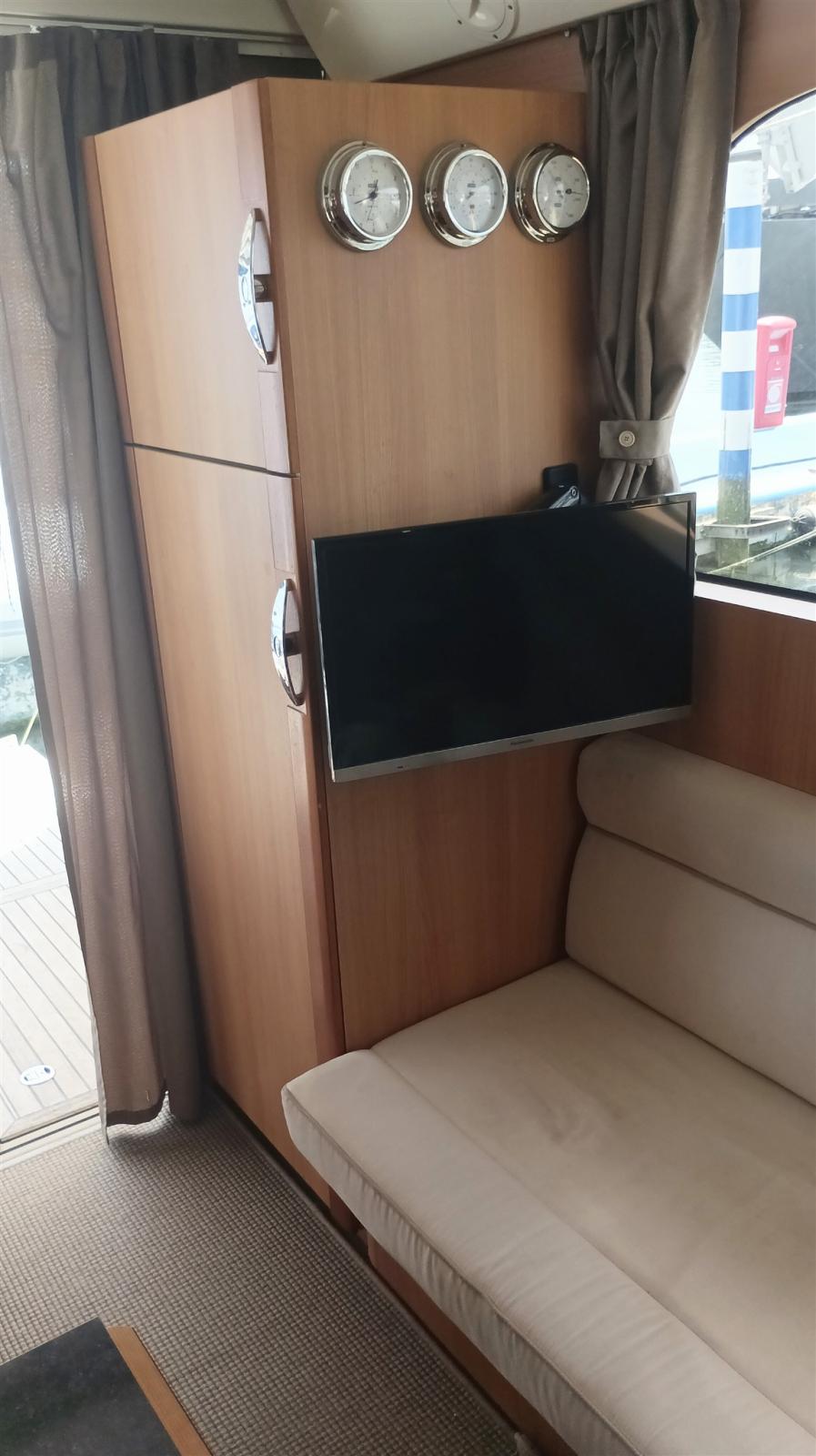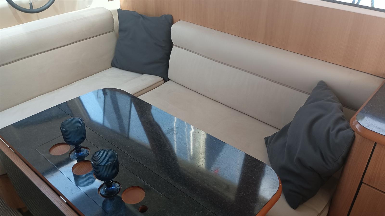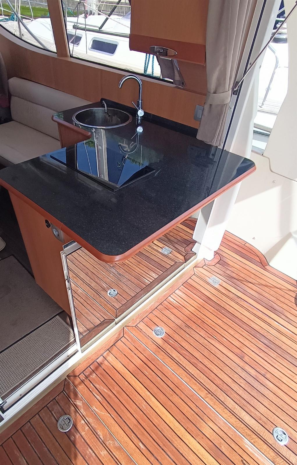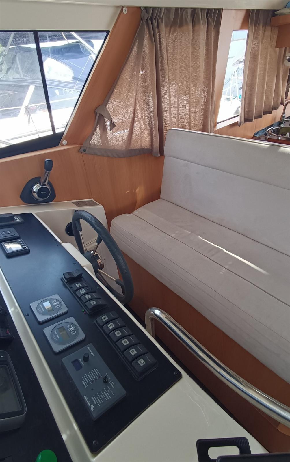 Engine Alarm, Water pressure pump, Batteries (14,6 kW Lithium-Eisenphosphat), Shore power cable, Deck Shower, Hard top, Courtesy Lights, Battery Monitor, Solar panels (x 10, 1,6 kW), Fenders, Gangway, Platform (electr. + remote control), Automatic Bilge Pump, Teak Cockpit, Shorepower connector, Electric Windlass (1.000 W), swimming ladder, Saddles for tender.