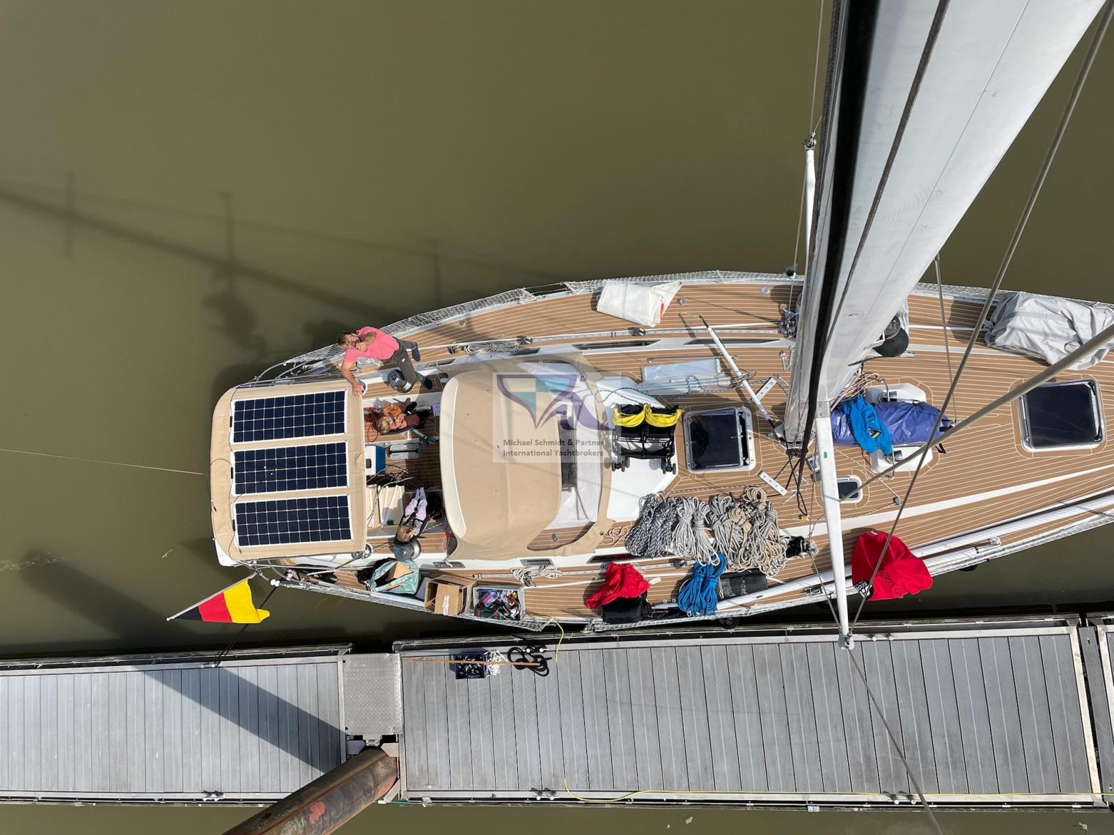 Anchor (Ultra Marine mit 100m Kette Heavy Duty), Water pressure pump, Teak Side Decks (Flexi Teek 2022), Battery charger (mit Balmar XT170 Regler), Deck Shower, 3 Solar panels (Offgrid 160Wmit Victron Kontroller), Automatic Bilge Pump, Teak Cockpit, Shorepower connector, Electric Windlass, Rod rigging (neu 2019), swimming ladder, Outboard Engine Support Bracket, cockpit table, guard rails with gates, Windex.