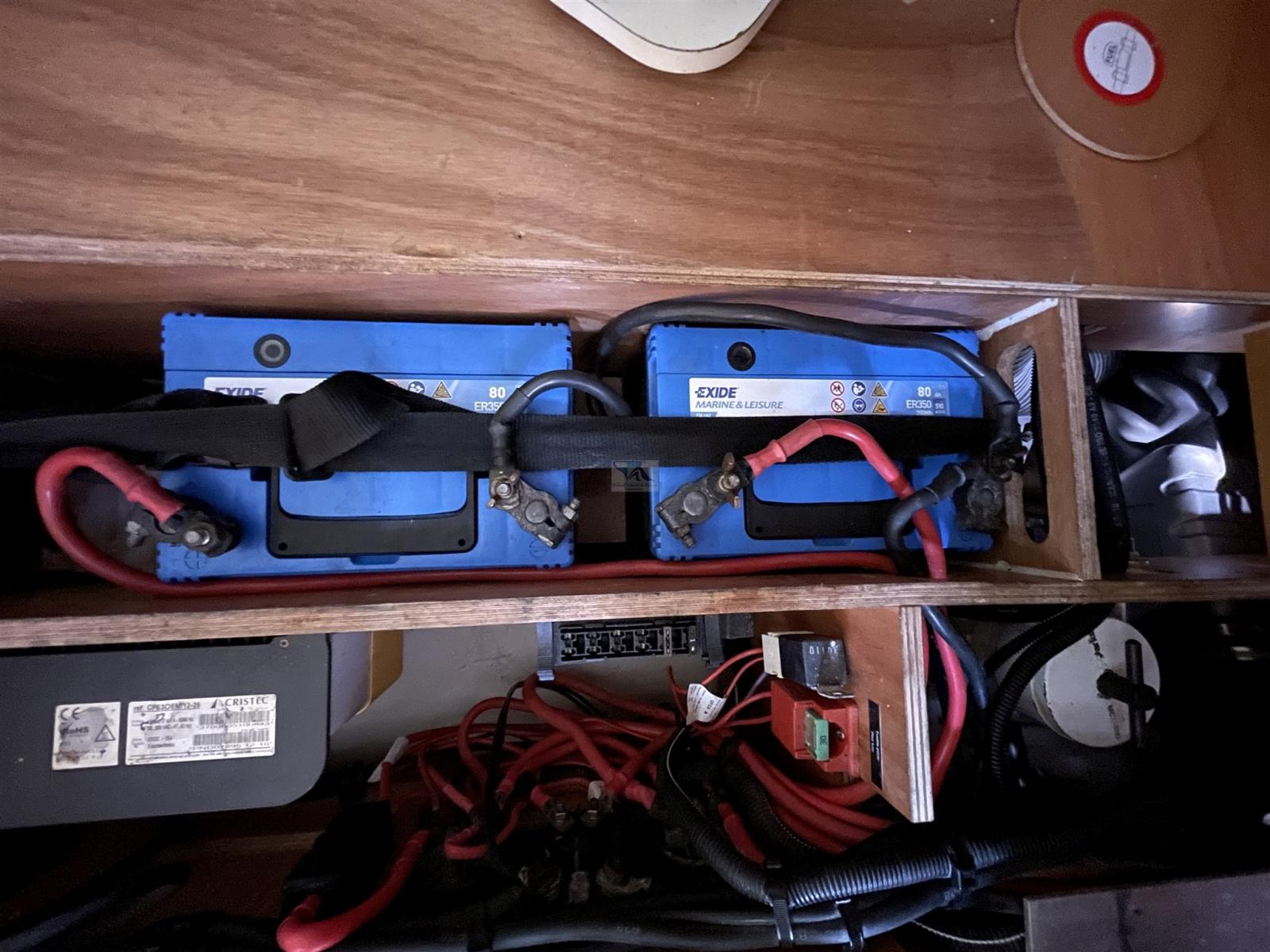 Water pressure pump, 3 Batteries (1x 12V 70 Ah, 2 x 70 Ah), Deck Shower, Directional Spotlight, Platform, Automatic Bilge Pump, Manual Bilge Pump, Shorepower connector (220V), Water harbor connector system, Electric Windlass, Gang Board, swimming ladder, Outboard Engine Support Bracket, cockpit table, Tender (für 4 Pers. mit Außenborder), 2 guard rails with gates, Horn, 3 Winch (1 und 2 x Genua, Harken), Windex.