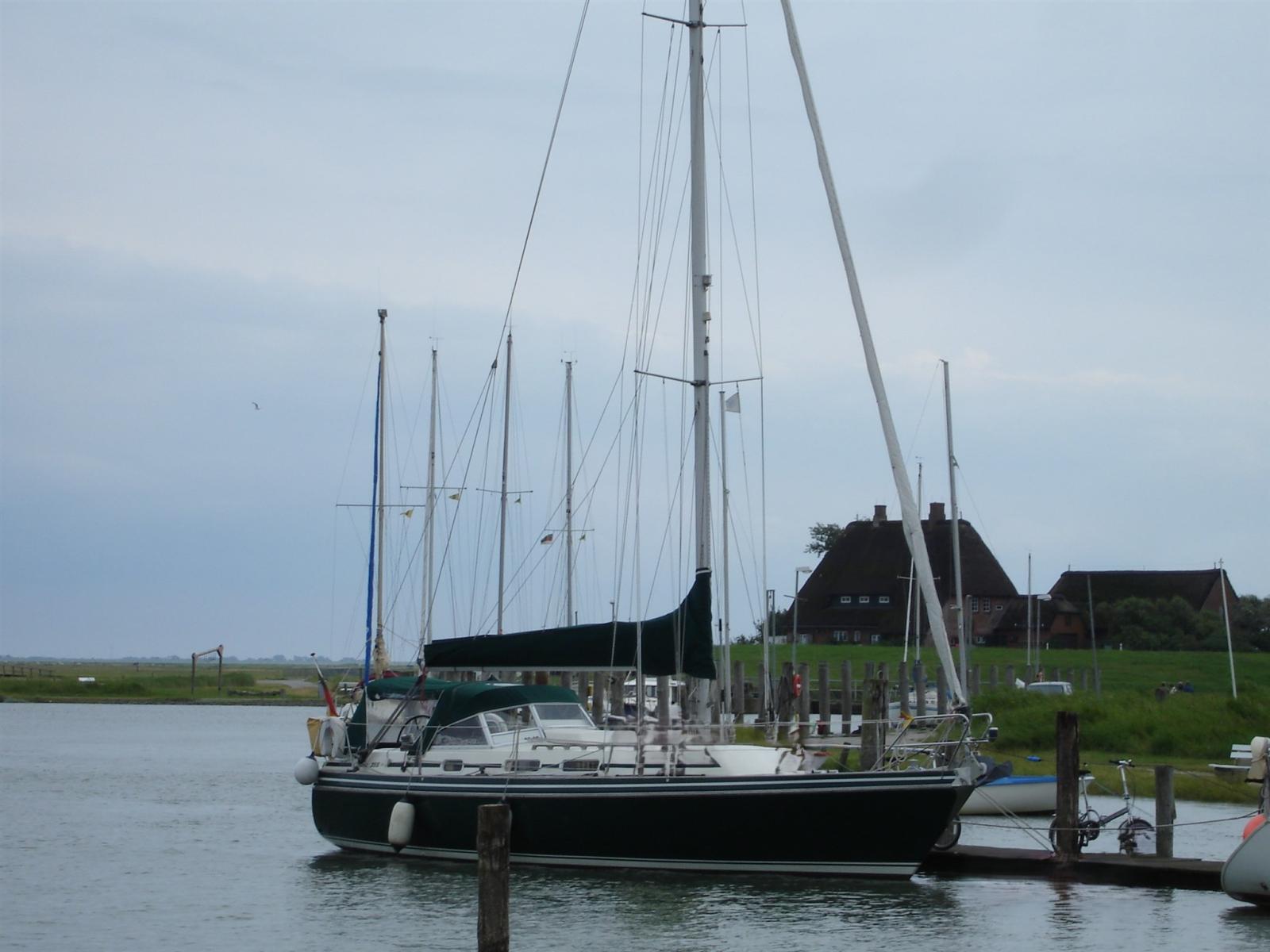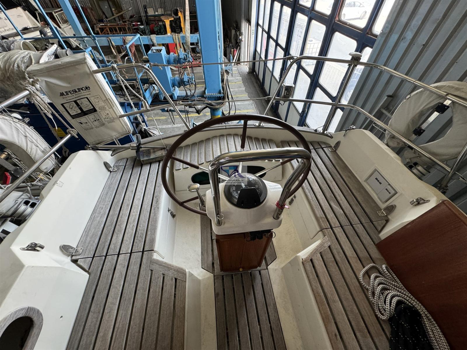 Anchor (Delta), Electric cable reel, 3 Batteries (Vetus, insgesamt 330 Ah), Teak Side Decks, Battery charger (Victron 25A), Manual Bilge Pump, Teak Cockpit, Shorepower connector, Water harbor connector system, Electric Windlass (Maxwell vert.Ankerwinde mit Spill, RC10-8), swimming ladder, cockpit table, 2 guard rails with gates, Teak Deckhouse, Bow Winches, Windex.