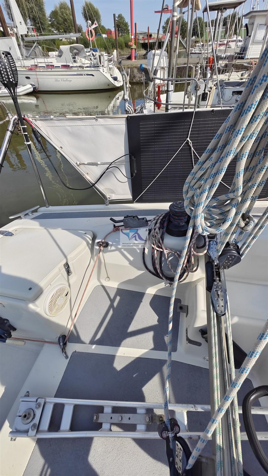 2 Anchor (Racner und Flugchar), Water pressure pump, Electric cable reel, 3 Batteries (2 x 100 Ah, Starter 45 Ah), Battery charger (Vetron), Deck Shower, Fire Extinguishing System, Courtesy Lights (im Salon und Navi), Shorepower connector, 6 Winch, Windex.