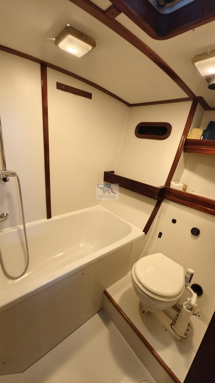 Up to 6 berths and a toilet room with bathtub! In addition, there are many and large storage options. In the foreship is a walk-in sail load with full collision bulkhead made of aluminum to the cabin.