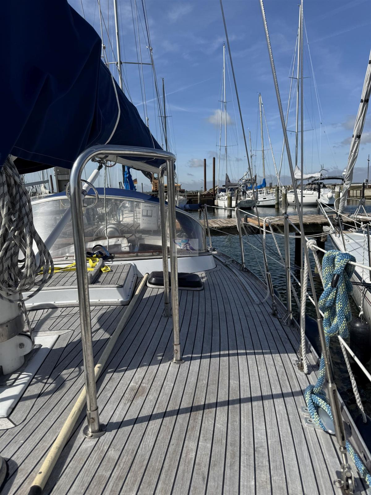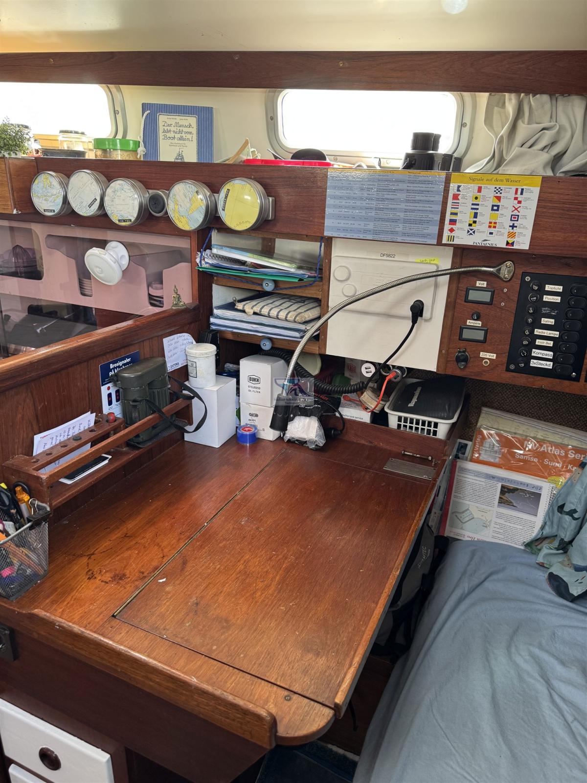 Fume/Gas Detector (Gasspürgerät), Anchor (und 30m Kette), Water pressure pump, 2 Batteries (Exide Dual AGM 180 Ah EP1500 - Neu 2023), Battery charger (Voltmaster), Teak Cockpit, Shorepower connector (Landstromsteckdose Neu), Manual Windlass (Lofrans Royal 005808), Strand rigging (Neu 2016), swimming ladder, cockpit table.