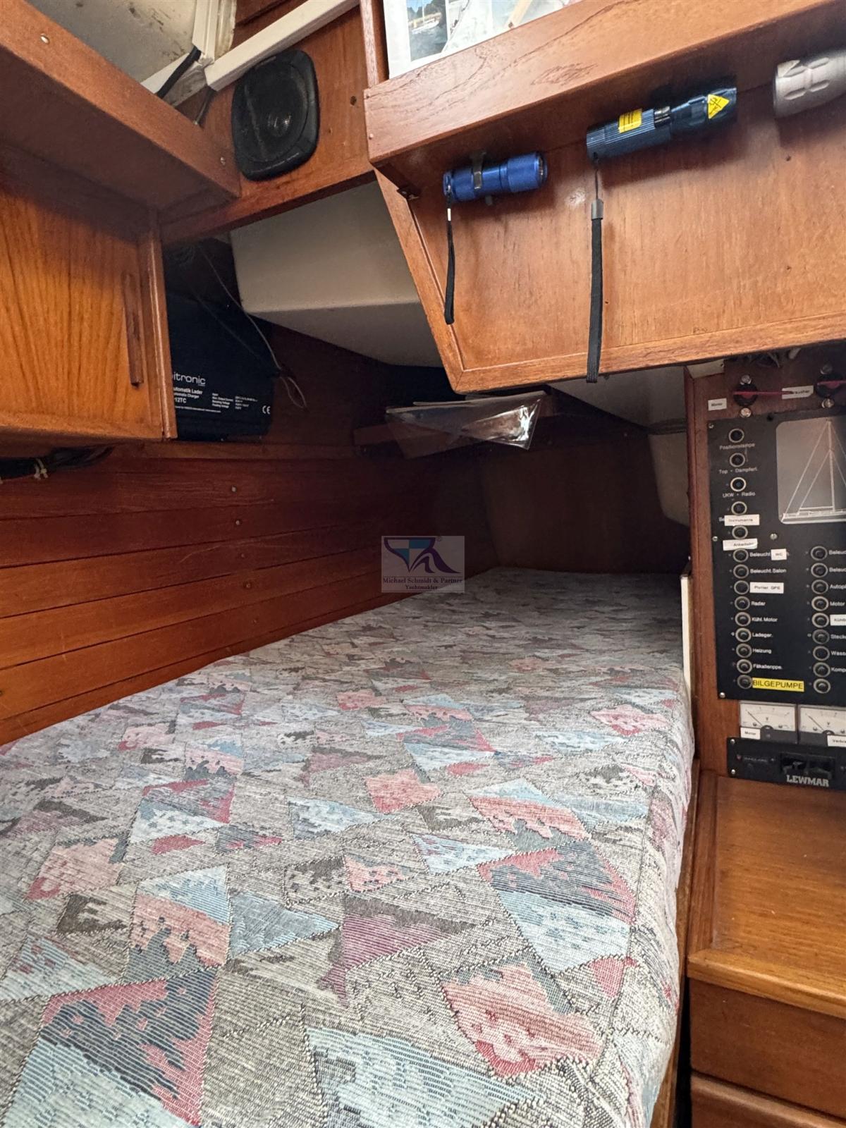 Anchor (16 kg Pflugschar mit Kette 30m, 8mm), 3 Batteries (Starter 90Ah aus 2016, 2 x Verbraucher á 90 Ah Neu 2023), Battery charger (Waeco), Platform, Electric Windlass (Quick DP2 700W, Bedienung an Steuersäule und Ankerkasten, 2016), swimming ladder (und Rettungsleiter).