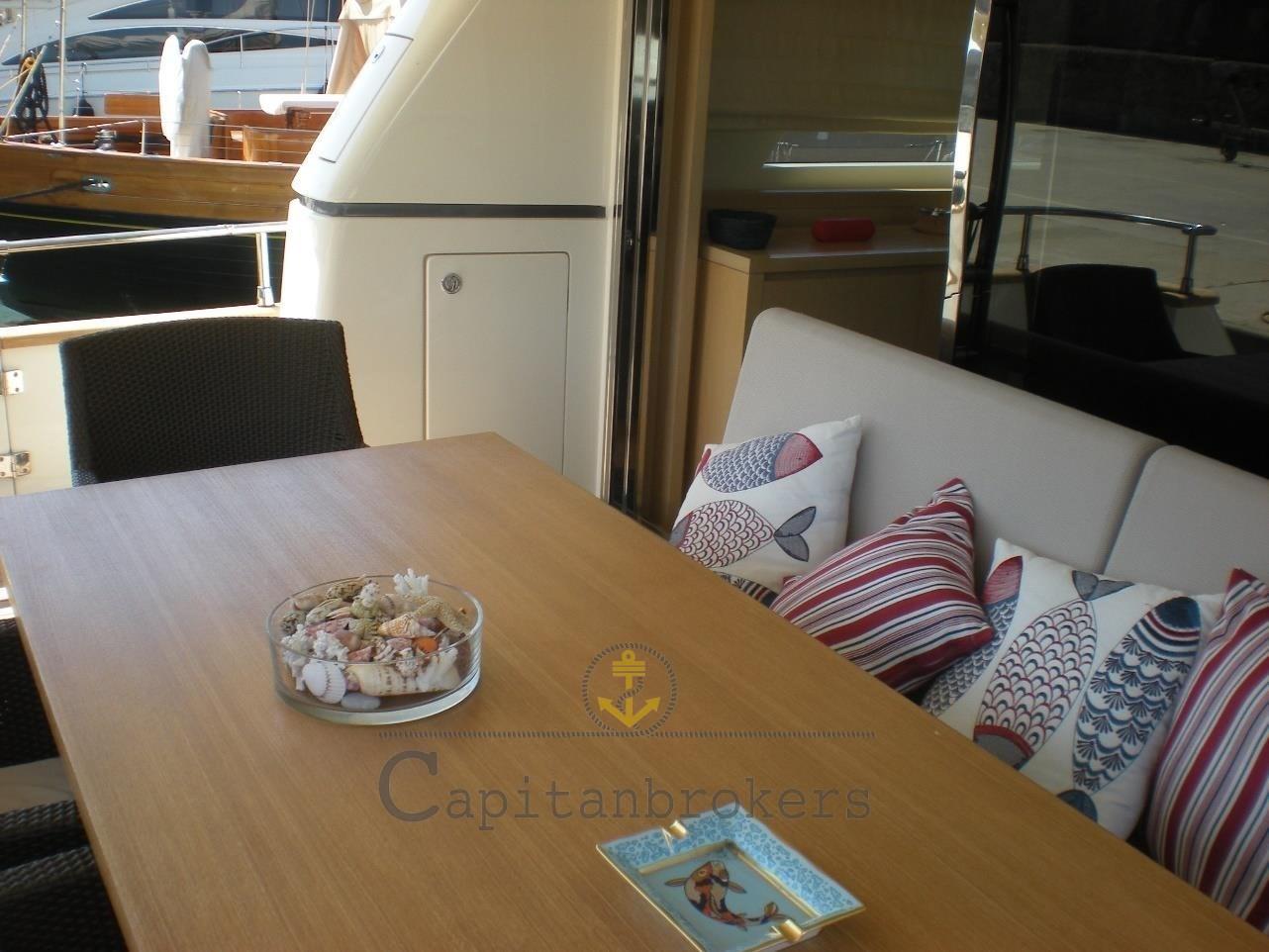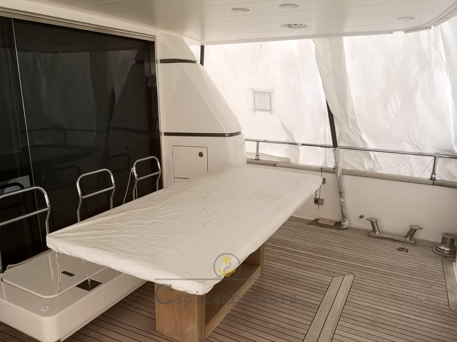 Engine Alarm, Bilge Alarm, Water pressure pump, Deck Shower, Twin Steering, Directional Spotlight, Electric Flaps, Crane, Davits for tender on fly, Fire Extinguishing System, Gangway, Platform, Automatic Bilge Pump, Side door, Teak Cockpit, Shorepower connector, Water harbor connector system, Electric Windlass, swimming ladder, Stabilizers (Pinne stabilizzatrici), cockpit table, Tender, Stern Winches, Bow Winches.