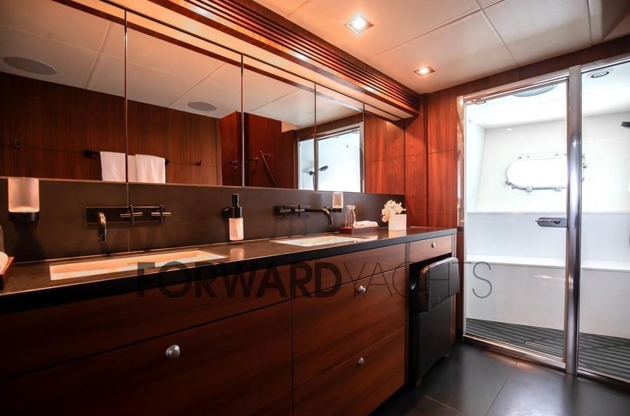 It can comfortably accommodate up to 12 guests in 5 cabins: a large owner's suite forward on the main deck with en-suite bathroom, as well as 2 double cabins and 2 convertible twin cabins with Pullman beds, all equipped with en-suite bathrooms. The crew area has 5 cabins.