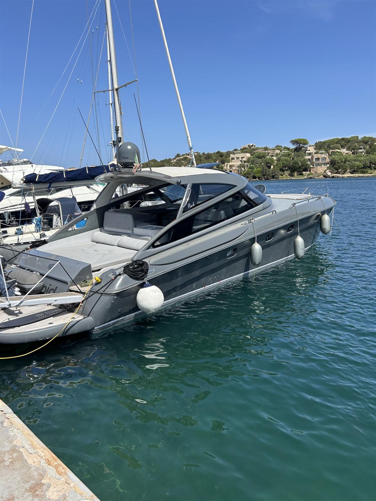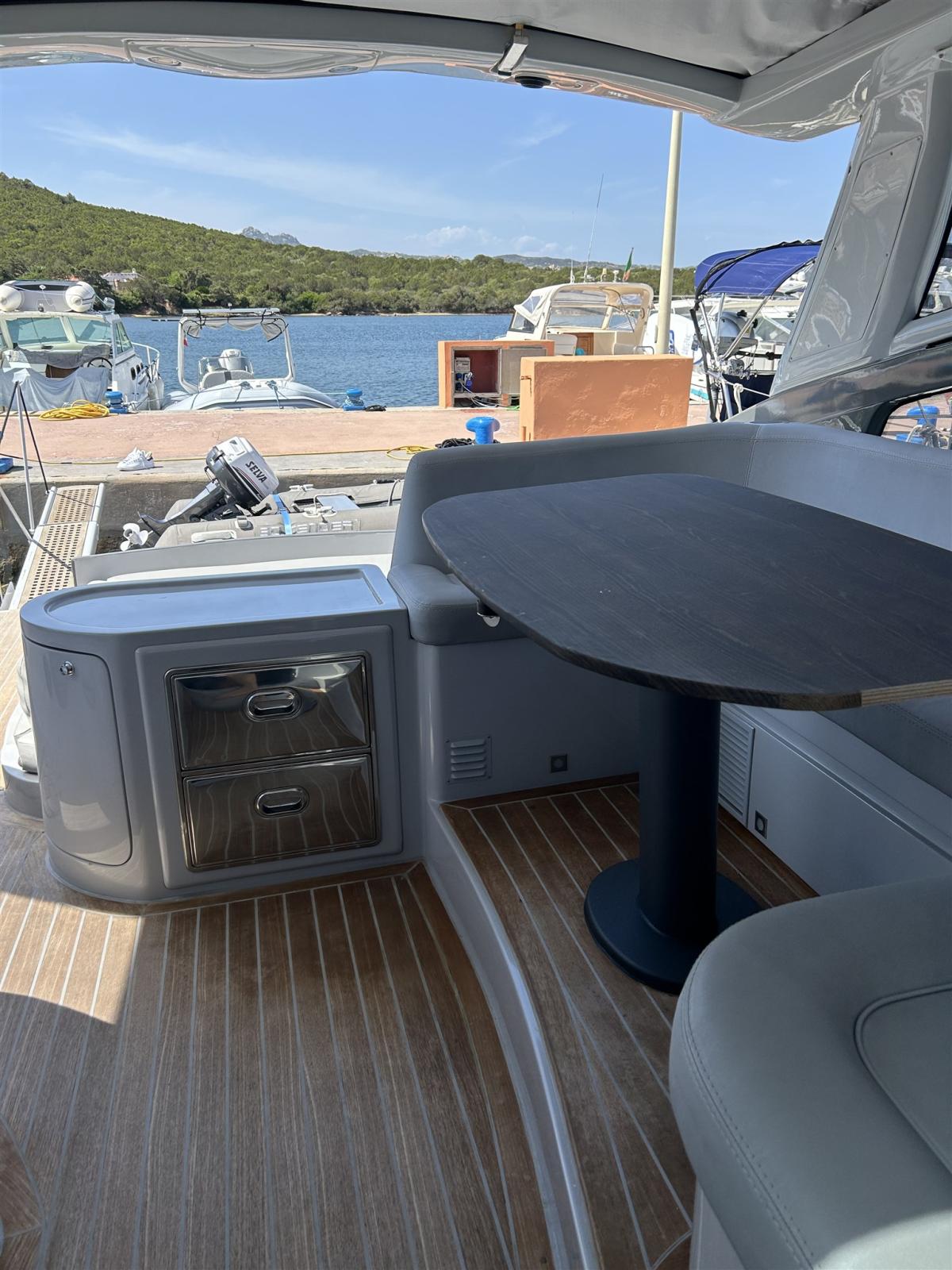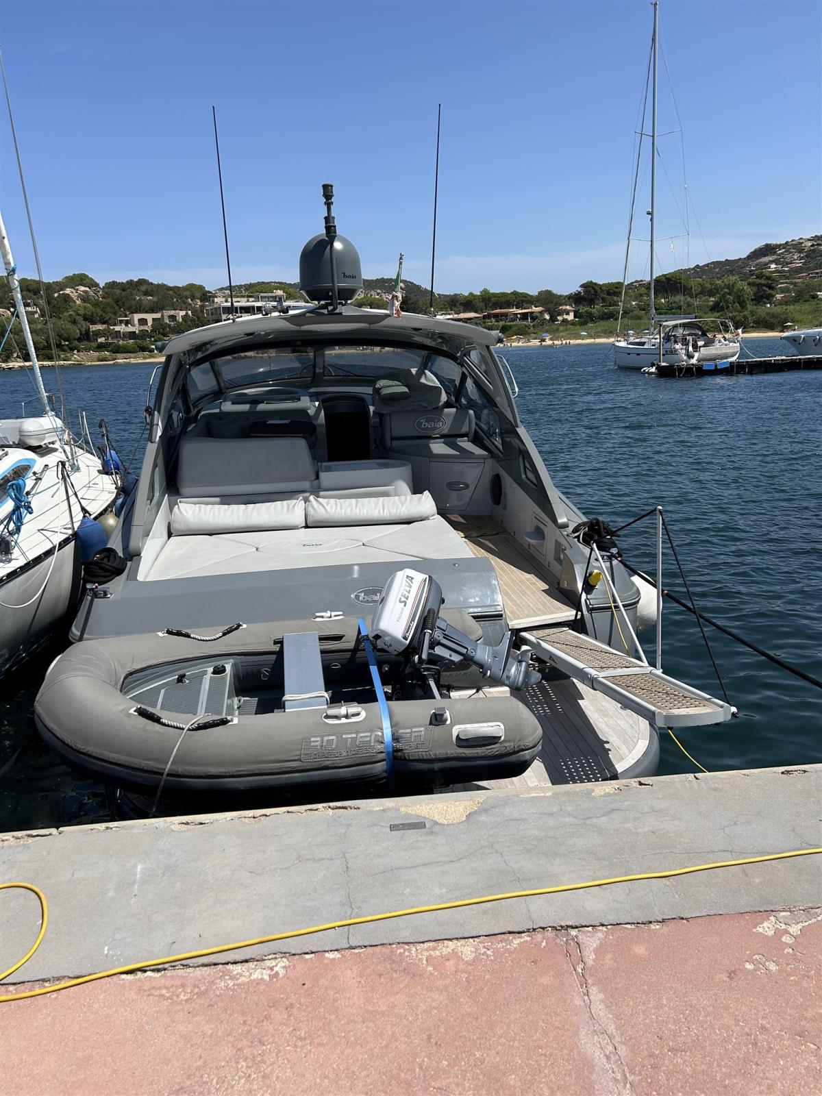 Fume/Gas Detector, Engine Alarm, Bilge Alarm, Electric Engine Compartment Opening (Elettricoidraulico), Auto Dynamic Trim Interceptor, Water pressure pump, Special Colour (Grey), Deck Shower, Hydraulic Flaps, Hard top, Fire Extinguishing System, Flaps Indicators, Washbasin in the cockpit, Courtesy Lights, Gangway (Idraulica a scomparsa), Platform, Automatic Bilge Pump, Manual Bilge Pump, Entry door, Teak Cockpit, Shorepower connector, Voltage Rectifier, Electric Windlass, swimming ladder, Saddles for tender (in plancetta), Waste Water Purifier System, cockpit table, Tender (3 MT chiglia in alluminio), Horn.