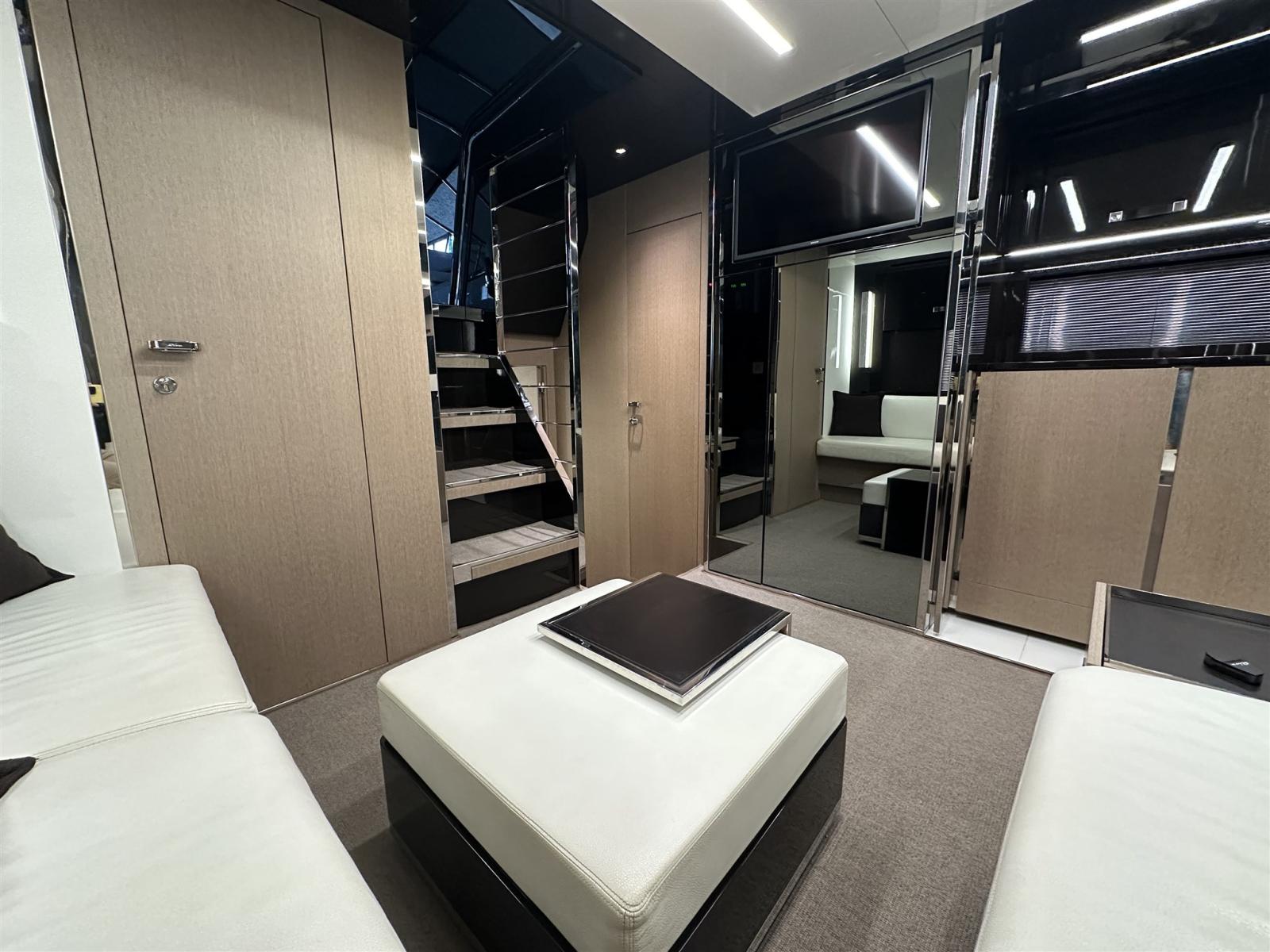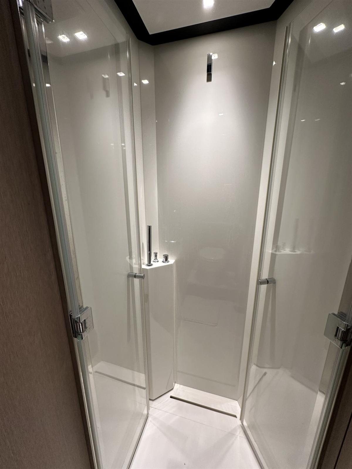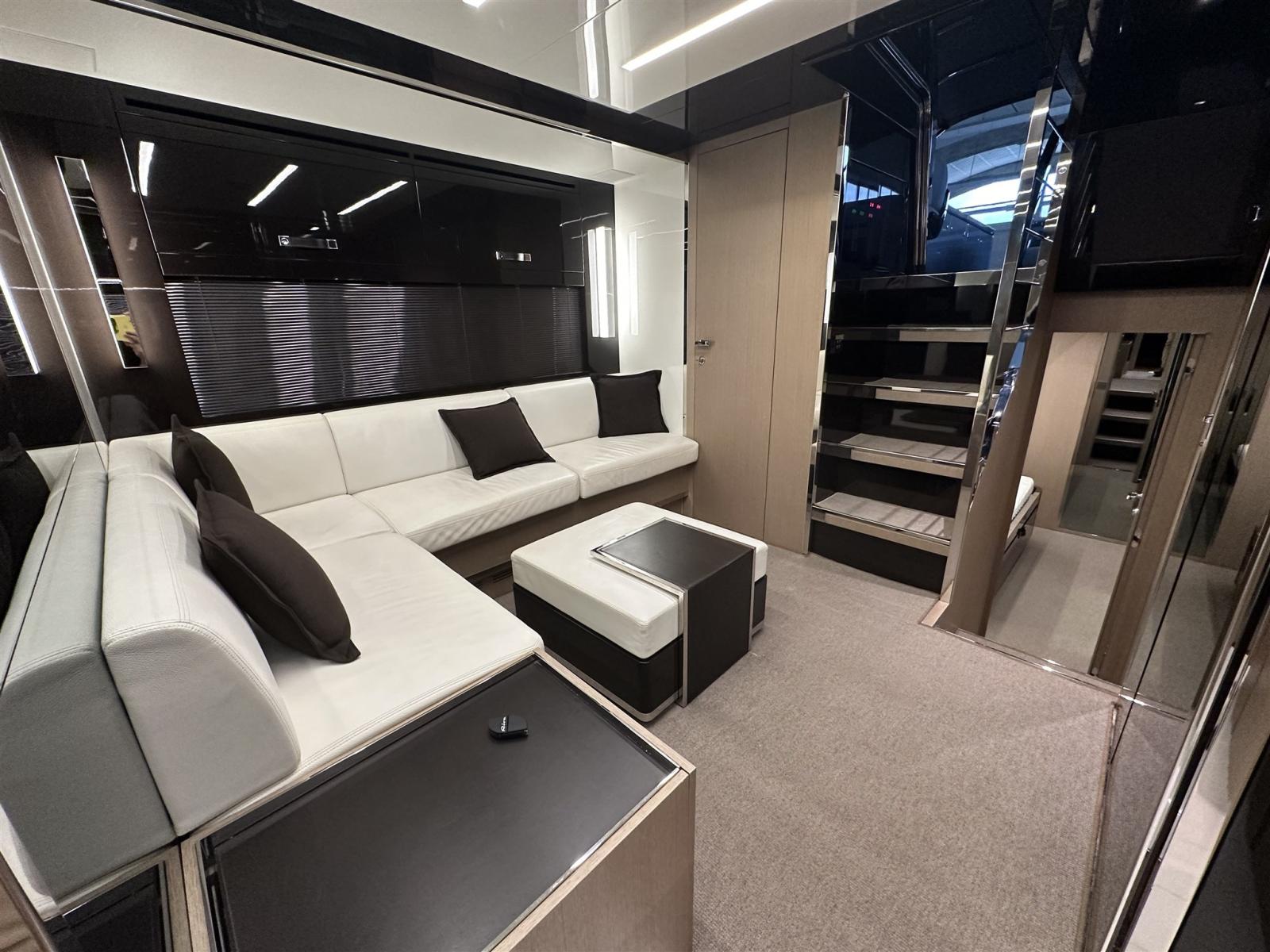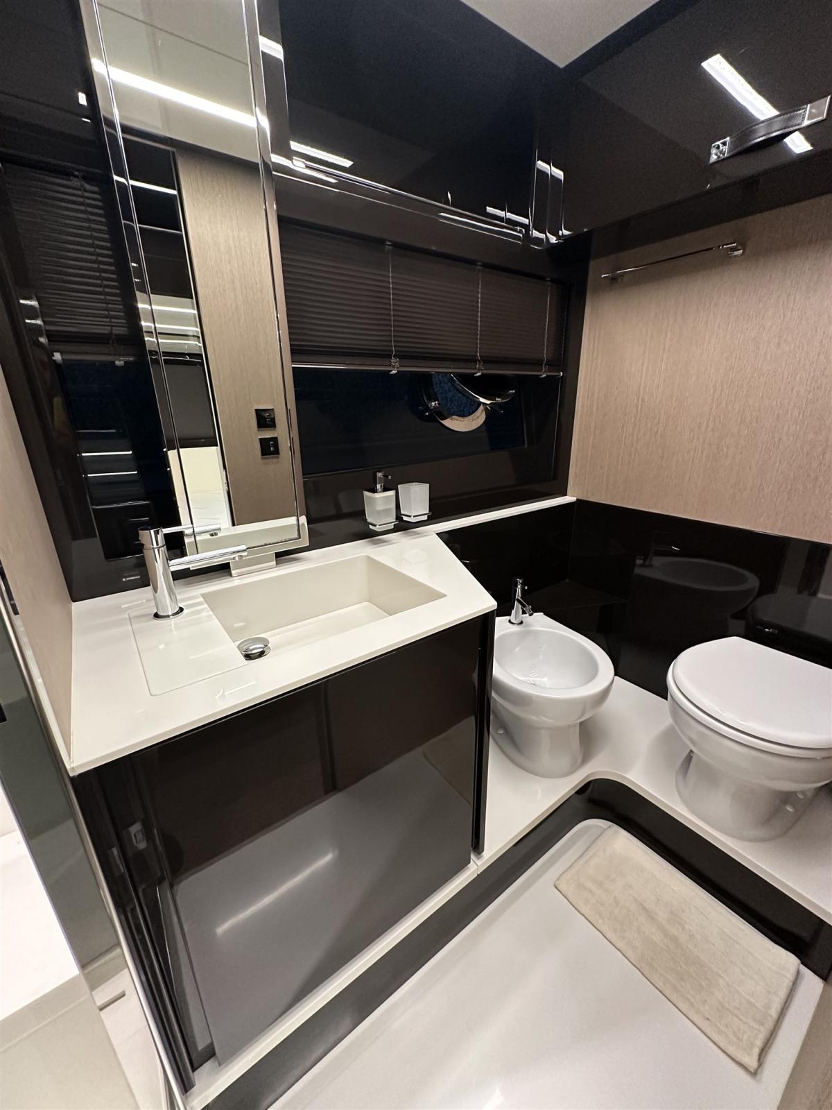 Fume/Gas Detector, Engine Alarm, Bilge Alarm, Anchor (Acciaio CATENA MAGGIORATA), Auto Dynamic Trim Interceptor, Water pressure pump, Teak Side Decks, Special Colour (Shark Grey linea galleggiamento acquamarina), Deck Shower, Directional Spotlight, Hydraulic Flaps, Tender Garage, Flaps Indicators, Anchor Chain Washdown, Washbasin in the cockpit, Courtesy Lights, Underwater lights (poppa), Gangway (idraulica a scomparsa), Platform, Automatic Bilge Pump, Manual Bilge Pump, Entry door, Teak Cockpit, Shorepower connector, Water harbor connector system, Voltage Rectifier, Electric Windlass, swimming ladder (elettroidraulica), Waste Water Purifier System, Stabilizers (Seakeeper), cockpit table, guard rails with gates (Acciaio), Horn, Stern Winches, Bow Winches.