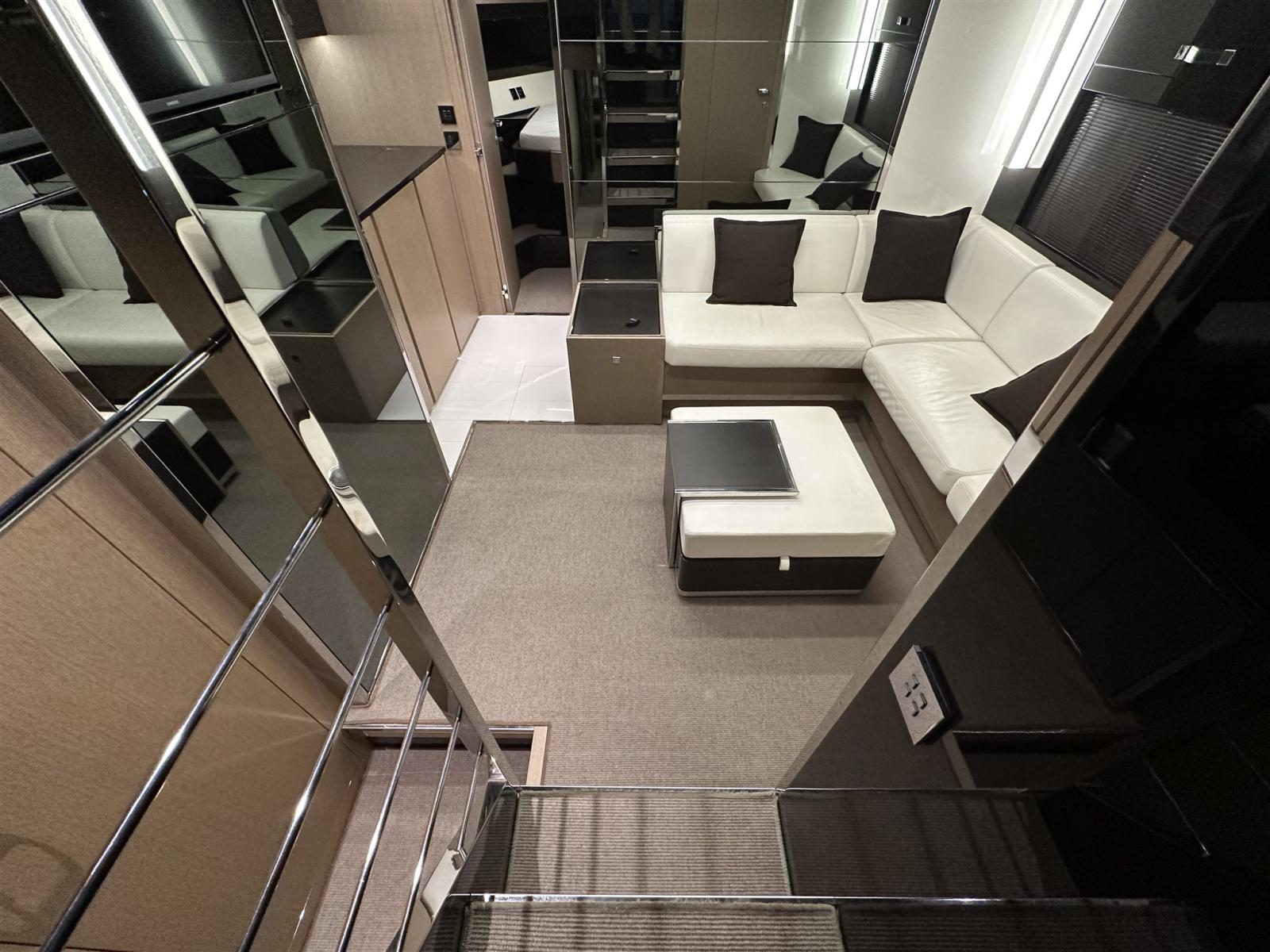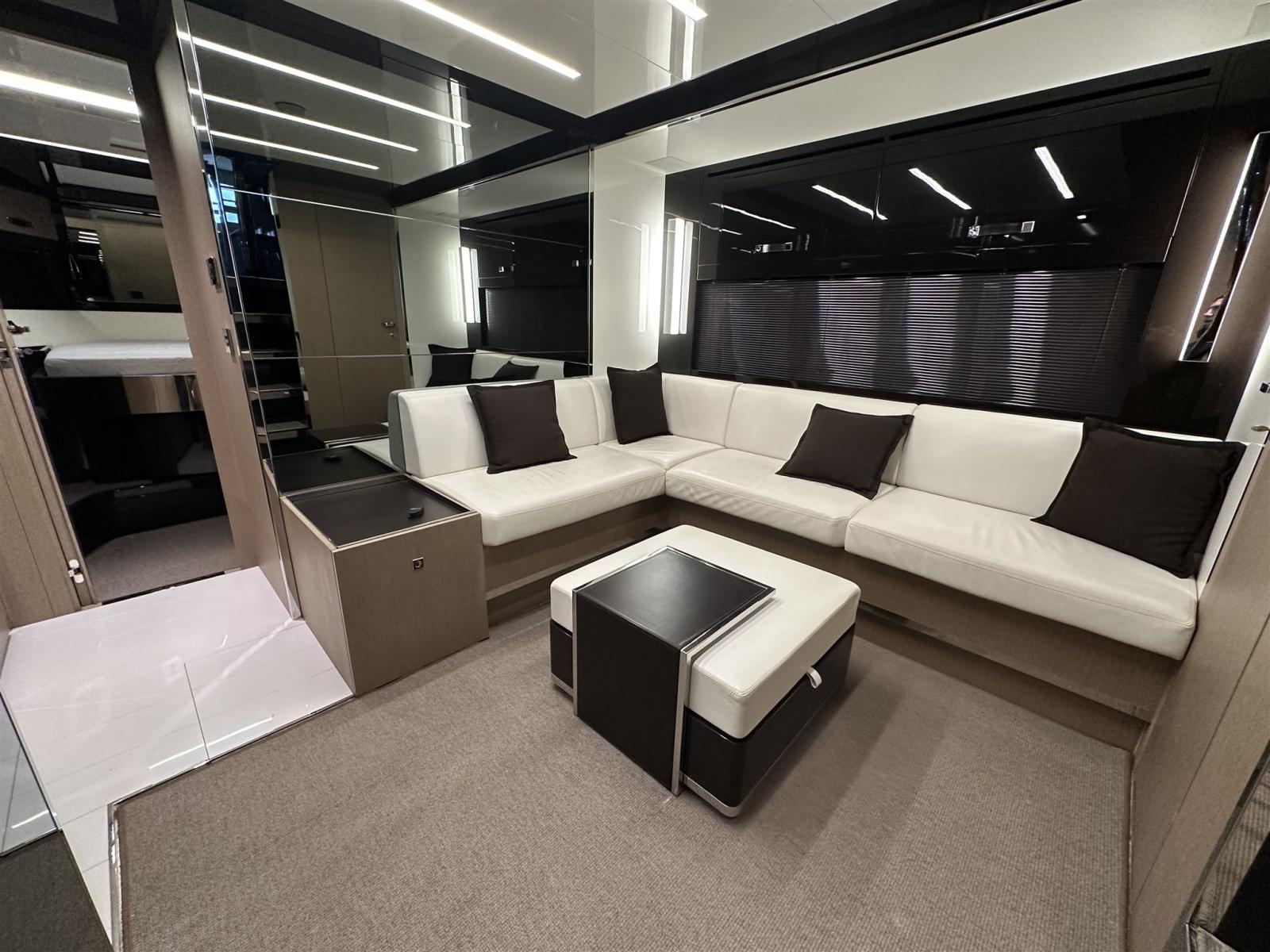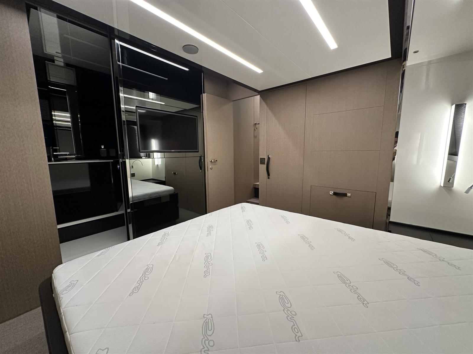 Fume/Gas Detector, Engine Alarm, Bilge Alarm, Anchor (Acciaio CATENA MAGGIORATA), Auto Dynamic Trim Interceptor, Water pressure pump, Teak Side Decks, Special Colour (Shark Grey linea galleggiamento acquamarina), Deck Shower, Directional Spotlight, Hydraulic Flaps, Tender Garage, Flaps Indicators, Anchor Chain Washdown, Washbasin in the cockpit, Courtesy Lights, Underwater lights (poppa), Gangway (idraulica a scomparsa), Platform, Automatic Bilge Pump, Manual Bilge Pump, Entry door, Teak Cockpit, Shorepower connector, Water harbor connector system, Voltage Rectifier, Electric Windlass, swimming ladder (elettroidraulica), Waste Water Purifier System, Stabilizers (Seakeeper), cockpit table, guard rails with gates (Acciaio), Horn, Stern Winches, Bow Winches.