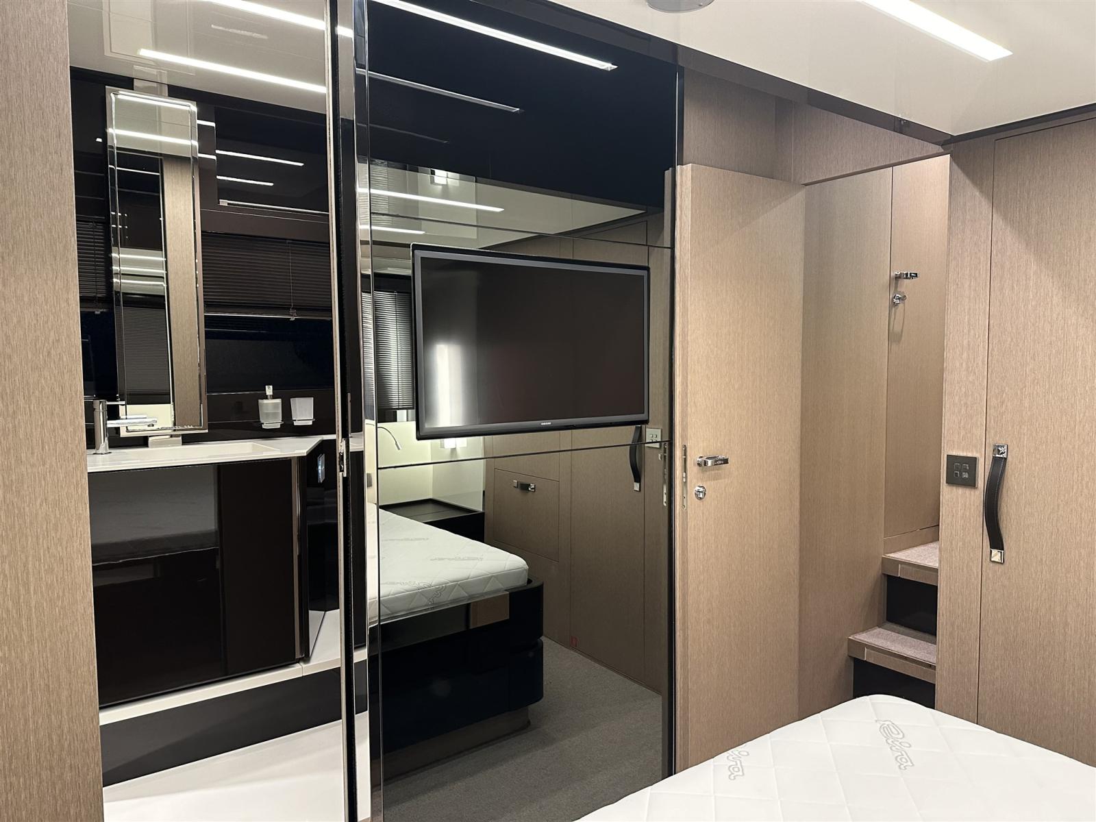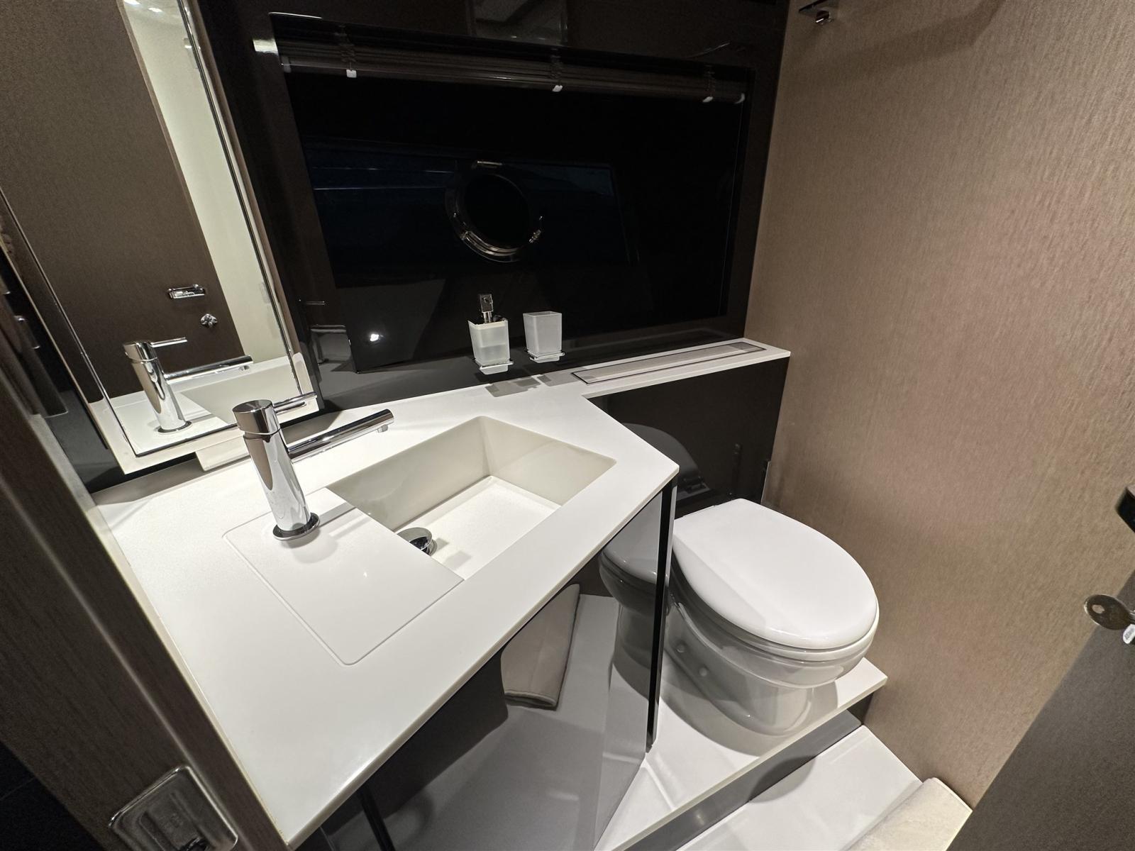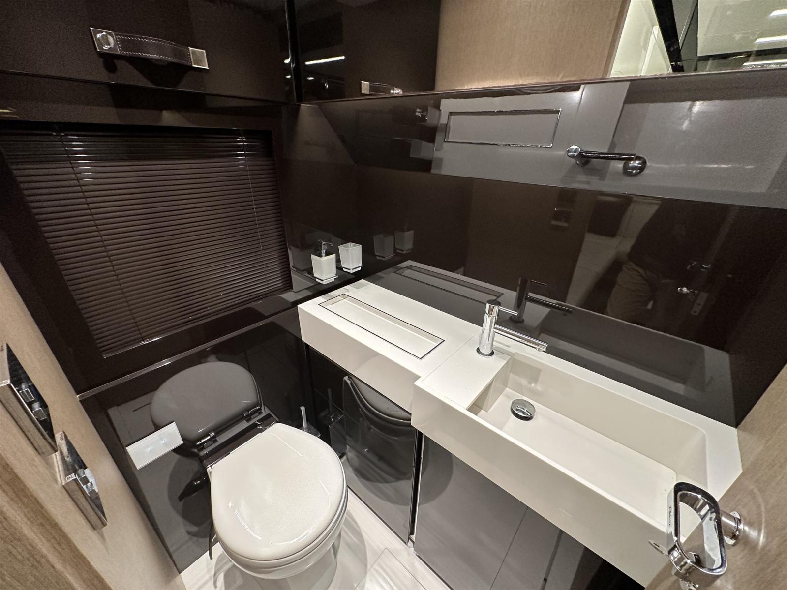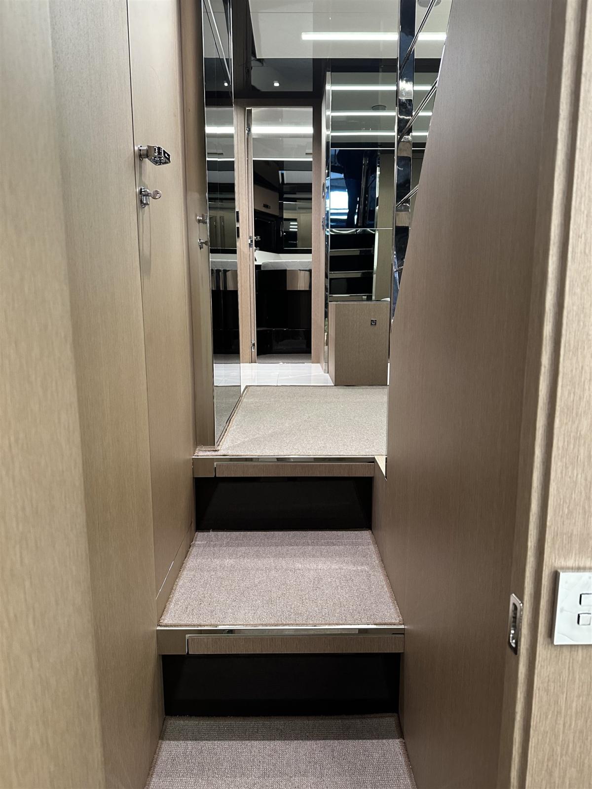 Fume/Gas Detector, Engine Alarm, Bilge Alarm, Anchor (Acciaio CATENA MAGGIORATA), Auto Dynamic Trim Interceptor, Water pressure pump, Teak Side Decks, Special Colour (Shark Grey linea galleggiamento acquamarina), Deck Shower, Directional Spotlight, Hydraulic Flaps, Tender Garage, Flaps Indicators, Anchor Chain Washdown, Washbasin in the cockpit, Courtesy Lights, Underwater lights (poppa), Gangway (idraulica a scomparsa), Platform, Automatic Bilge Pump, Manual Bilge Pump, Entry door, Teak Cockpit, Shorepower connector, Water harbor connector system, Voltage Rectifier, Electric Windlass, swimming ladder (elettroidraulica), Waste Water Purifier System, Stabilizers (Seakeeper), cockpit table, guard rails with gates (Acciaio), Horn, Stern Winches, Bow Winches.