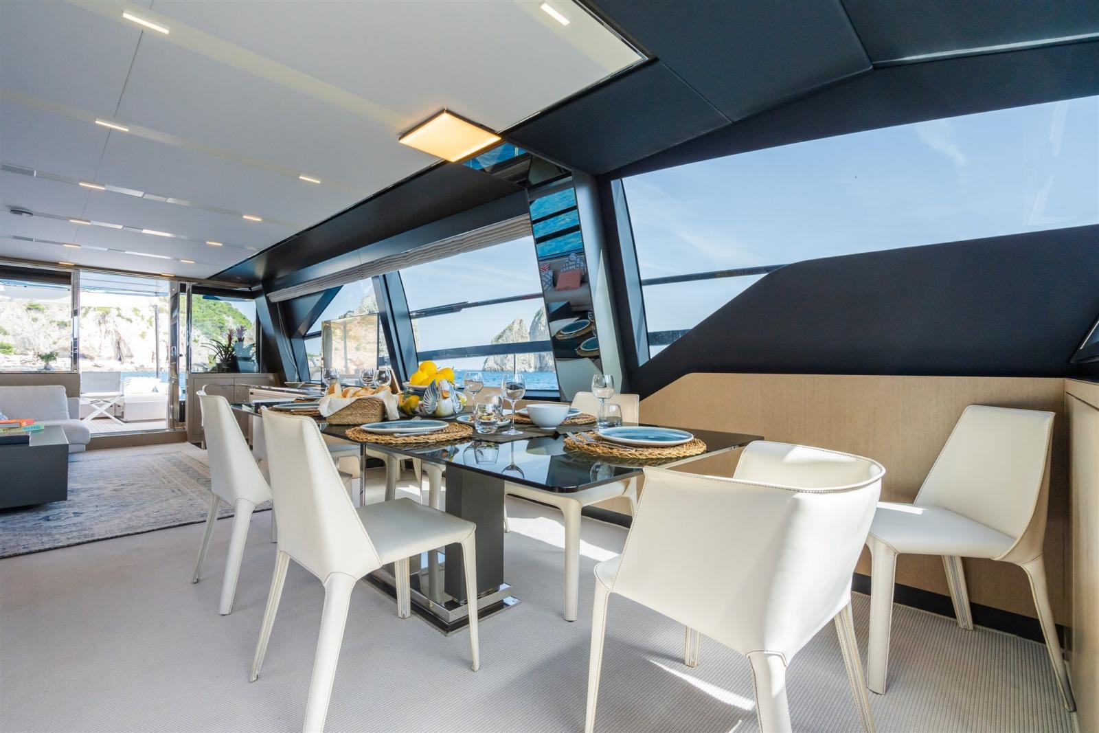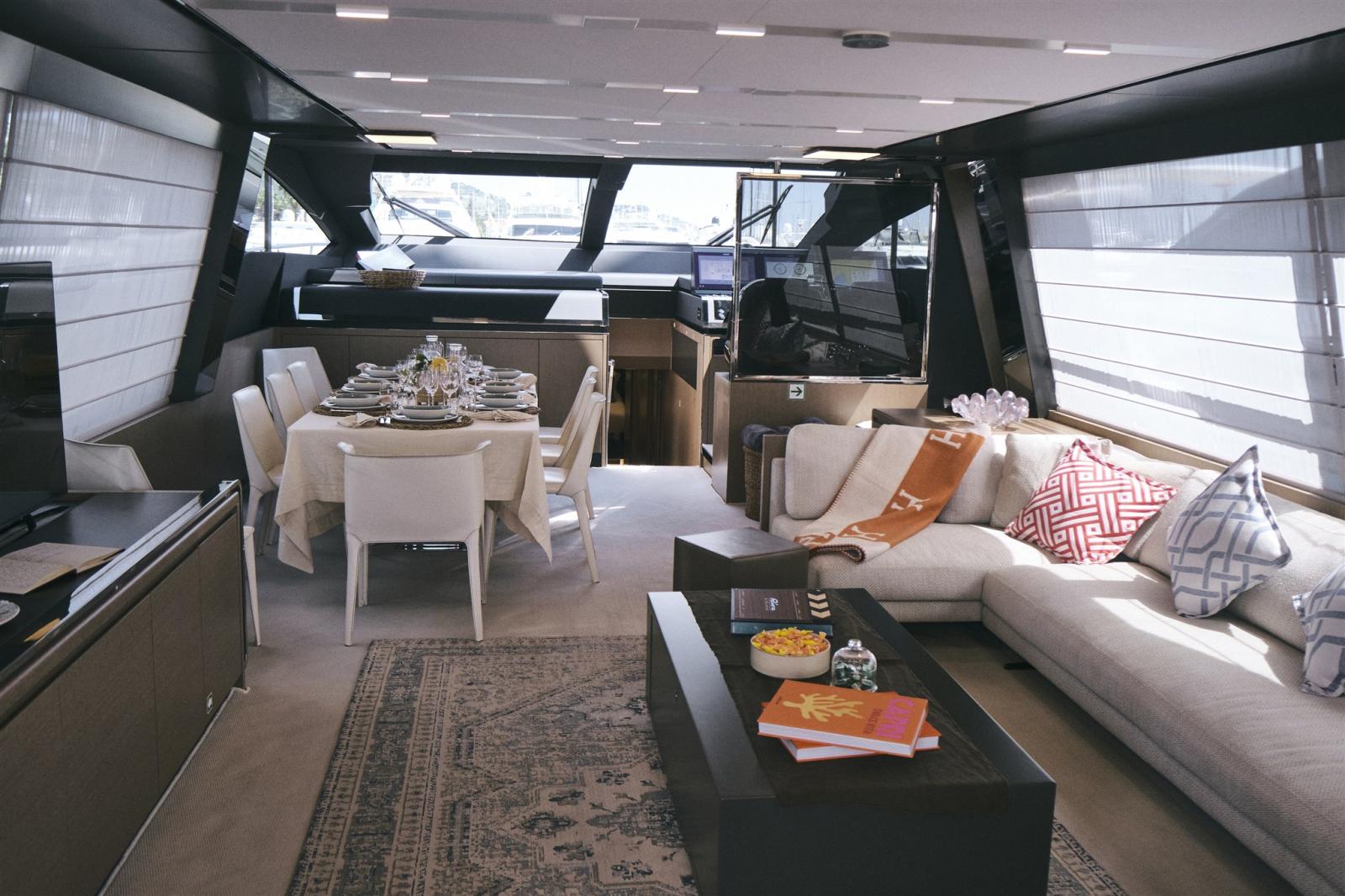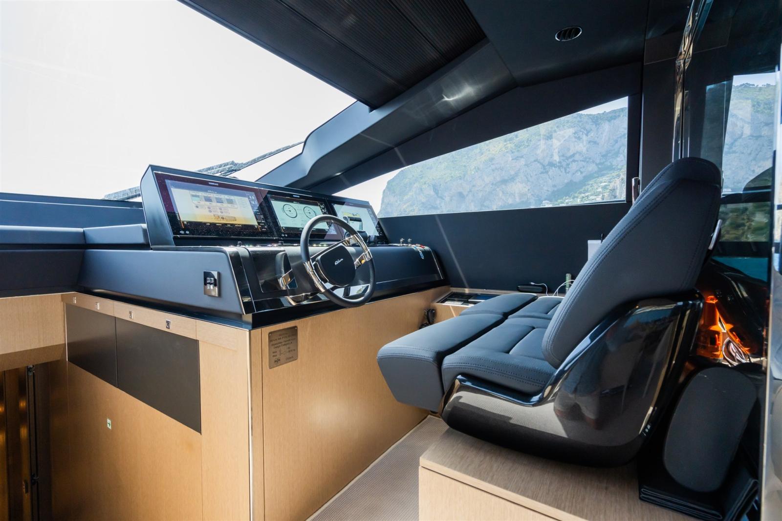 Satellite TV antenna (KVH TV6 TV SAT), Satellite Decoder, TV Ready (Sistema Sofabaton), Hi-Fi (Sonance - Premium Sound per esterni con altoparlanti HQ e AirPlay automatico/indipendente su prua, pozzetto e flybridge).