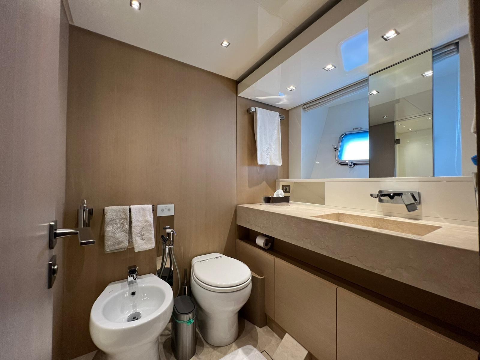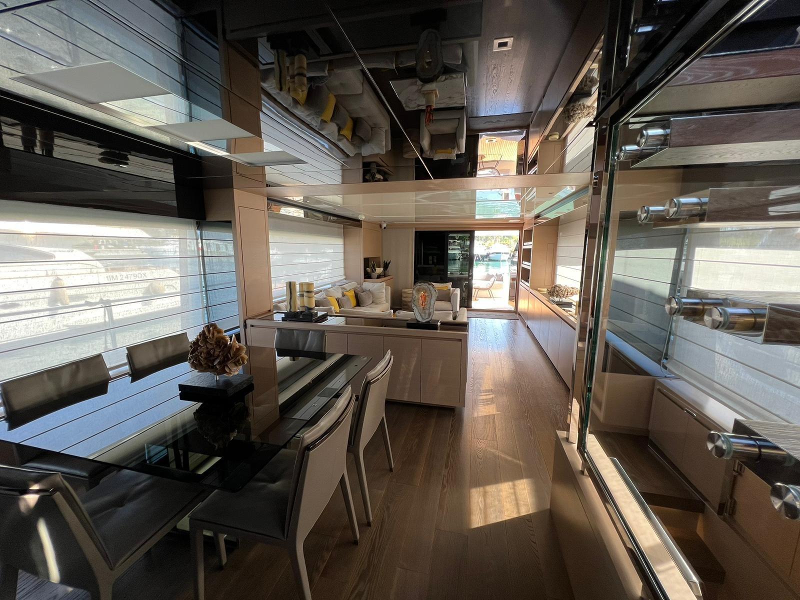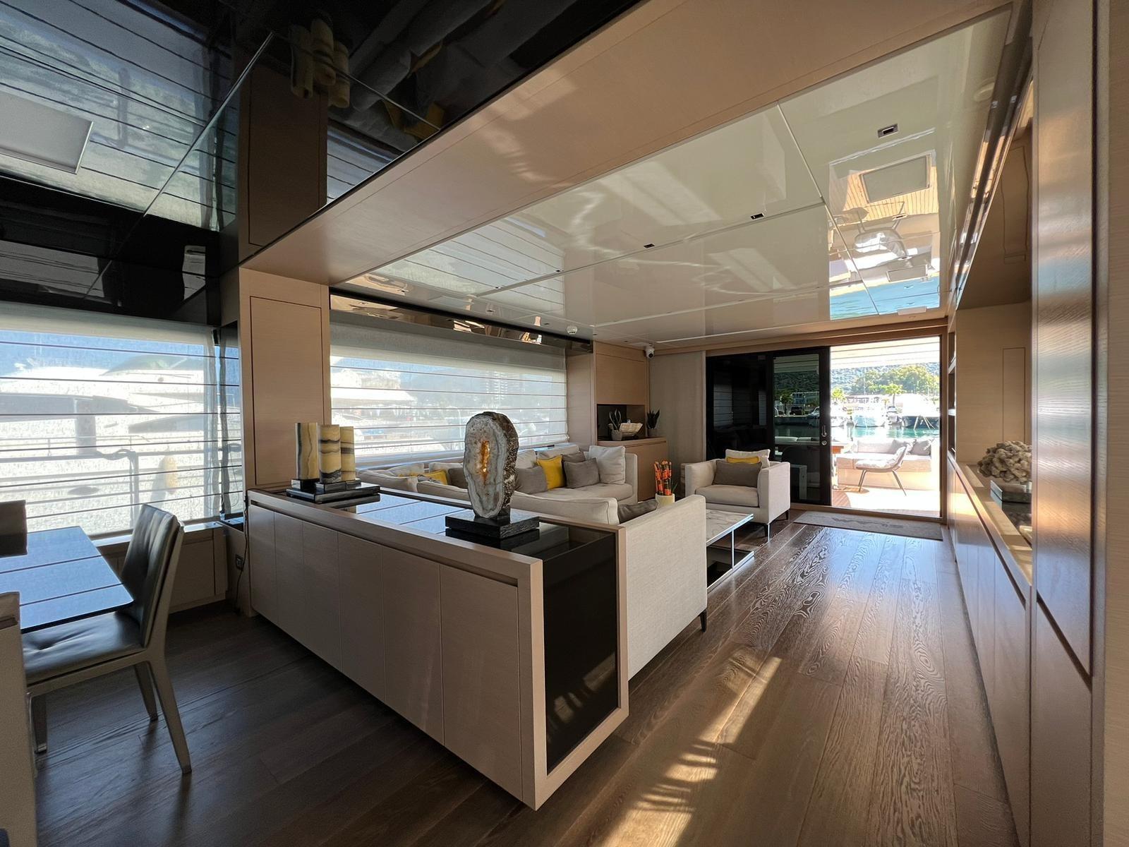 Warm Water, BBQ/Grill (Fly), 2 Warm Water System, Inverter Air Conditioning, Internet Connection, Domotic Controller, Watermaker (300 LT Ora Idromar), Waste Water Plant, Water Tank Meter, Waste Water Tank Meter, Interior wooden floor (Zona Dinette), Black Water Tank (400LT), Video camera (Garage, plancia, Salone, Poppa, Laterali,Fly), Internal Phone, Termovision, Electric Toilet.