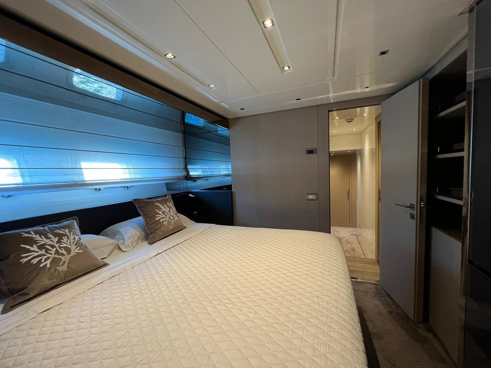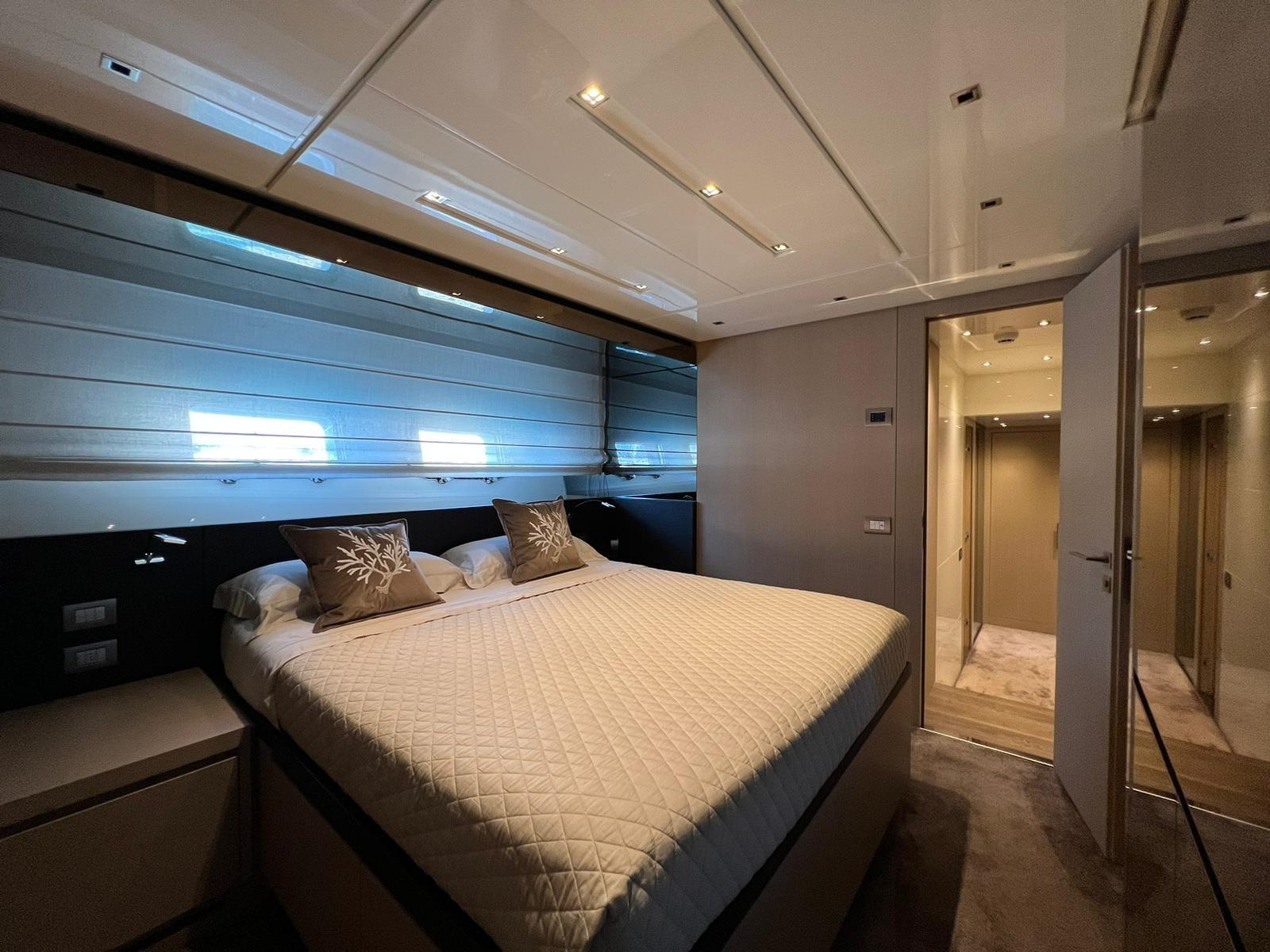 2 Bimini (prua e fly), Cockpit Cover, Cushions, Stern Cushions, Bow Cushions, Fly Bridge Cuscions, Cockpit Cushions, Blackout Curtains (davanti alla prua), Mosquito nets.
