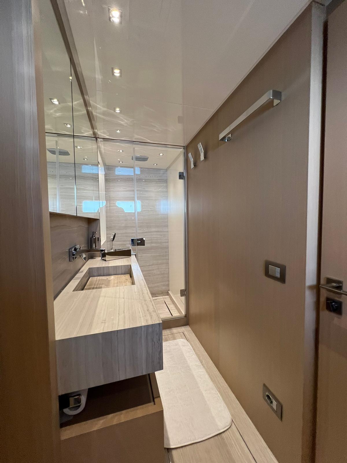 Fume/Gas Detector, Engine Alarm, Bilge Alarm, Alternator, 2 Anchor (200kg), Deck Suction of Dirty Water (garage), Auto Dynamic Trim Interceptor, 2 Water pressure pump, 2 Life Raft, 2 Folding cleats (nella plancetta), Draining System, Teak Side Decks, 2 Battery charger (automatico), Shore power cable, Guard rail, Deck Shower, Twin Steering, Directional Spotlight, Hydraulic Flaps, Tender Garage, Hard top (con possibilita' di aperture), Fire Extinguishing System, Flaps Indicators, Anchor Chain Washdown, Courtesy Lights, Underwater lights (poppa piu' laterali), Battery Monitor, 12 Fenders, Gangway (idraulica), Platform, Automatic Bilge Pump, Manual Bilge Pump, Deck Wash Pump, Teak deck, Entry door, 2 Side door, Teak Cockpit, Shorepower connector, Water harbor connector system, Voltage Rectifier, 2 Electric Windlass, swimming ladder, Stabilizers (pinne elettriche), cockpit table (abbattibile elettricamente), Tender (williams 454 idrojet), Horn, 2 Stern Winches, 2 Bow Winches.