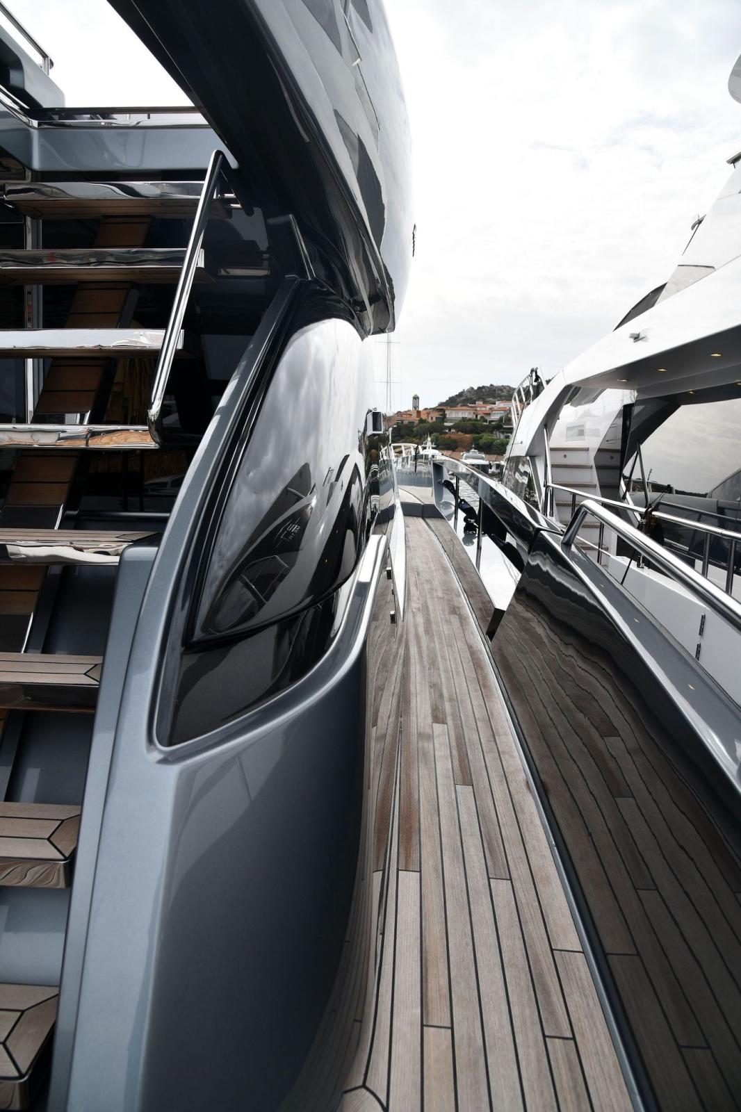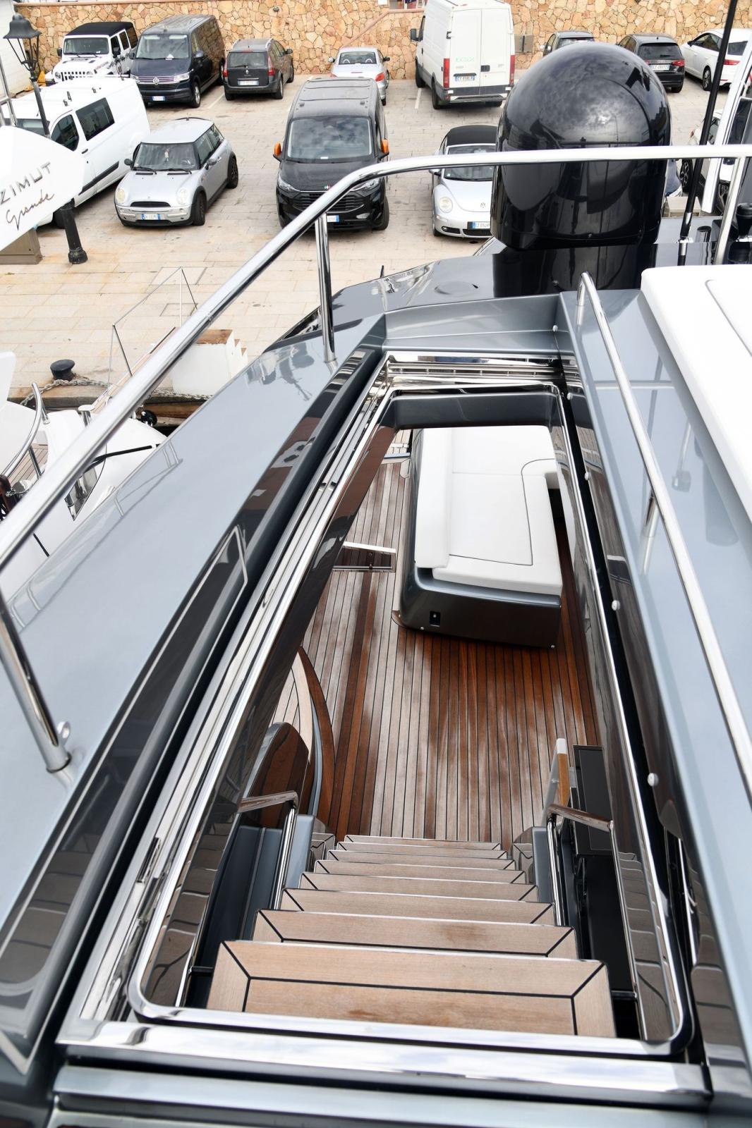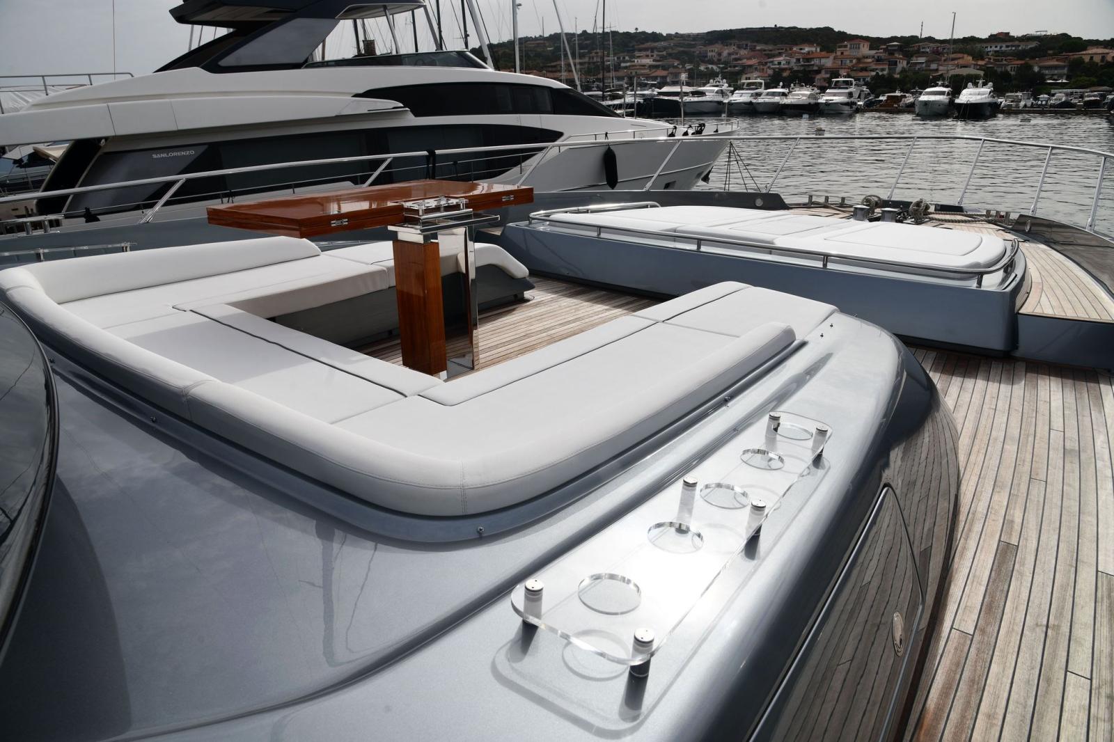 Water pressure pump, 2 Folding cleats (da ormeggio addizionali), Guard rail, Safety rail, Deck Shower, Twin Steering, Tender Garage, Washbasin in the cockpit, Underwater lights, Gangway, Automatic Bilge Pump, Shorepower connector, Water harbor connector system, Electronic instrumentation repeater (simrad in crew dinette), Electric Windlass, swimming ladder, Stabilizers (di assetto), cockpit table, Horn.