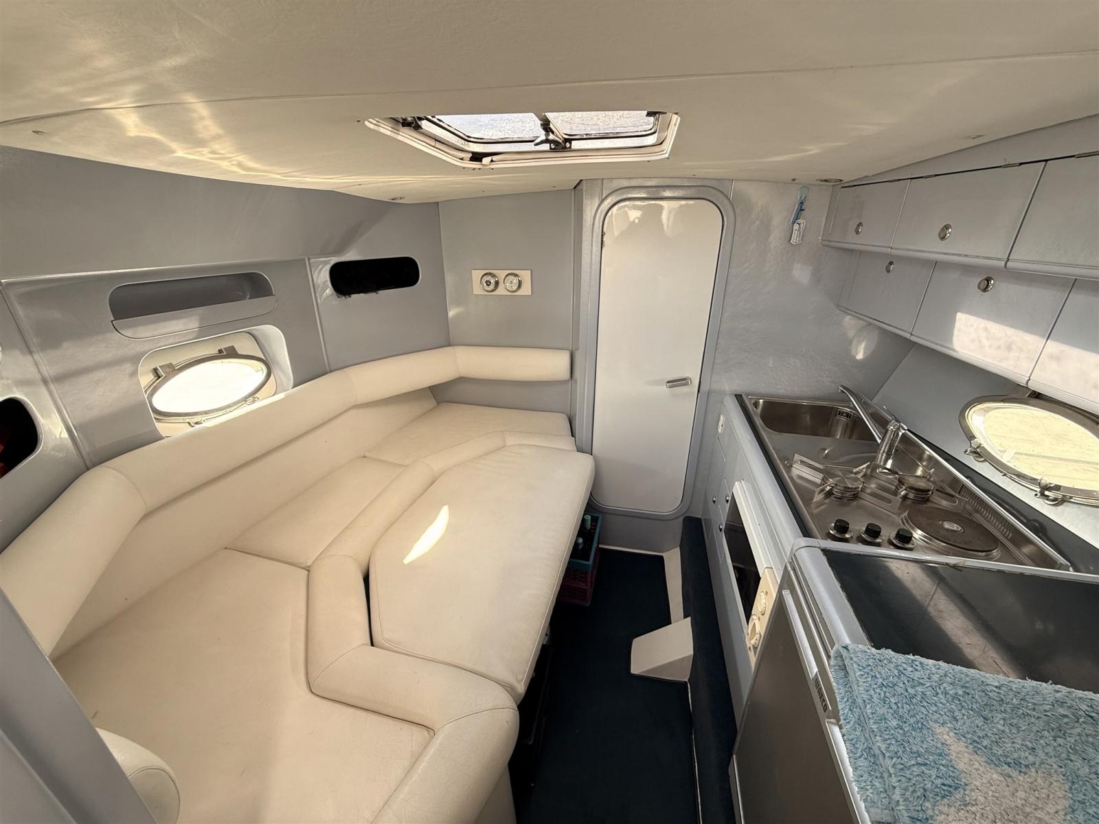In the cabin there is a comfortable dinette with sofa and lowerable table with cushion that allows you to have an extra bed, a double bed in the bow and a berth from a place amidships.