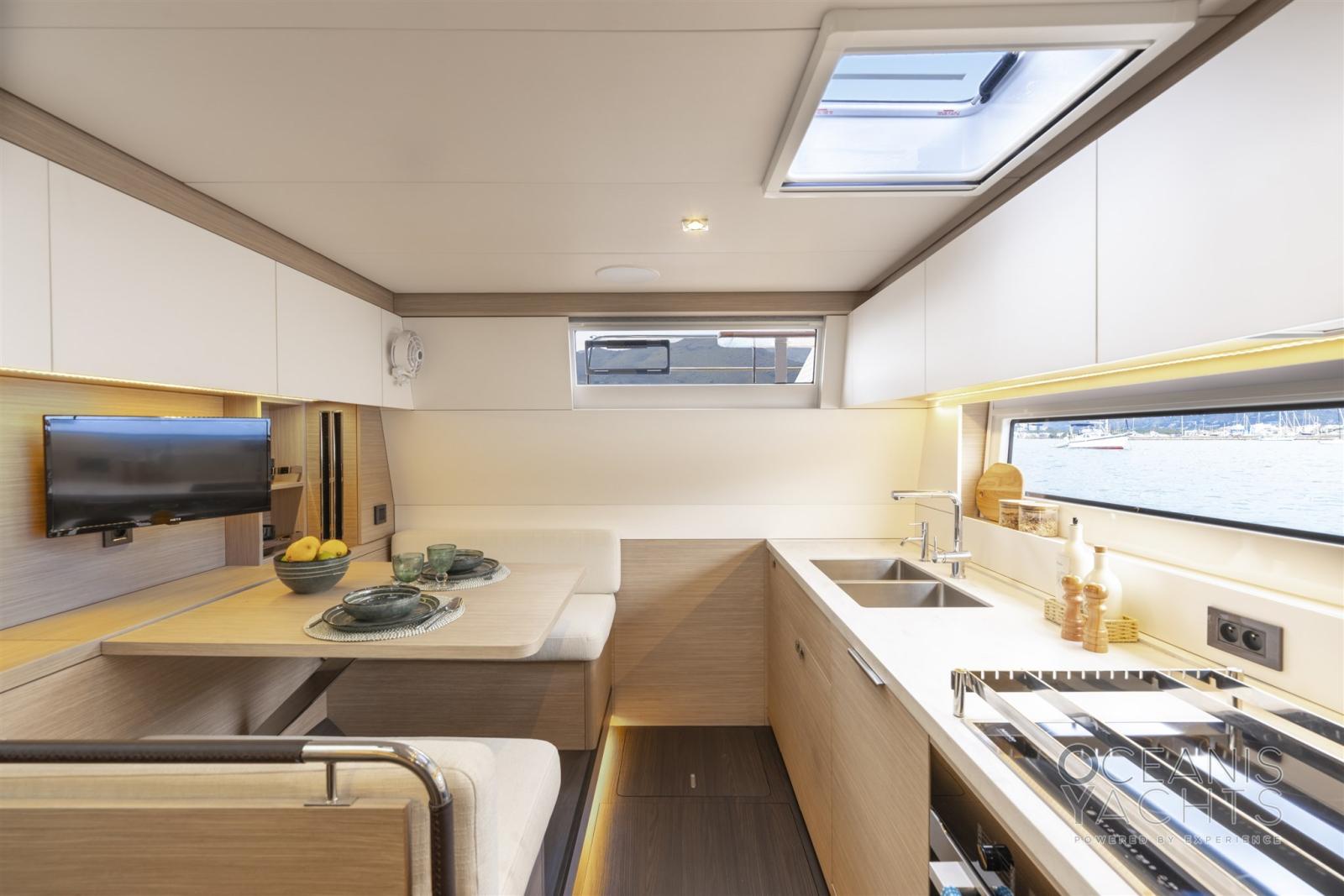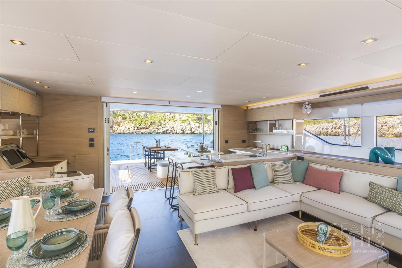 8 Batteries, Deck Shower, Courtesy Lights, Gangway, Platform, Automatic Bilge Pump, Manual Bilge Pump, Deck Wash Pump, Entry door, Teak Cockpit, Shorepower connector, Water harbor connector system, Electric Windlass, swimming ladder, Outboard Engine Support Bracket, cockpit table, 4 Winch Electric, Windex.