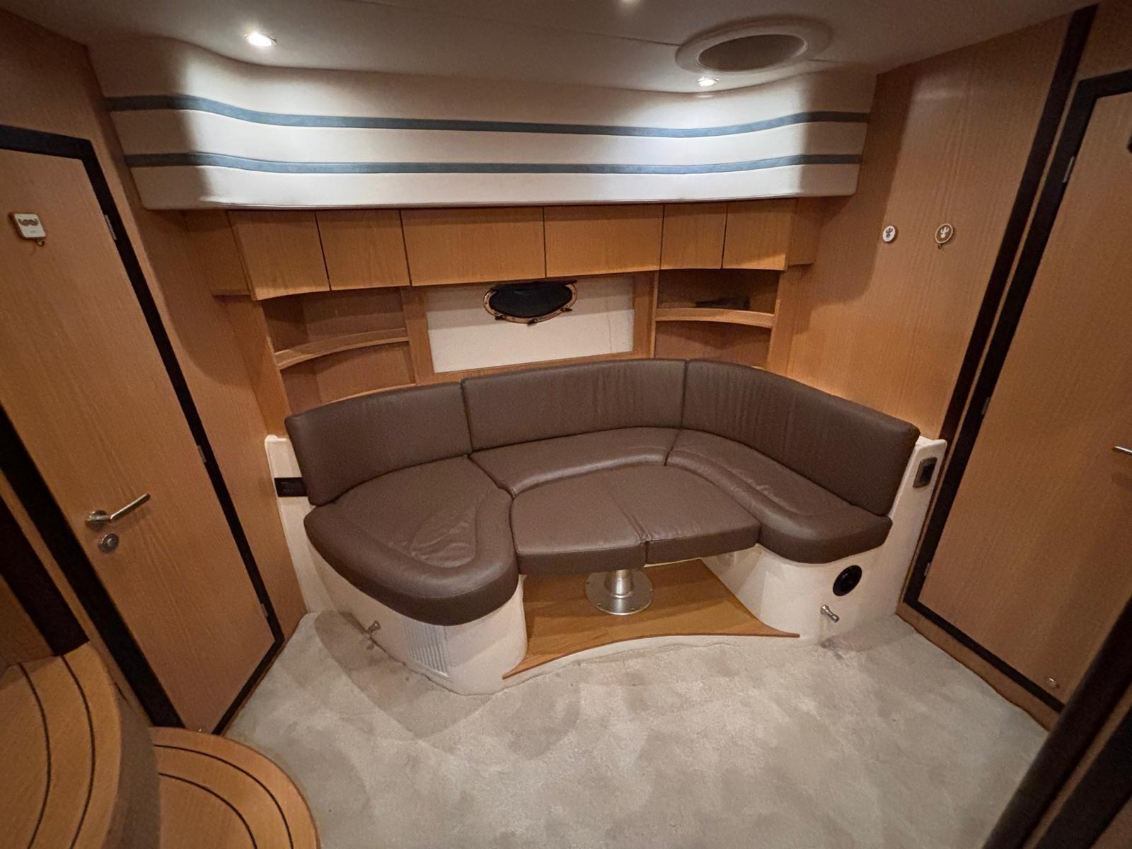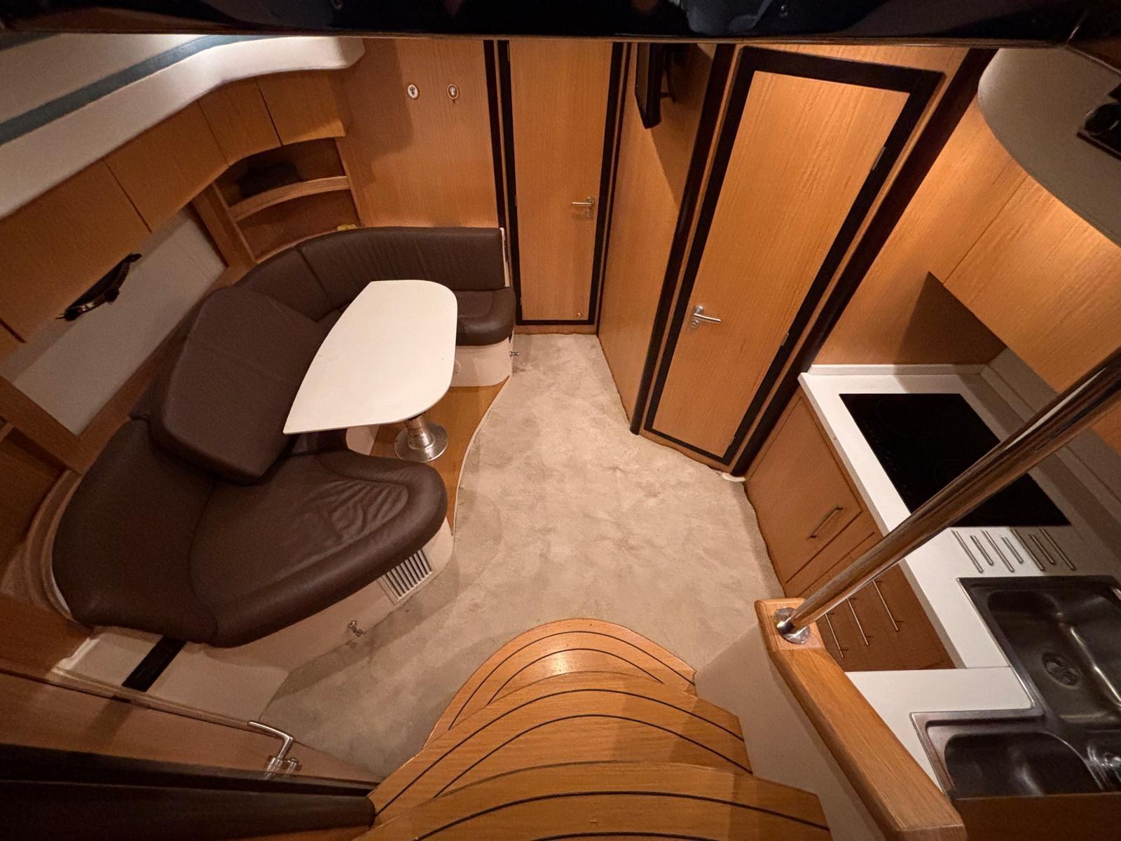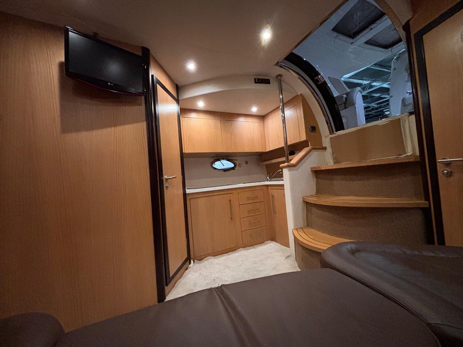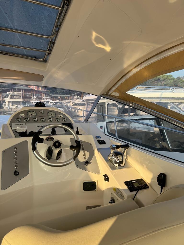 Accessories: Compass, chain counter, display, depth sounder, autopilot, plotter, VHF radio, anchor and chain, batteries, battery charger, bow thruster, electric flaps, gangway, electric bilge pump, 220v socket, electric windlass, swimming ladder, air conditioning, stereo and speakers, internal kitchen, stove, internal refrigerator