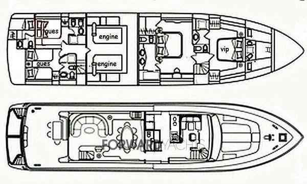 Internal layout with 4 cabins. Day toilet on the main deck. Crew area with two cabins for 3 persons.