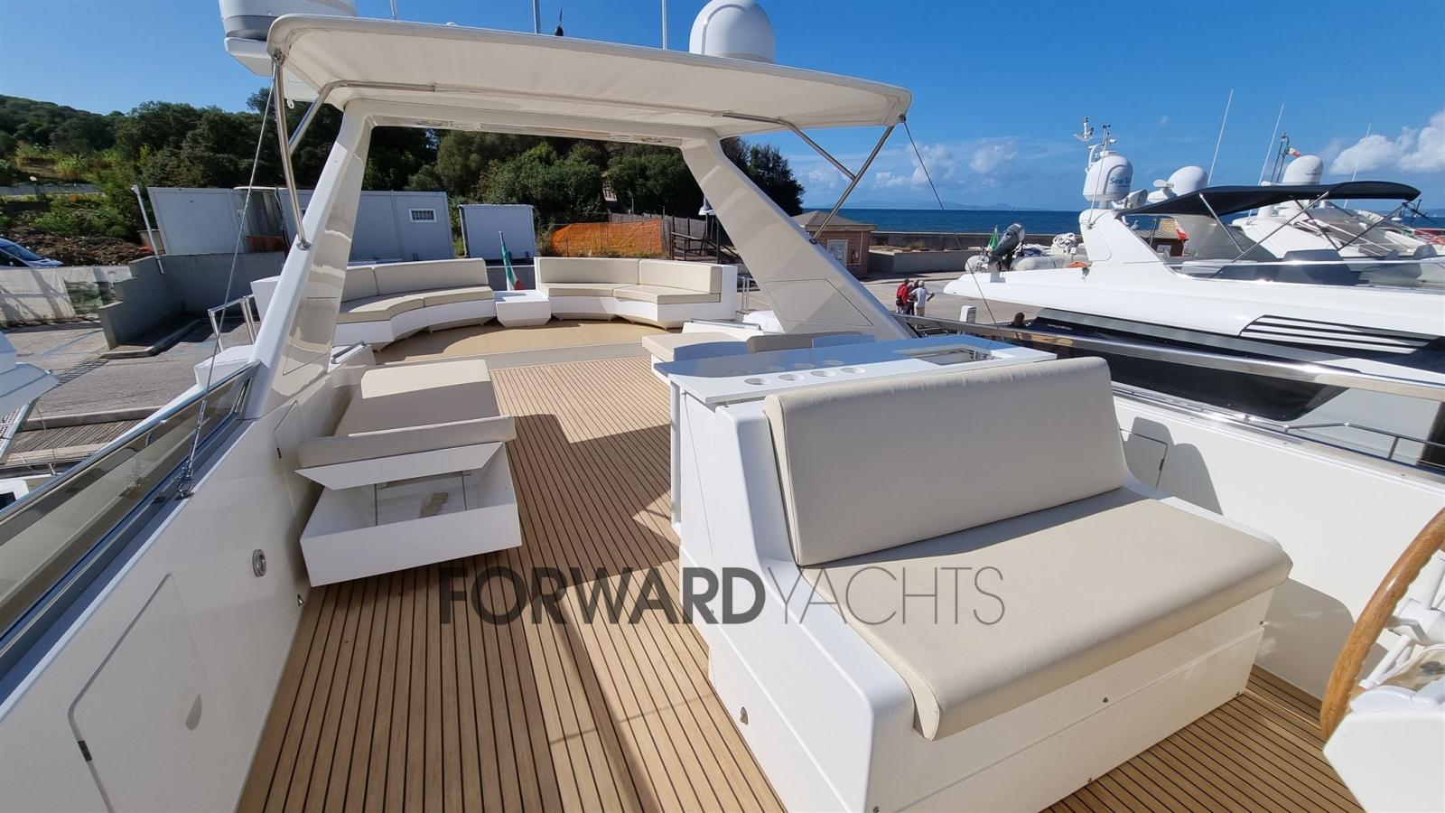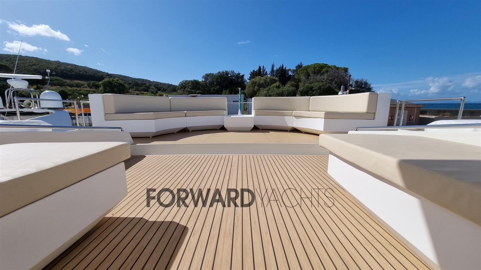 Teak Side Decks, Deck Shower, Twin Steering, Courtesy Lights, Gangway (Idraulica), Platform (Teak), Entry door, Teak Cockpit, Shorepower connector, Electric Windlass, swimming ladder, cockpit table.
