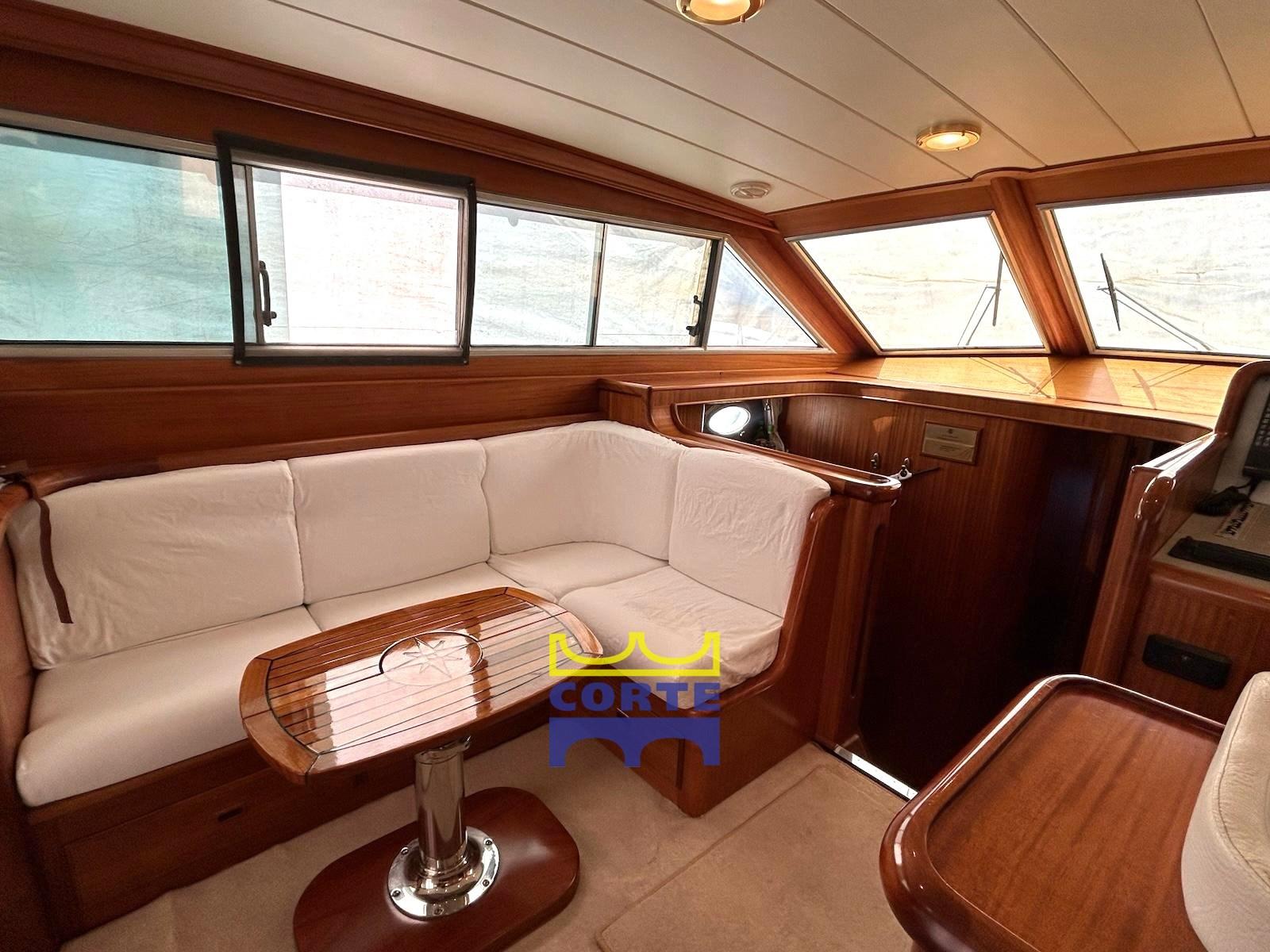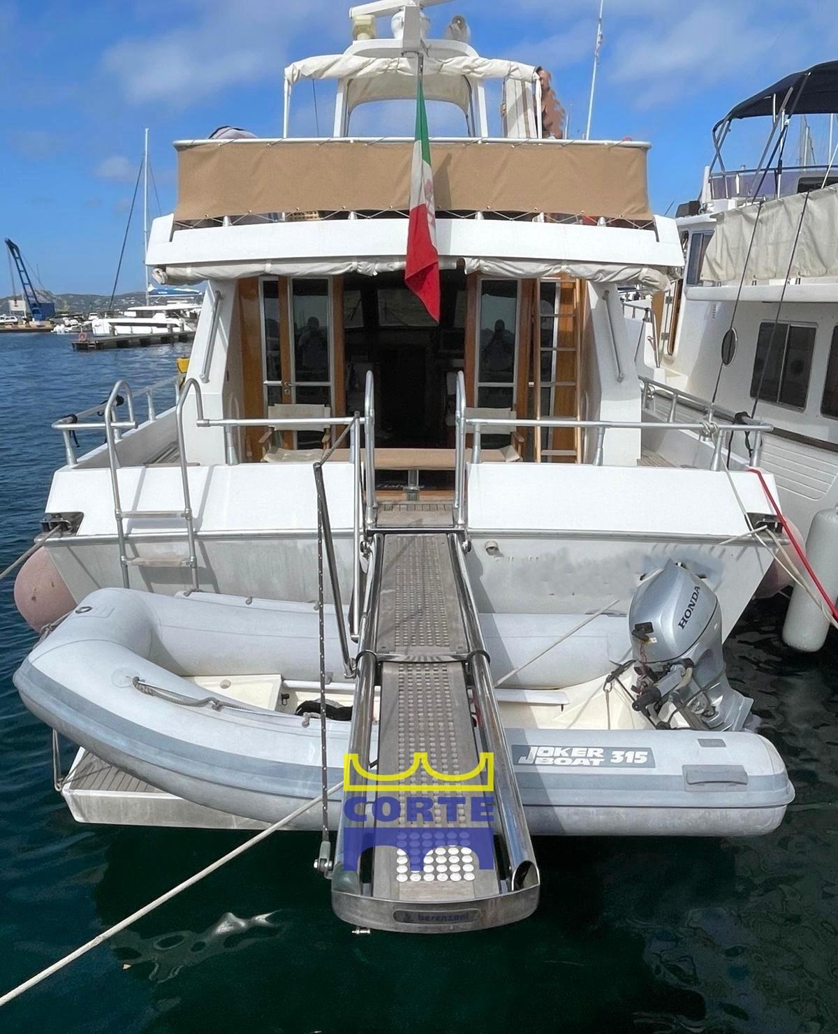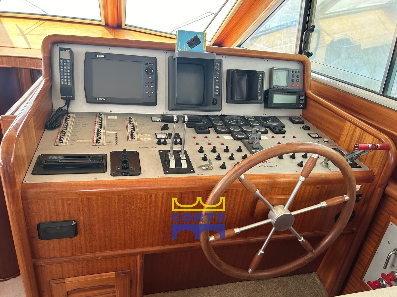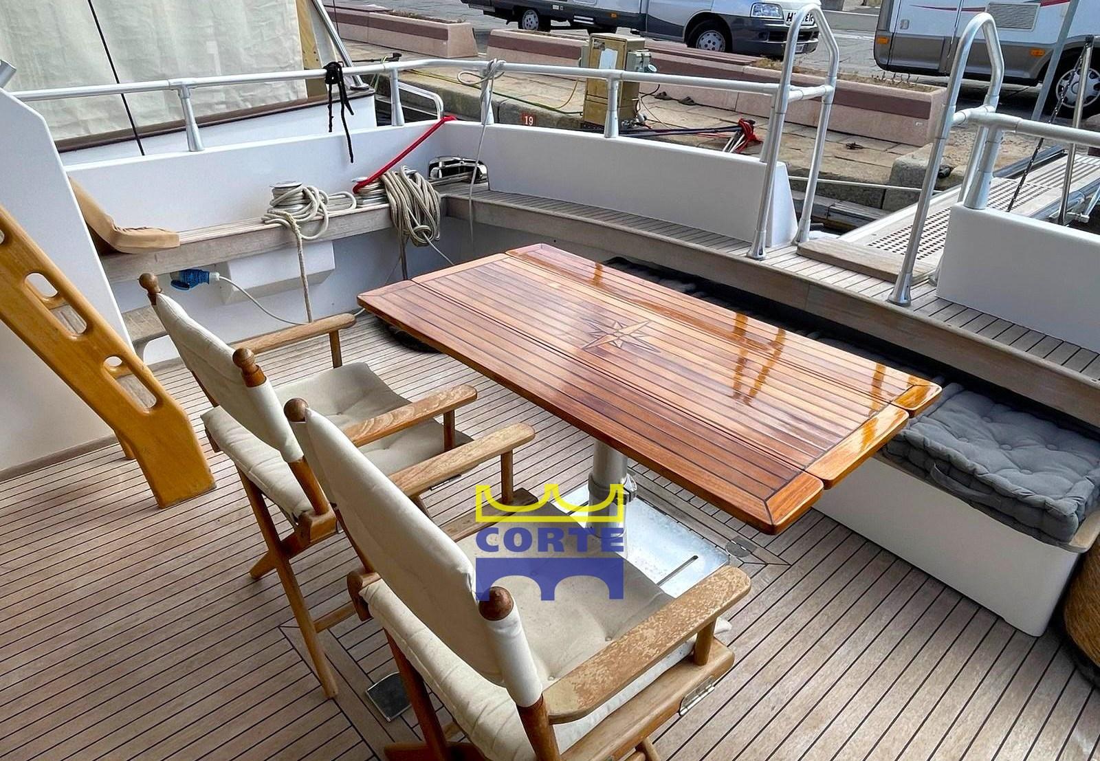 Engine Alarm, Bilge Alarm, Water pressure pump, Draining System, Teak Side Decks, Deck Shower, Twin Steering, Directional Spotlight, Hydraulic Flaps, Tender Crane (passerella idraulica), Fire Extinguishing System, Gangway (elettroidraulica), Platform (poppa in teak), Automatic Bilge Pump, Entry door, Teak Cockpit, Shorepower connector, Water harbor connector system, Electric Windlass, cockpit table (regolabile in altezza e movibile verso prua), Tender, Horn, 2 Stern Winches, Bow Winches.