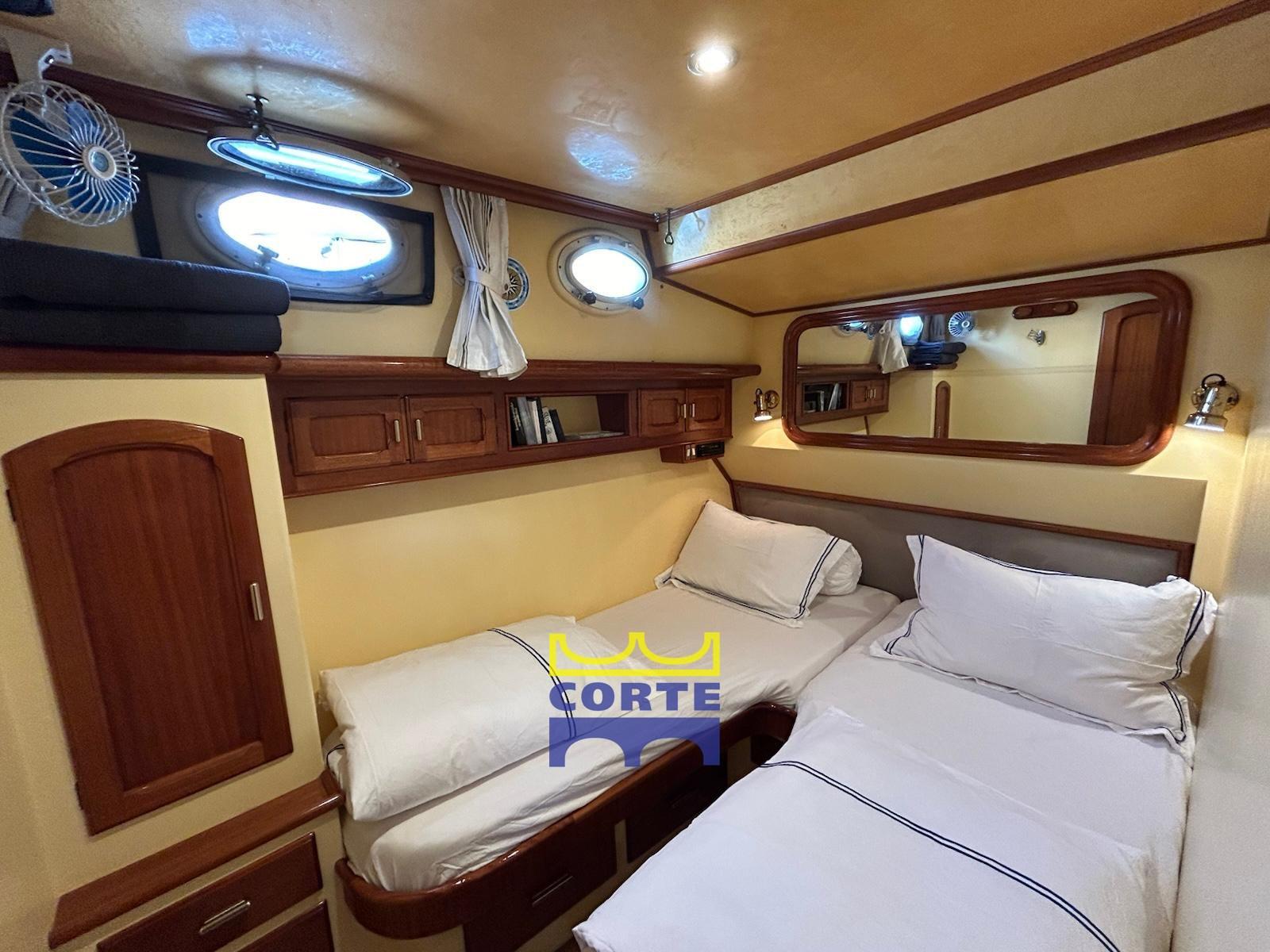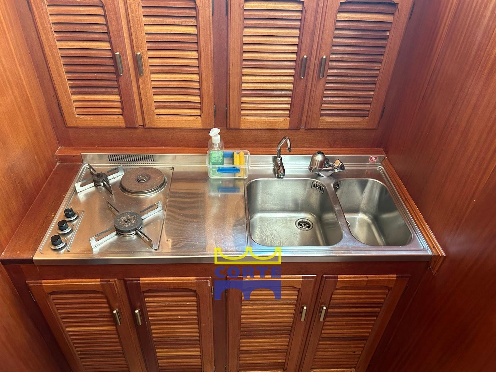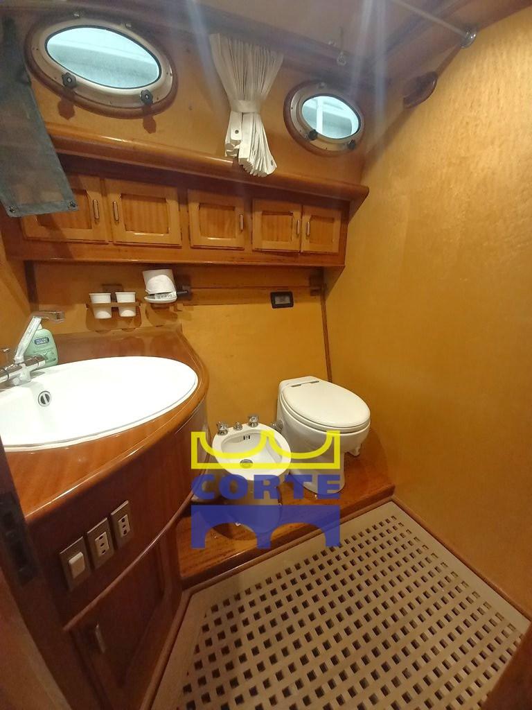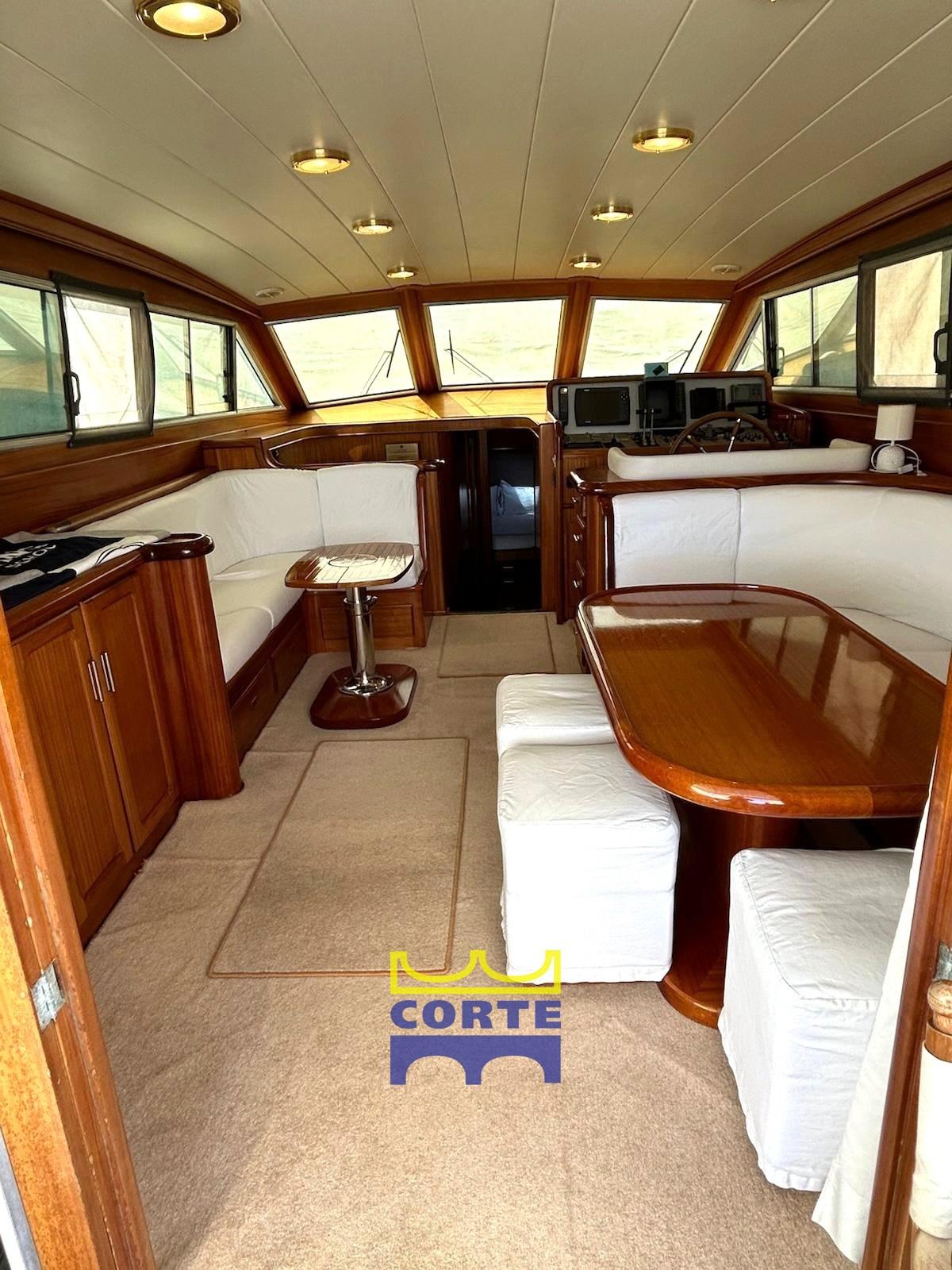 Engine Alarm, Bilge Alarm, Water pressure pump, Draining System, Teak Side Decks, Deck Shower, Twin Steering, Directional Spotlight, Hydraulic Flaps, Tender Crane (passerella idraulica), Fire Extinguishing System, Gangway (elettroidraulica), Platform (poppa in teak), Automatic Bilge Pump, Entry door, Teak Cockpit, Shorepower connector, Water harbor connector system, Electric Windlass, cockpit table (regolabile in altezza e movibile verso prua), Tender, Horn, 2 Stern Winches, Bow Winches.