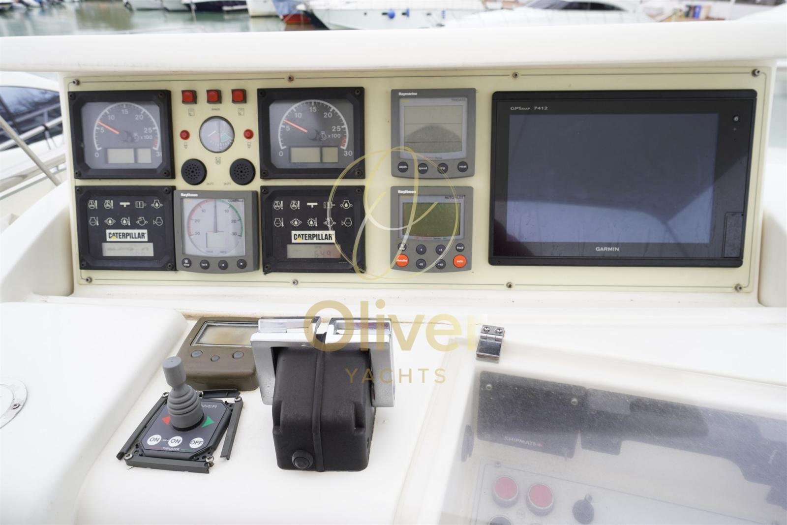 Rudder angle indicator, Radar Antenna, Electronic engine control, On-Board Computer (CAT), Chain counter, Odometer (Raytheon), chronometer, Display (Garmin), DSC vhf, GPS (Garmin), Consumption monitor, Chartplotter (Garmin), Plotter with GPS antenna (Garmin), Control panel, Radar (Furuno), VHF Radio (Shipmate), Co-pilot seat, Engine Measuring Instruments (CAT), Yacht controller.