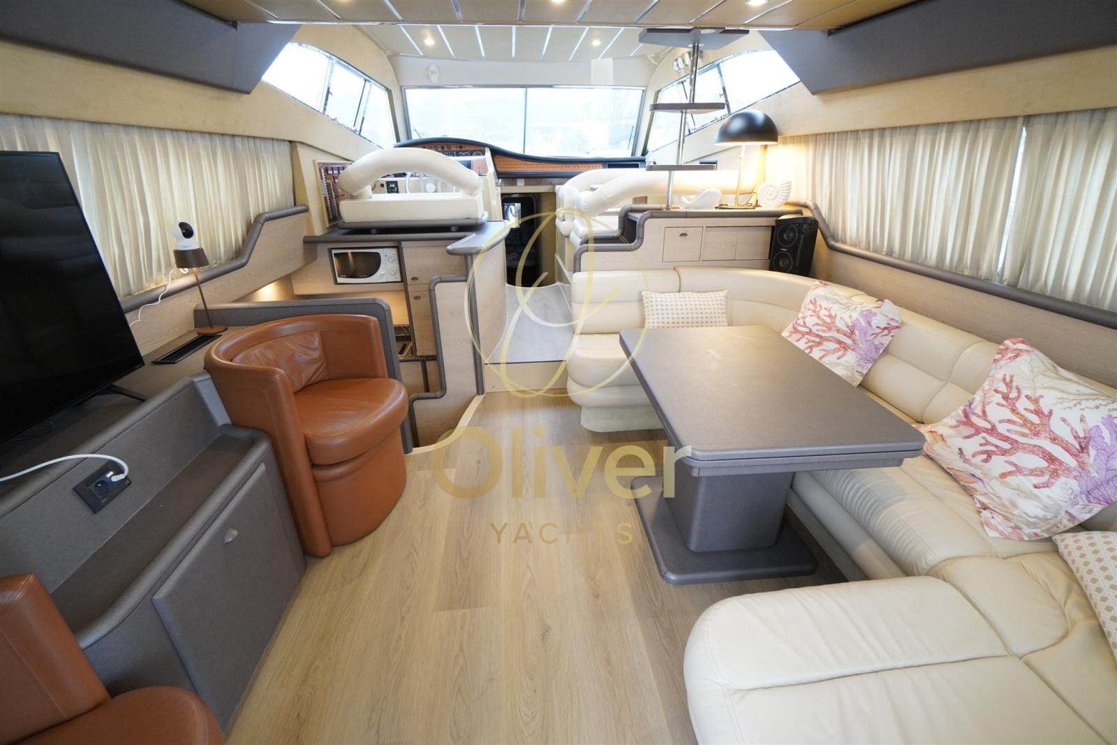 The interior of the Ferretti 530 is one of the main reasons why this model is so popular: brightness, volumes above the category and a design that combines elegance and functionality. As soon as you enter the saloon, you immediately feel that you are on a superior yacht. The new wooden floor installed in 2025 gives freshness and a contemporary look to the room.