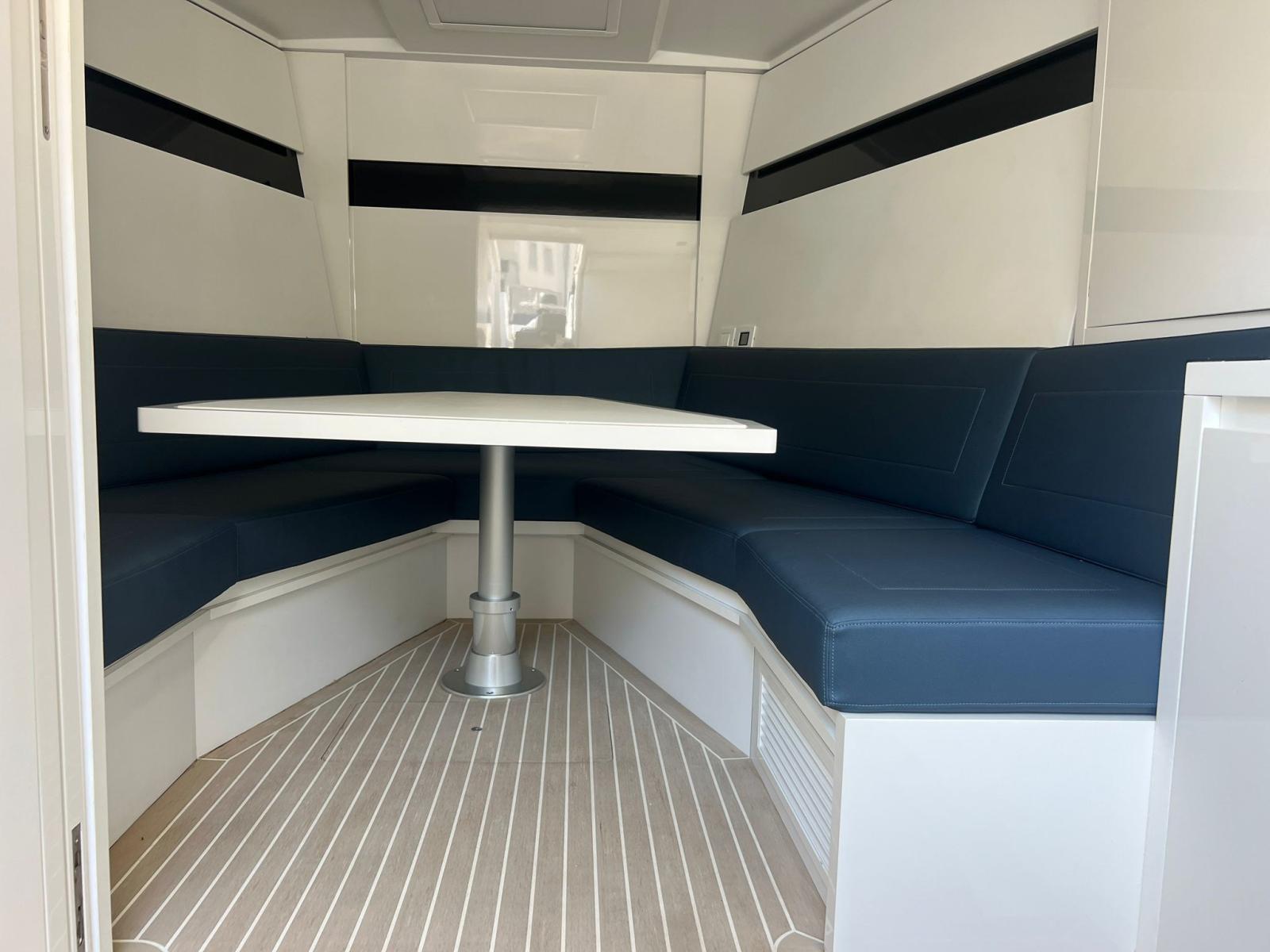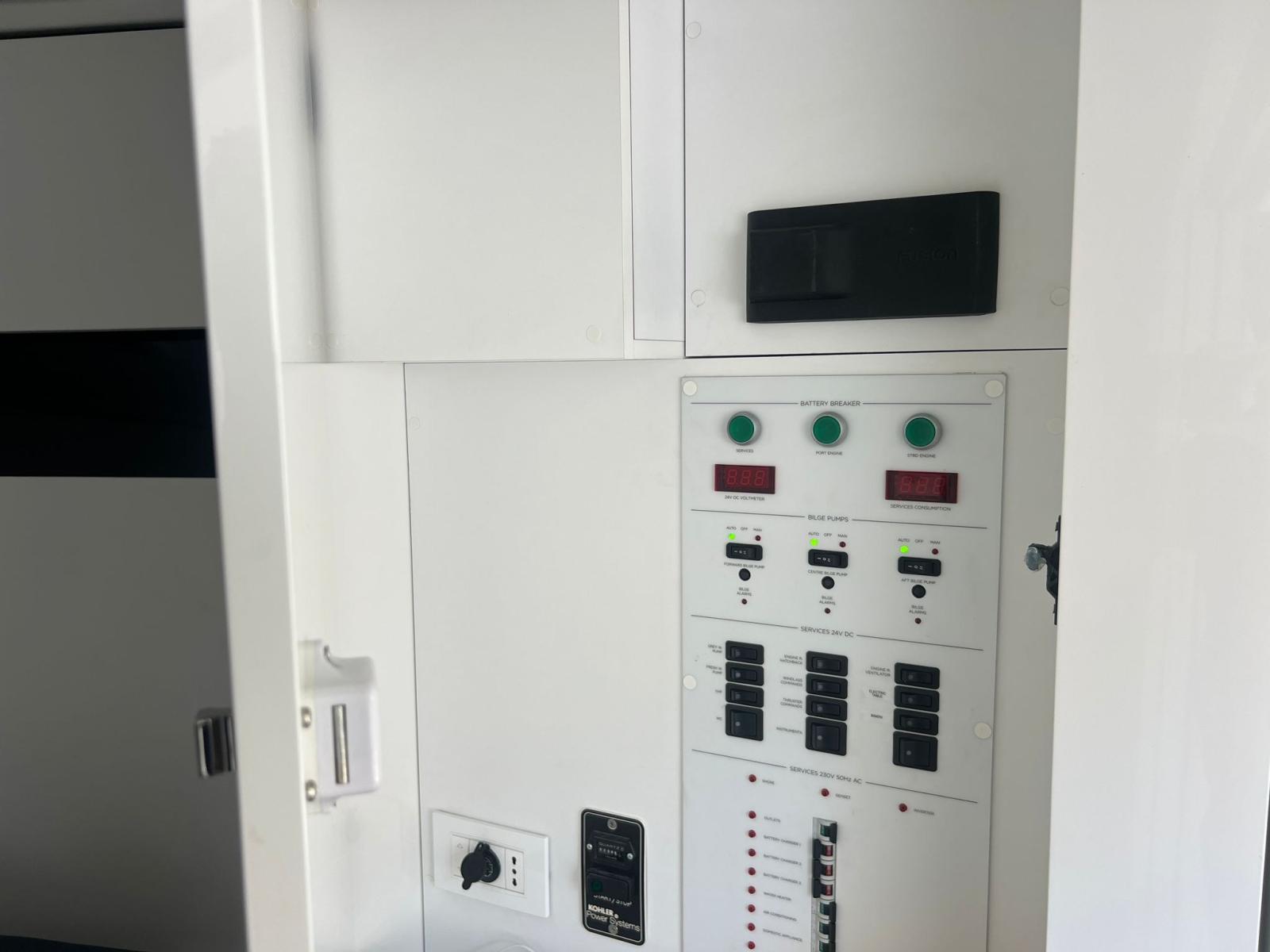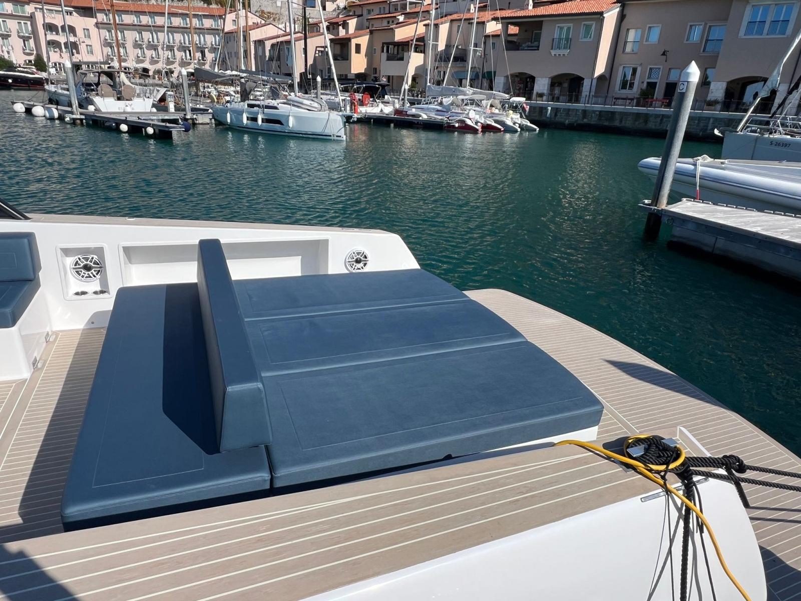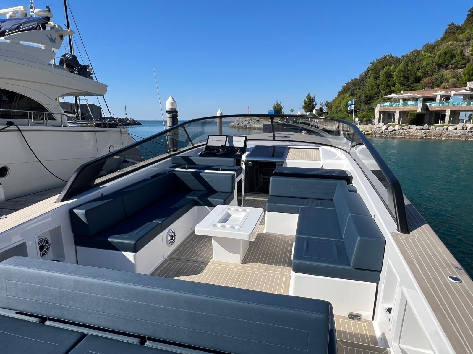 Engine Alarm, Bilge Alarm, Alternator, Anchor (50 M CATENA), Water pressure pump, Auto-Trim (VOLVO TRIM ASSIST), Folding cleats, Teak Side Decks (FLEXITEEK), Deck Shower, Fire Extinguishing System, 8 Fenders, Platform (MAGGIORATA CON SISTEMA SALI SCENDI), Automatic Bilge Pump, Manual Bilge Pump, Teak deck (FLEXITEEK), Teak Cockpit (FLEXITEEK), Shorepower connector, Electric Windlass, swimming ladder, Living Room Foldable Table.
