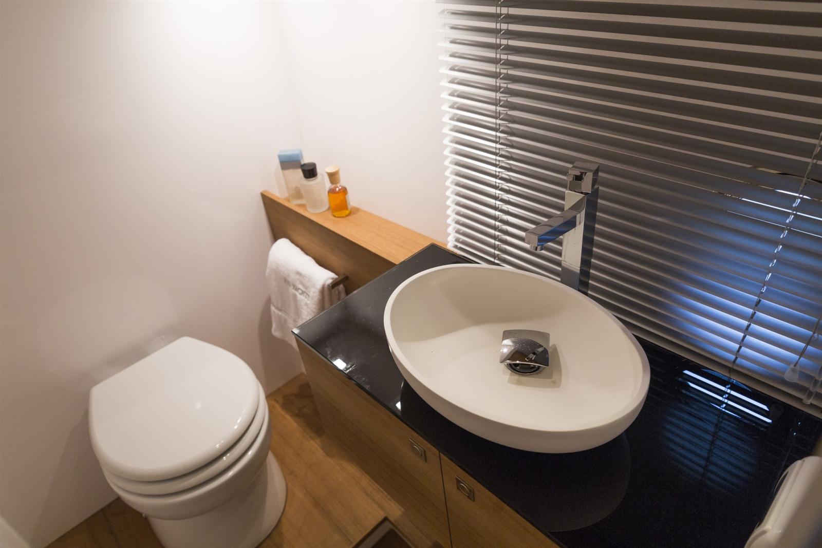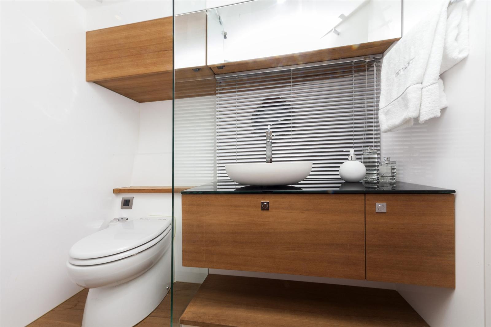 The two private bathrooms are also well-equipped, ensuring privacy and convenience for all passengers. High-end finishes and smart layout contribute to creating an elegant and functional interior space.