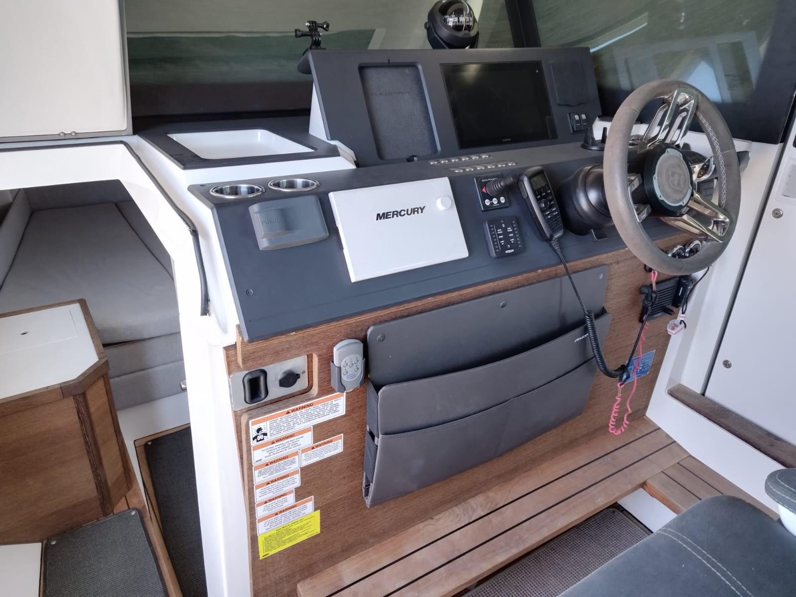 Was sold new to the current owners in March of 2019 and is exceptionally well optioned and equipped with very low hours on her twin 350 Mercury V6 Verado's, Brabus Premium Package and attractive grey hull.