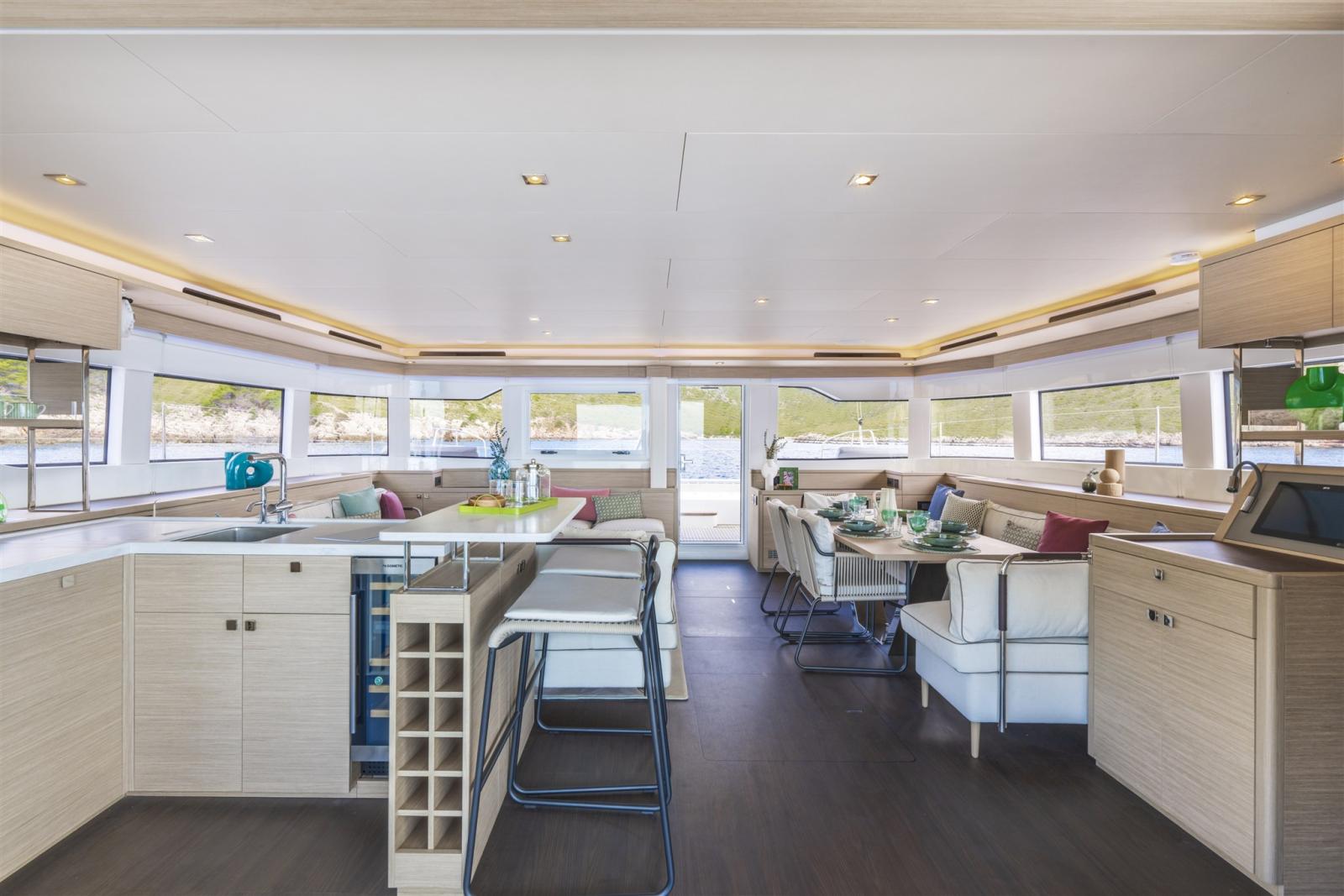 The interior of the Lagoon 60 is comfortable and inviting. The model is available with four or five cabins. The four-cabin version has a bar in the salon and a kitchen below. In the five-cabin version, the kitchen is placed in the salon and the bar is omitted. Almost all living areas are accessible from the salon: the aft deck, foredeck and all cabins.