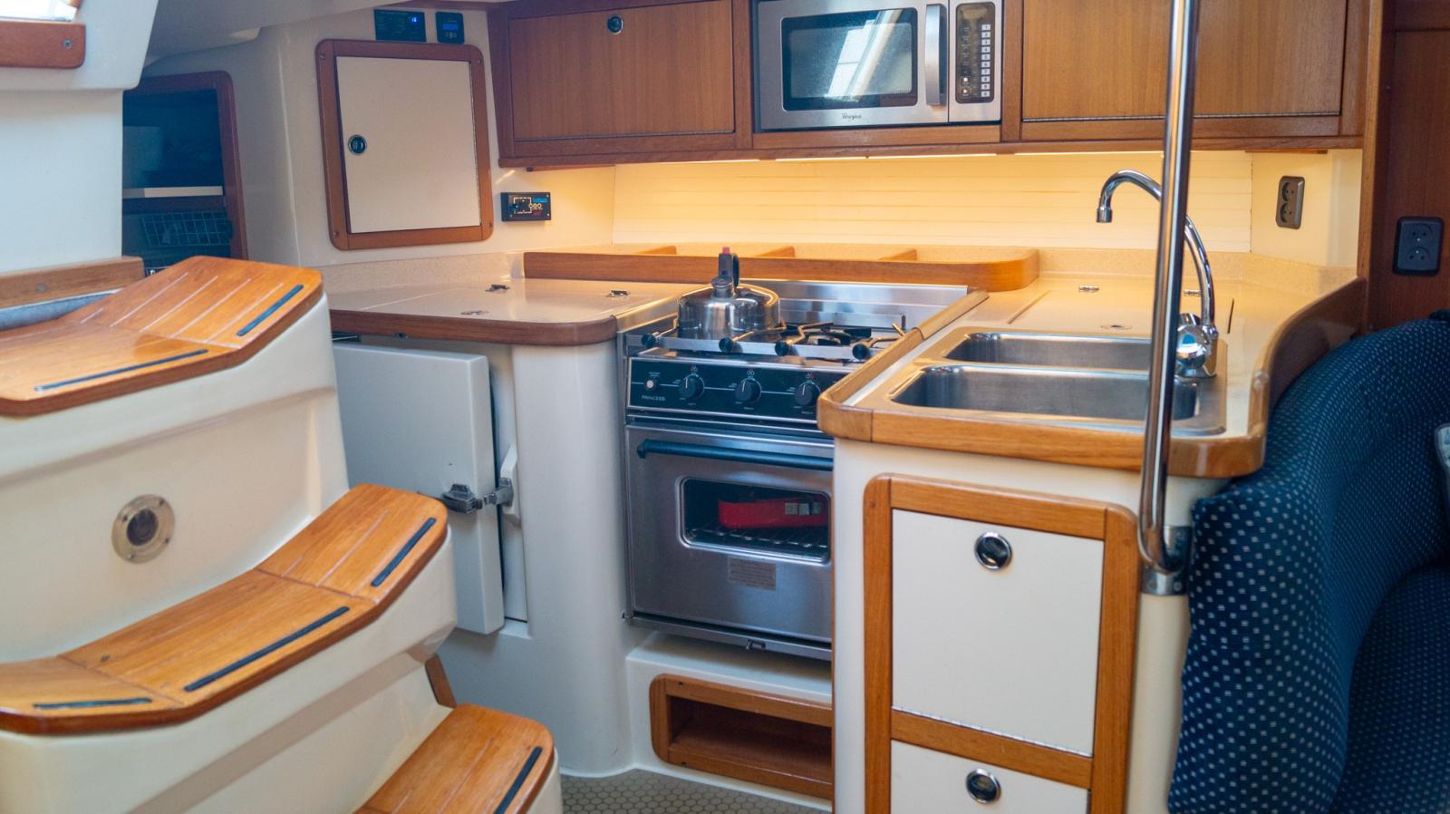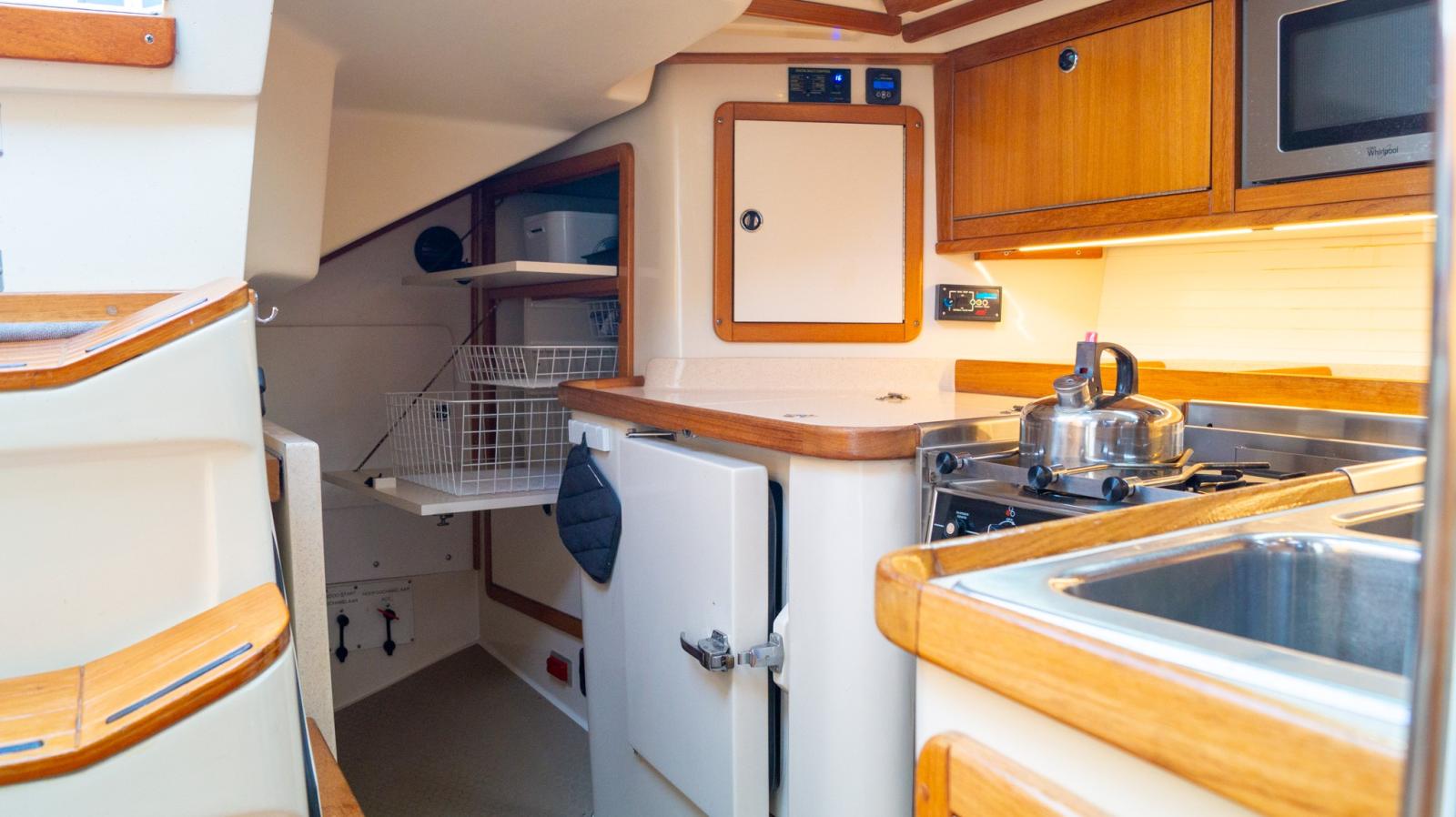Galley (Met unieke stahoogte), Burner (Gasfornuis 3-pits gas slangen en regelaar vervangen (2022)), Refrigerator (Ruime koelkast op gas), Mechanical Refrigerator, Microwave Oven ((2017)).