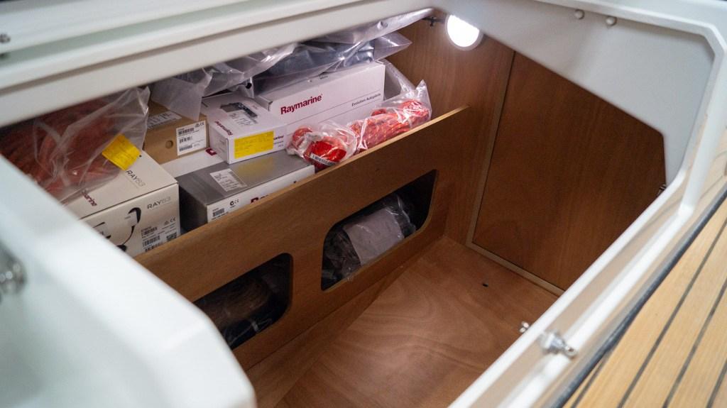 Anchor (16kg Delta anker), Selftailing winch, Batteries (2x 100 Ah), Battery charger (40Ah), Shore power cable, Guard rail, Safety rail, Deck Shower, Anchor mount (Lijn en ketting), Battery Monitor, Fenders, Platform (Uitklapbaar zwemplatform), Manual Bilge Pump, Shorepower connector, Electric Windlass, Gang Board (Unieke doorlopende gangboorden), cockpit table, Windex (Windex 15).