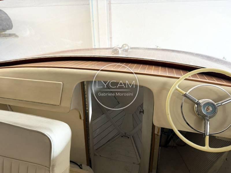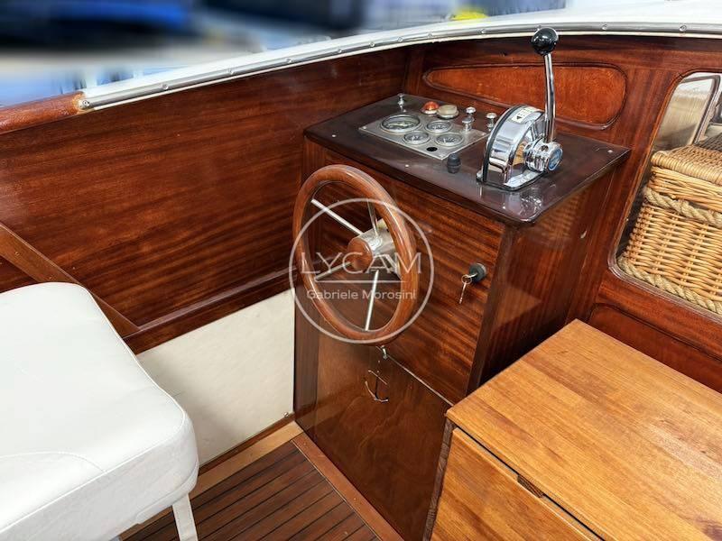 Wooden rudder wheel; Engine throttle; Engine indicators (fuel level, engine rpm, ammeter, oil pressure, water temperature indicator); Inner rudder wheel