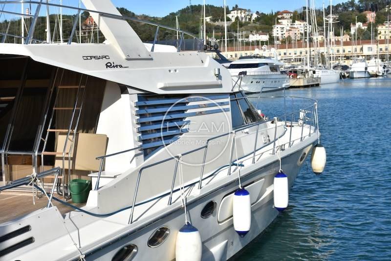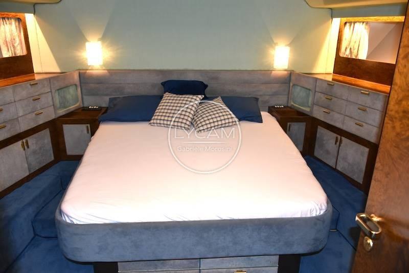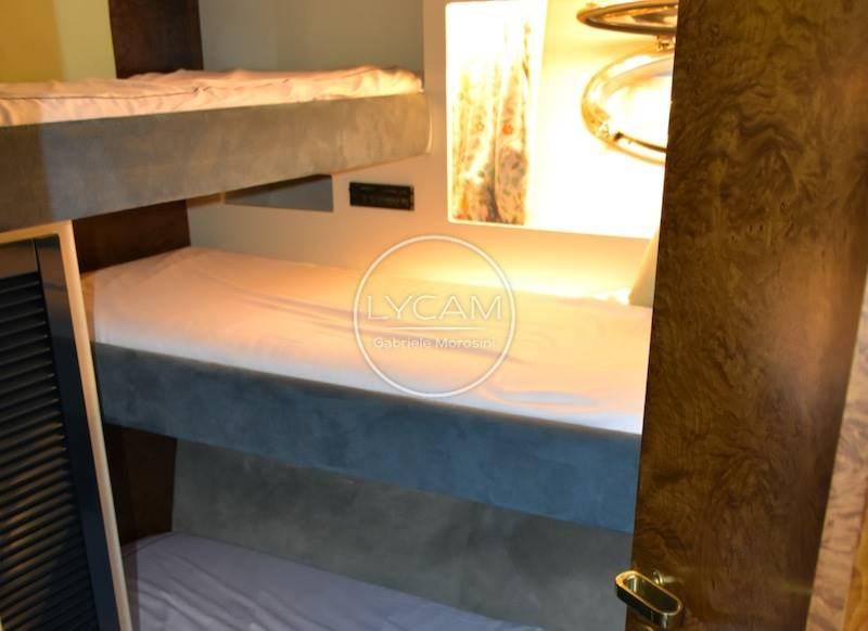 Adjustable air conditioning / heating in every room; Safe; Automatic bilge pumps; Double battery charger, one for the 12v circuit and one for 24v; Battery disconnect; Automatic fire extinguishing system; Onan 25kw generator; Watermaker; Autoclave; Boiler; Electric windlass with winch function; Refrigerators; Bow thruster; Crew cabin; Wipers; Stern platform with swim ladder and shower; Double boiler with independent control One of 40 lt. And one of 60 liters; Safe; black water system; inverters, electrical outlets 220V 12V 24V; electric toilets; kitchen freezer; kitchen refrigerator; living room minibar; living room fridge; Bosch glass-ceramic plate; Bosch traditional multi-purpose oven and microwave; cockpit outdoor shower, bow sundeck outdoor shower; hydraulic flaps; two electric davits for lifting stainless steel tenders; chain washing; Besenzoni Futura hydraulic gangway; Platform; manual and automatic bilge pumps; new sea intakes; stainless steel entrance door, teak cockpit; shore water intake; winch at the stern.